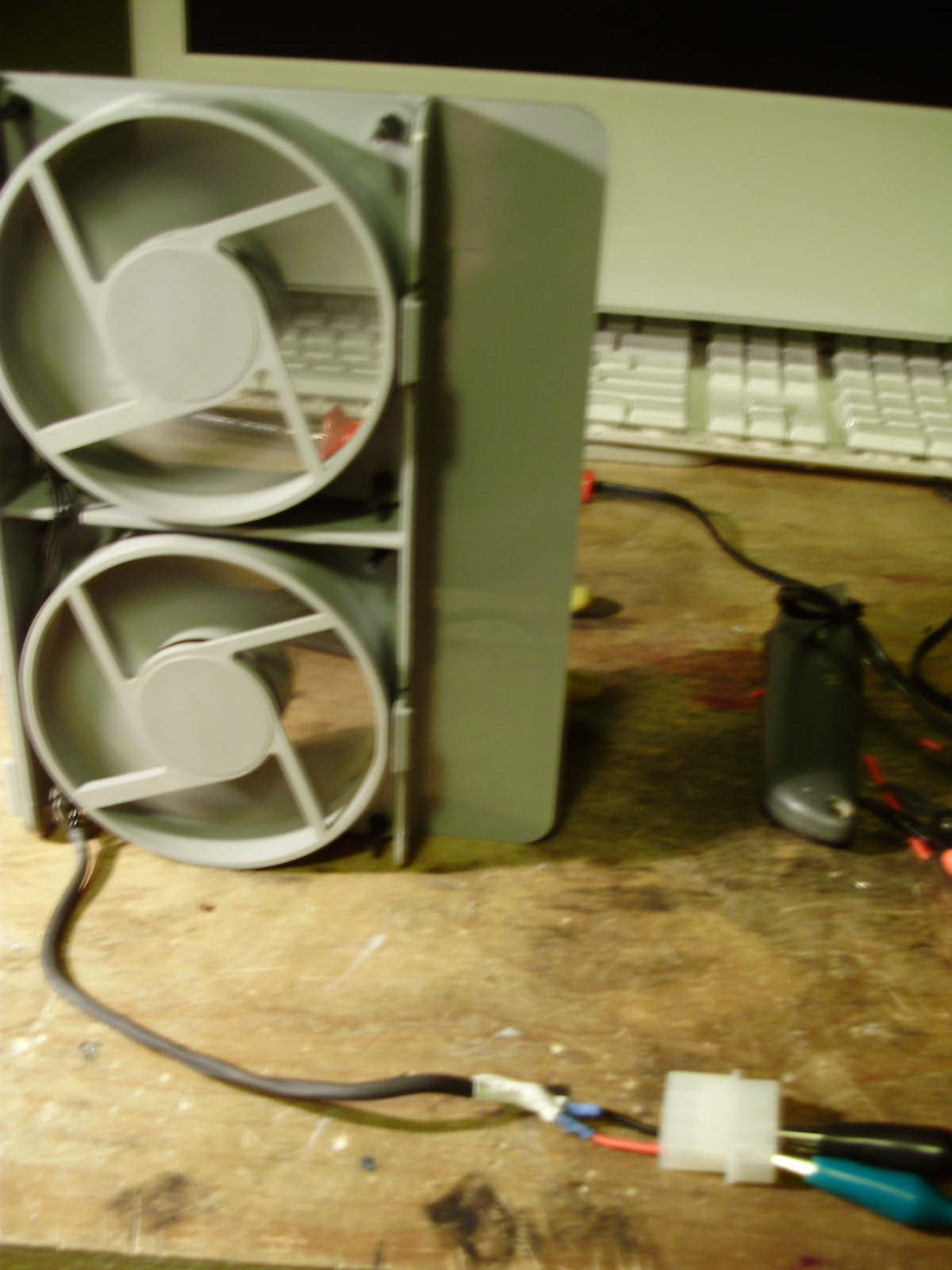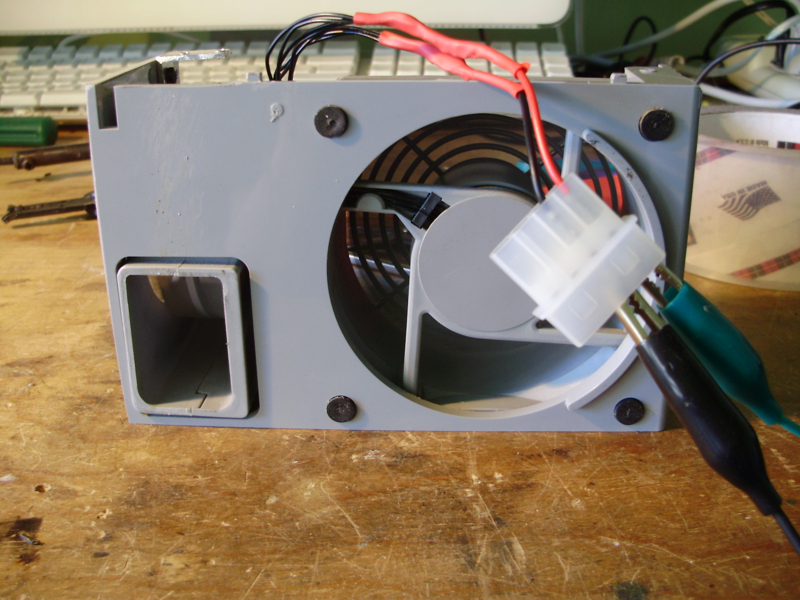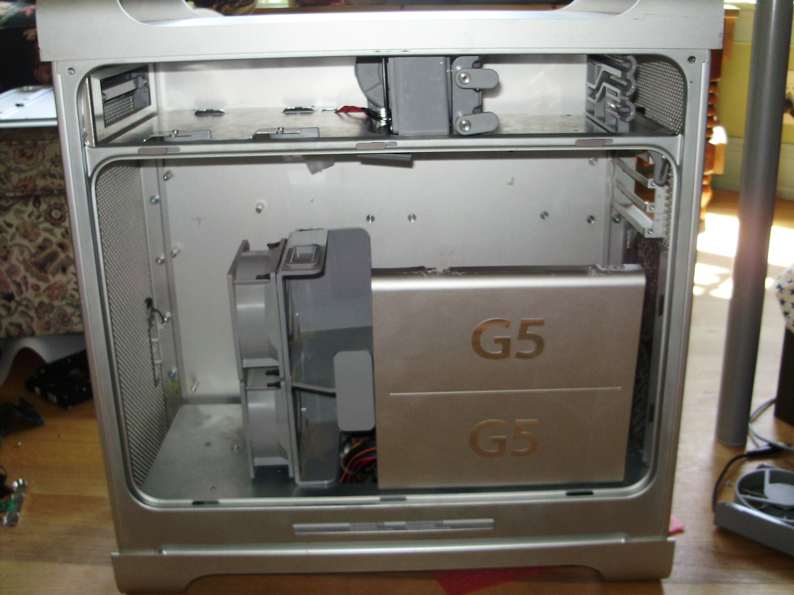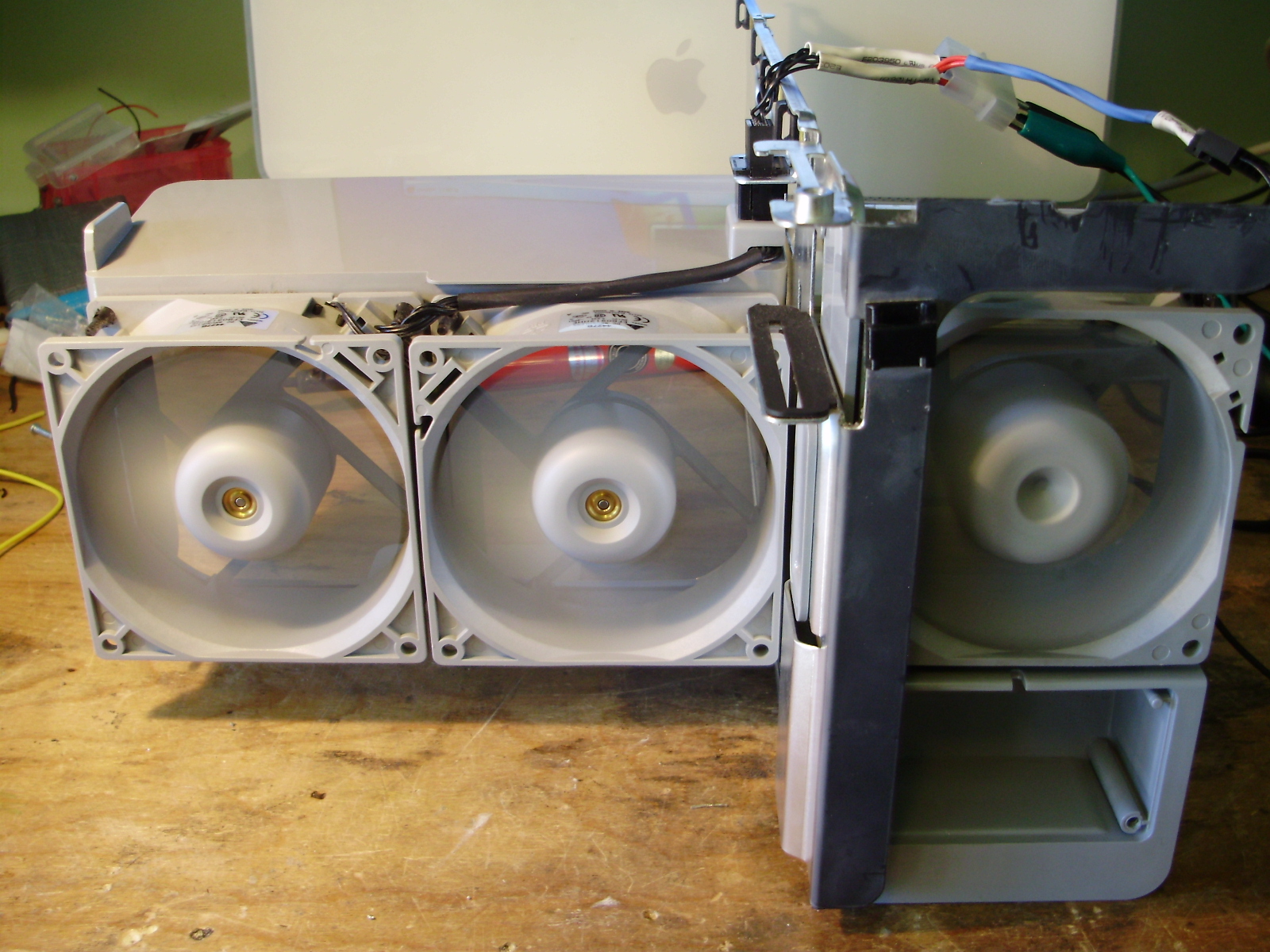Since I wanted to keep the original internal look of the G5, I rewired all the stock fans to fit standard Molex connectors. All fans run of 5V, since they sound like leaf blowers at 12. I used wiring diagrams found HERE. For the front pair of fans, I reused the slide-in plug, so the fans can be hot-swapped.