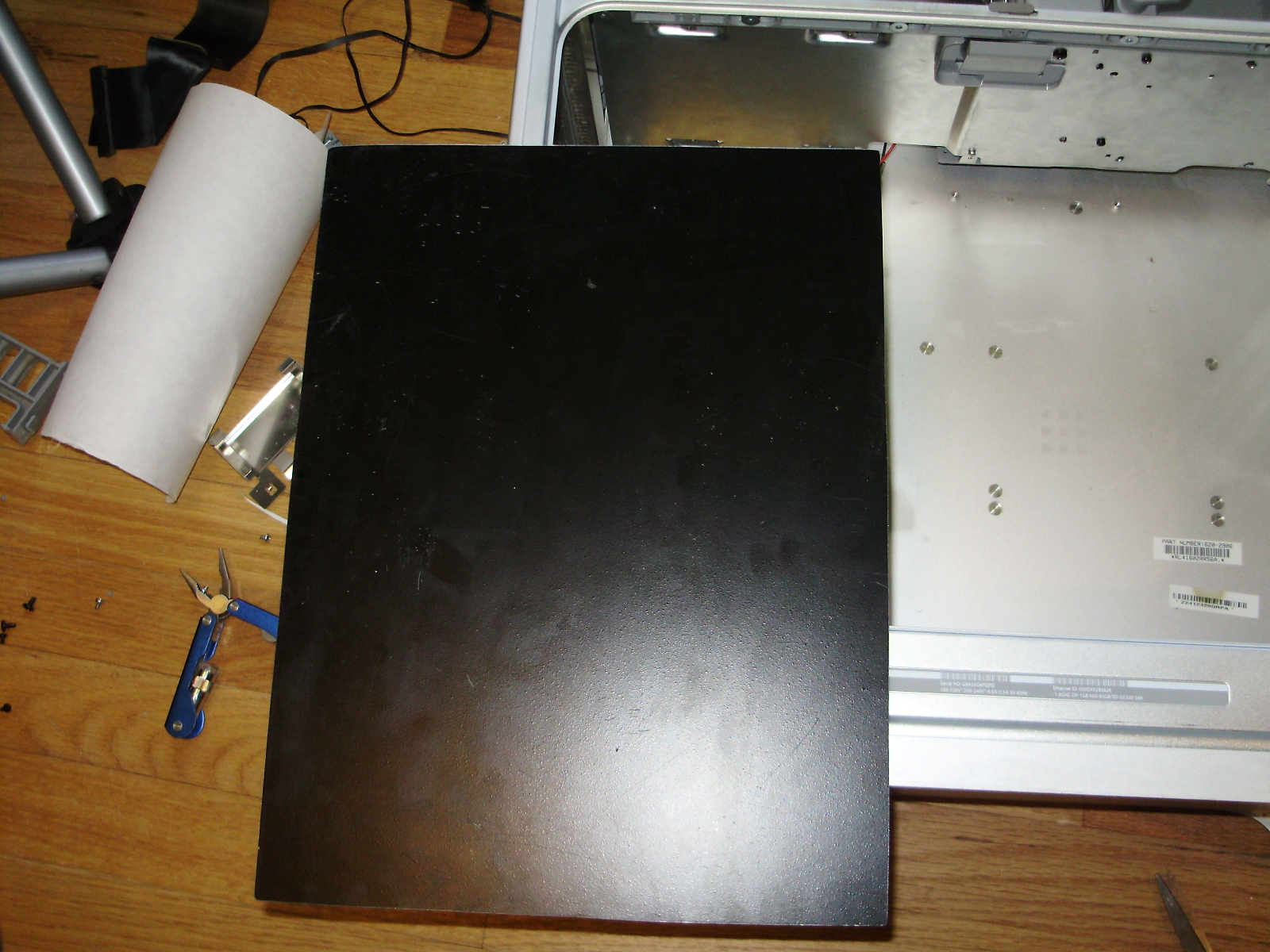 Because the stock G5 PSU is much longer and shorter than an ATX one, mounting the power supply was one of the most difficult parts of this project. Also, the front fans and the CPU cover both mount to the bottom divider, which is screwed directly into the stock power supply. To fit an ATX one but keep the bottom divider, I cut a hole in both the divider and the casing of the original power supply. I then added an aluminum bracket which the PSU can be screwed to on one side using a thumb screw. The other side of the power supply is fixed down with a neodymium magnet I glued to the bottom of the stock PSU. If you happen to have to glue a strong magnet, remember not to used JB Weld, as it has steel in it. The glue is attracted to the magnet, so it flows around the magnet and tries to coat the outside of the magnet evenly.