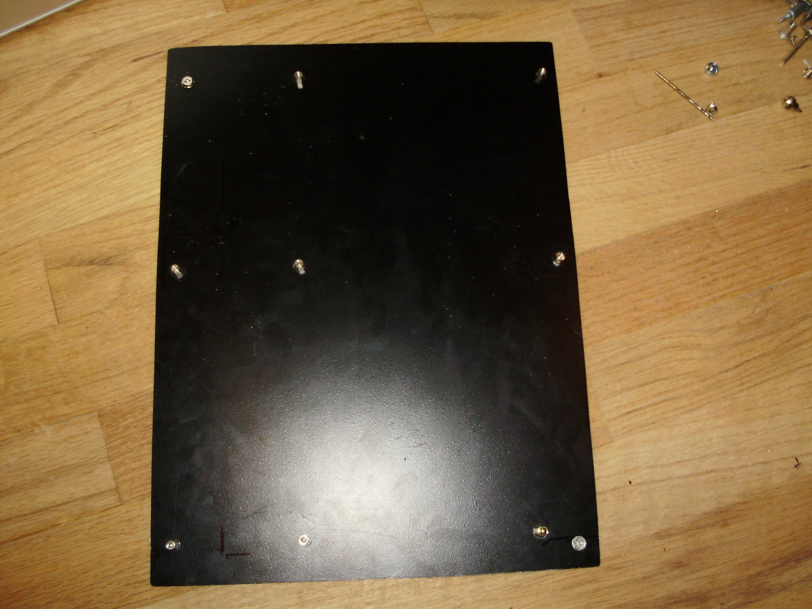 I cut out the original back panel, and mounted the new one with hex screws: