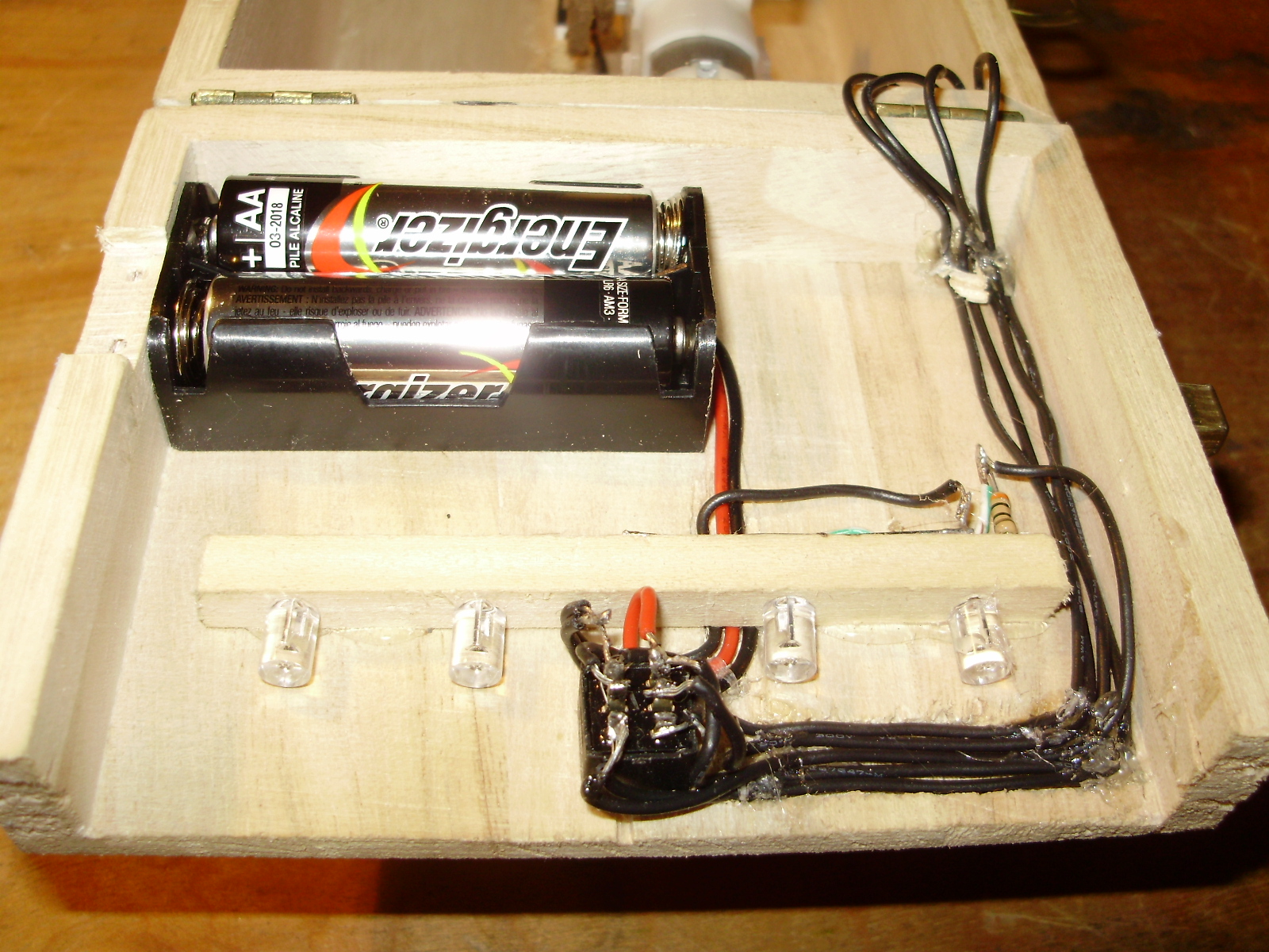 I built three "Useless Machines" within the last few months, and here are two of them. I made one for my younger sister to decorate and give to her science teacher, and the other out of leftover parts I had. The circuits of both have been modified from the standard circuit to include an LED strip. The LED's are wired through the bumper switch, so they only light up when the box is open and the arm is moving.