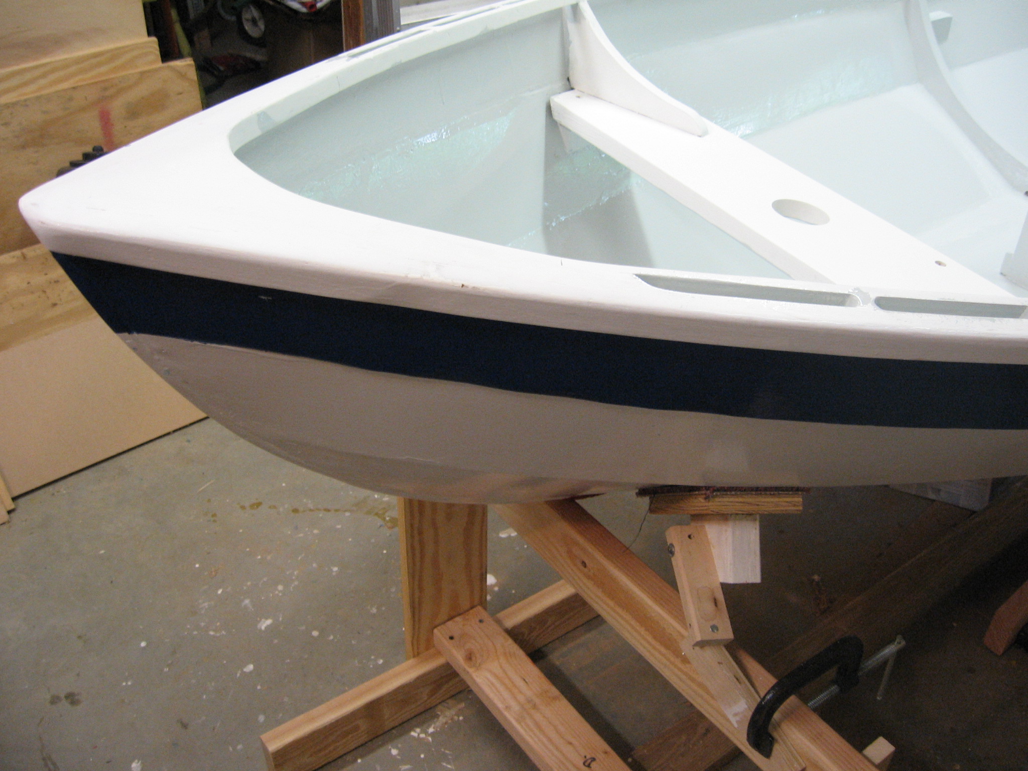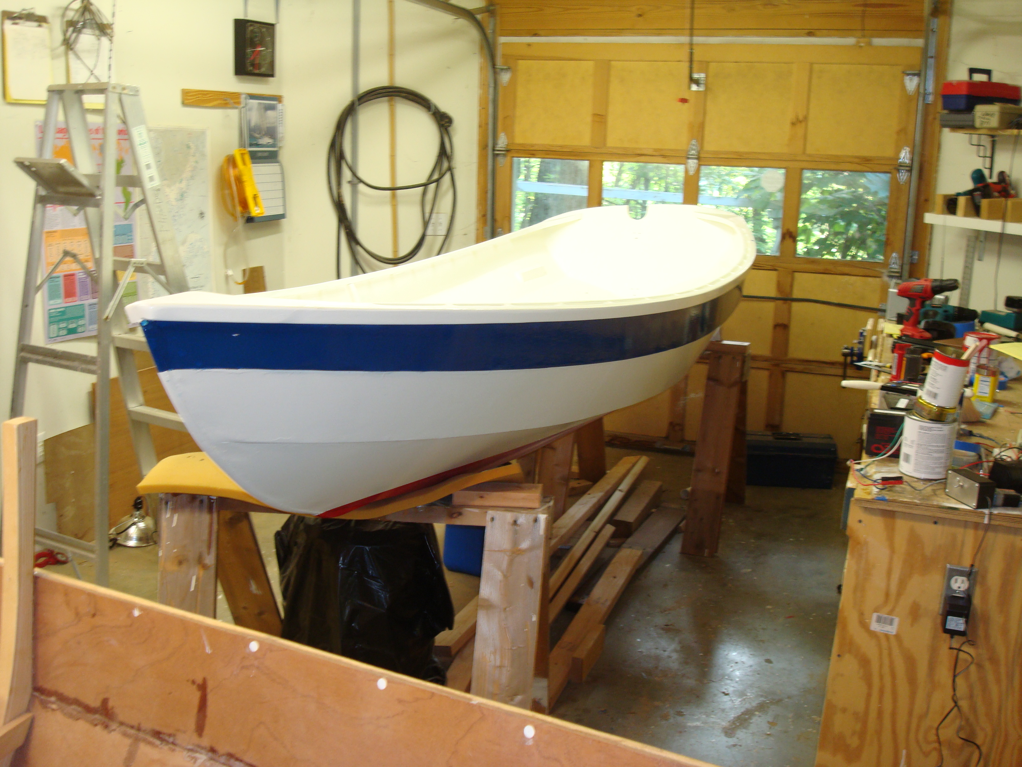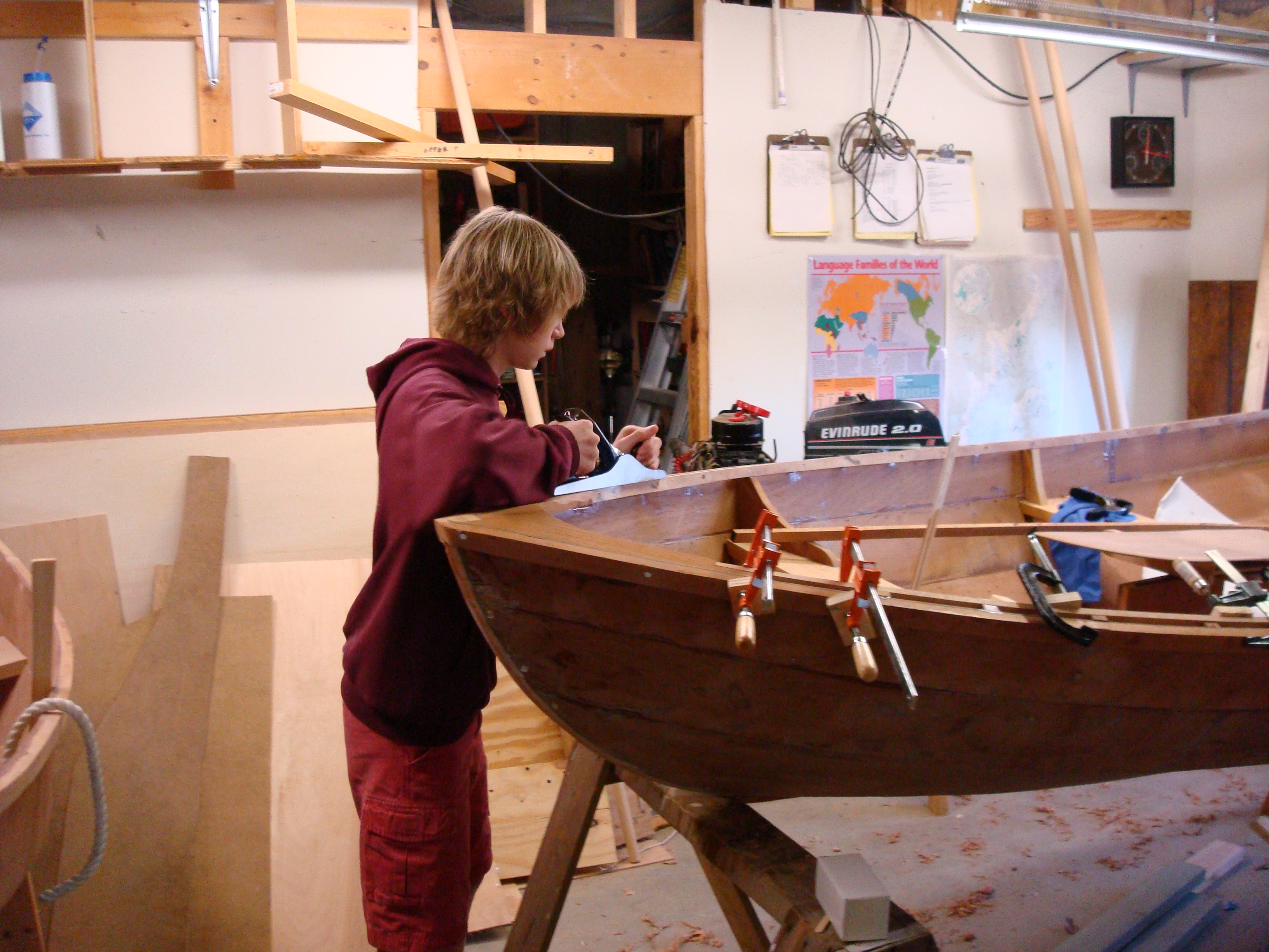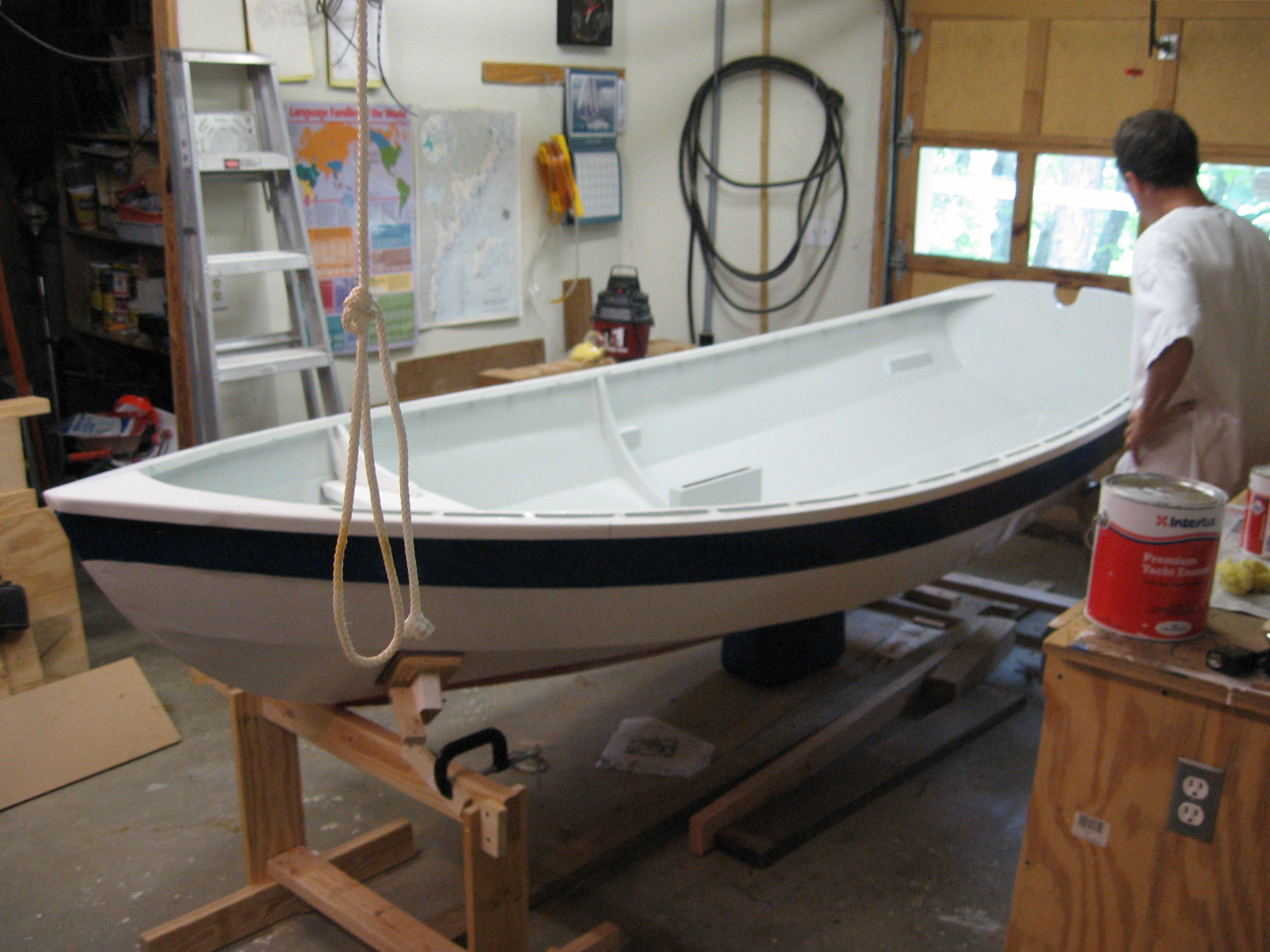 Back in the summer of 2007, I went to the Wooden Boat School in Maine with my granddad, and we took the Build a Shellback Dinghy class. We made very slow progress on the boat after that, and it is only now finished. The boat is made out of marine mahogany plywood, and it is just over 11 feet long. It has a mast, spars and sail in addition to oarlocks, but they do not fit on the boat in my granddad's indoor wood shop.