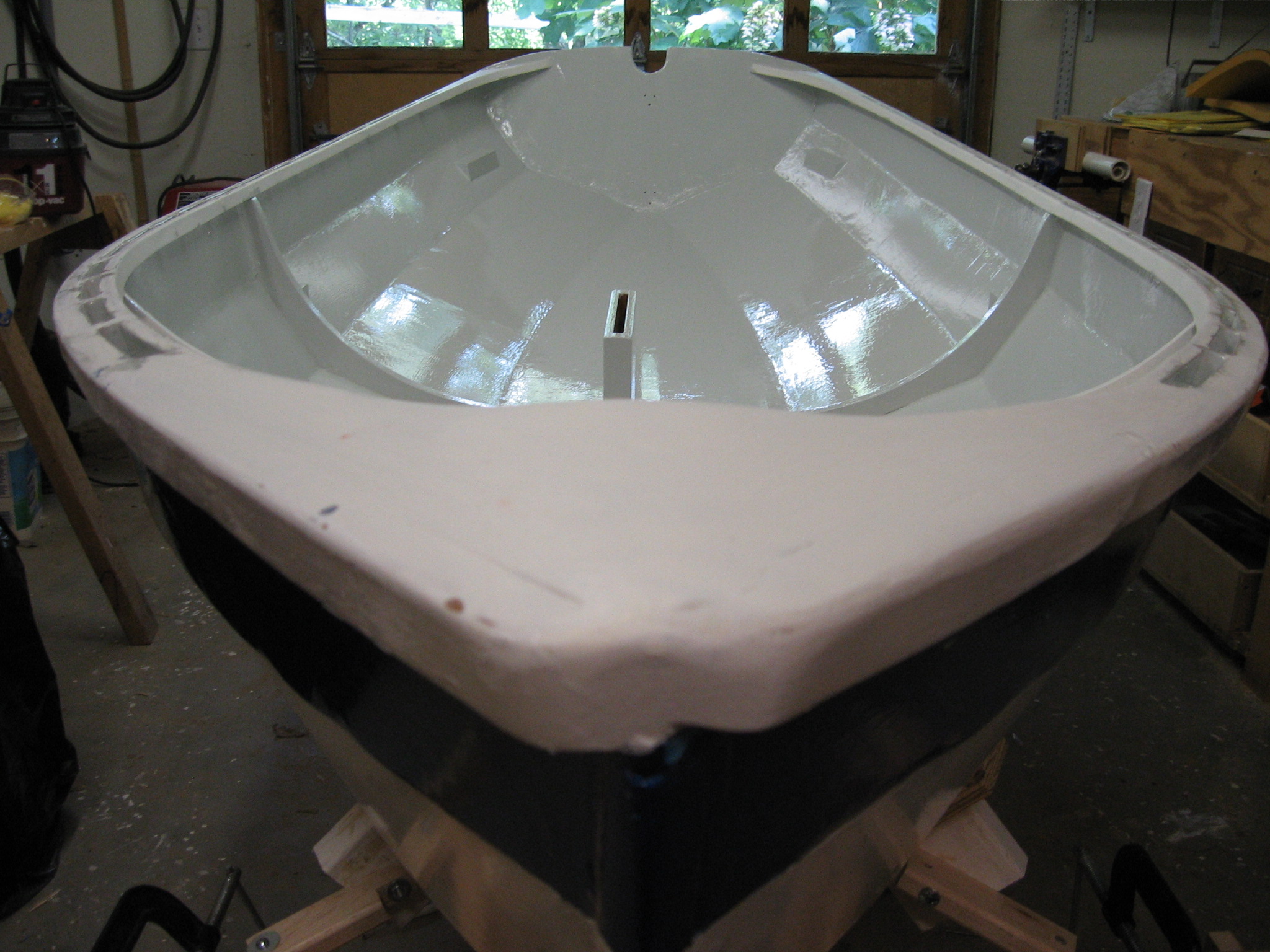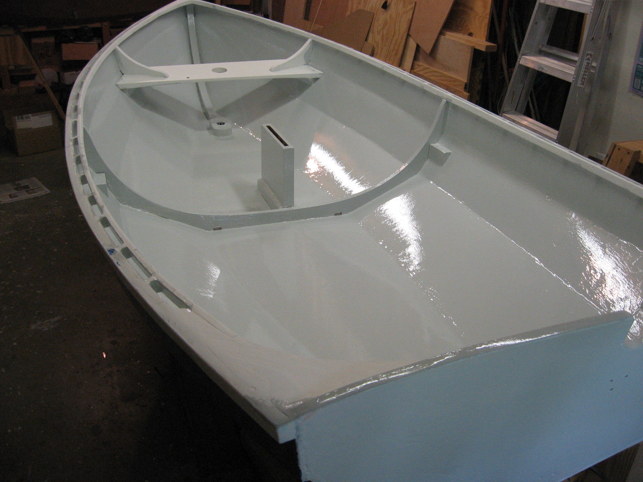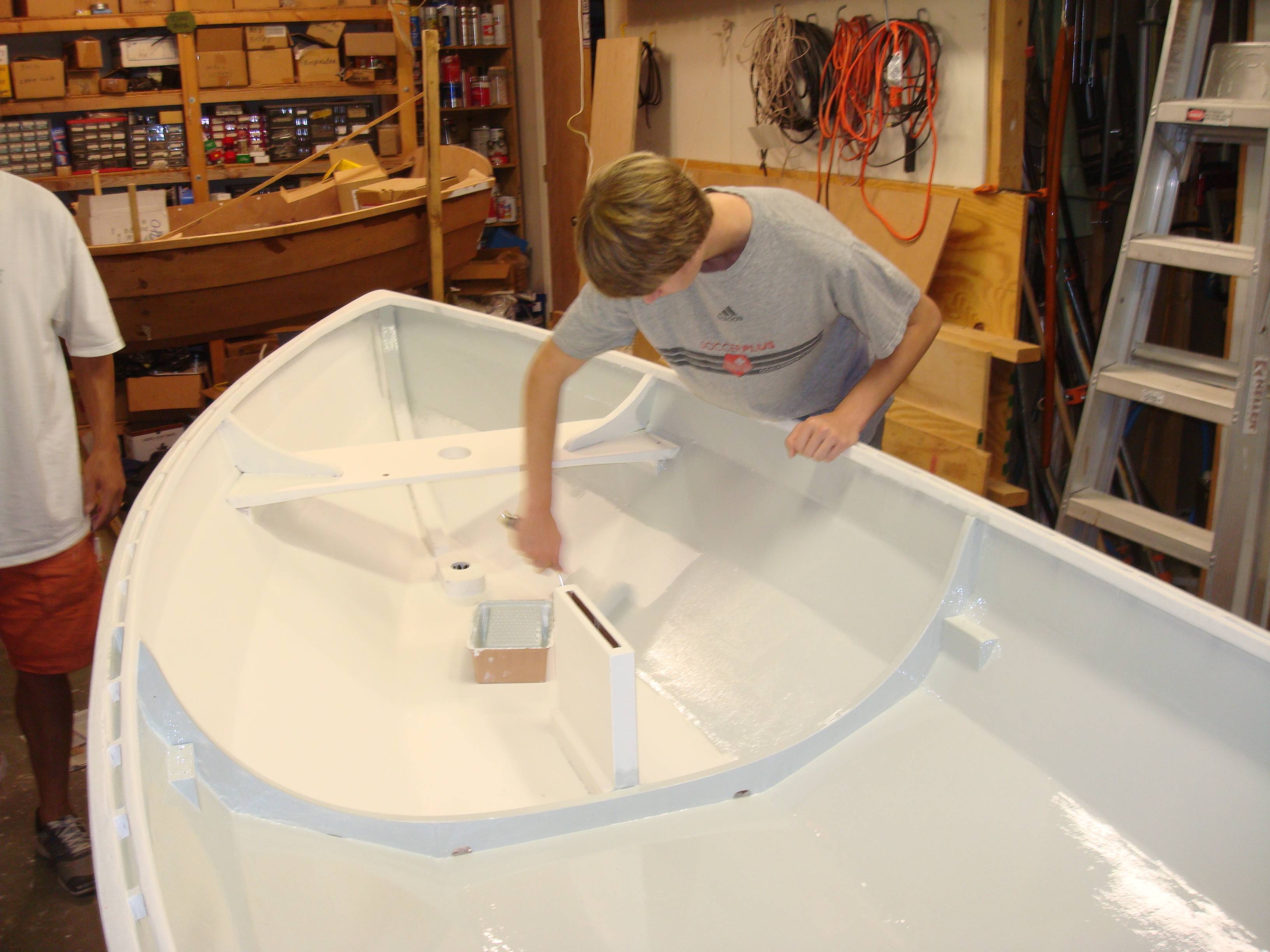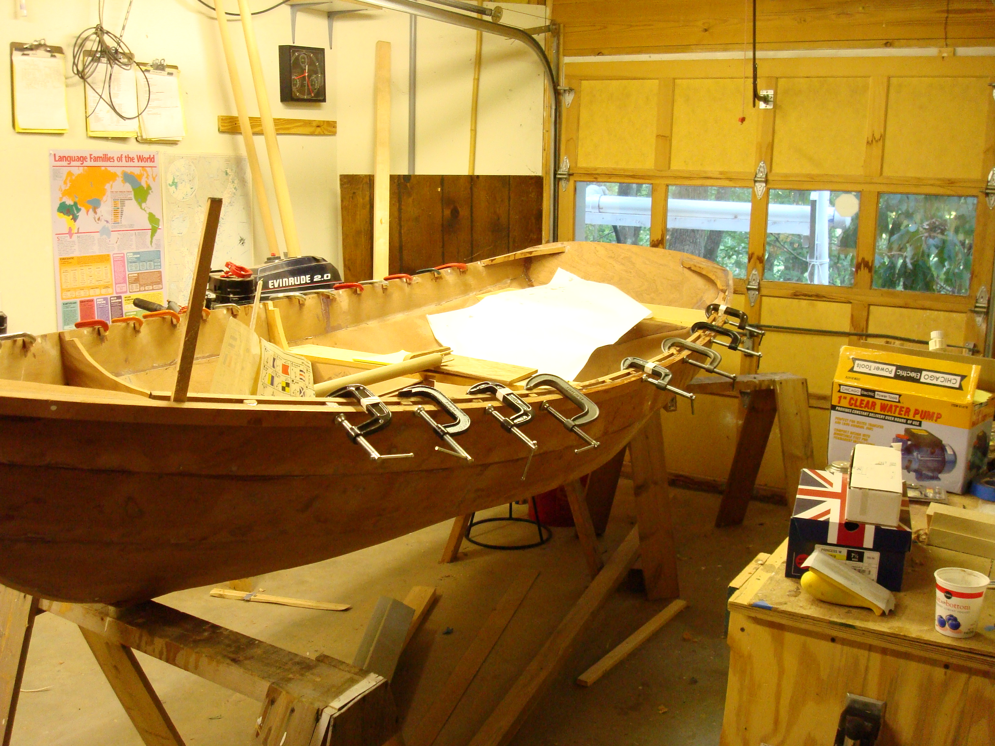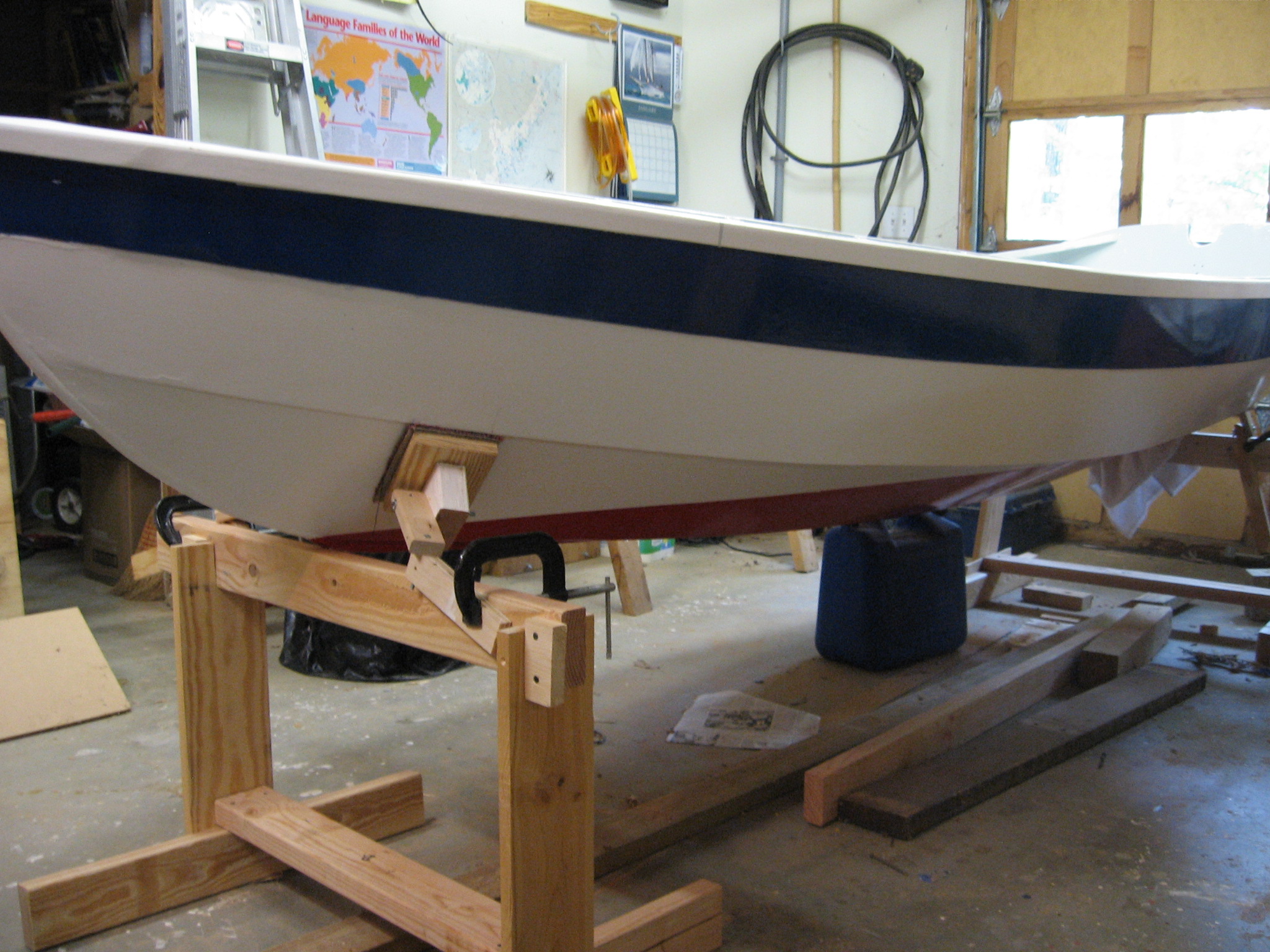 Back in the summer of 2007, I went to the Wooden Boat School in Maine with my granddad, and we took the Build a Shellback Dinghy class. We made very slow progress on the boat after that, and it is only now finished. The boat is made out of marine mahogany plywood, and it is just over 11 feet long. It has a mast, spars and sail in addition to oarlocks, but they do not fit on the boat in my granddad's indoor wood shop.