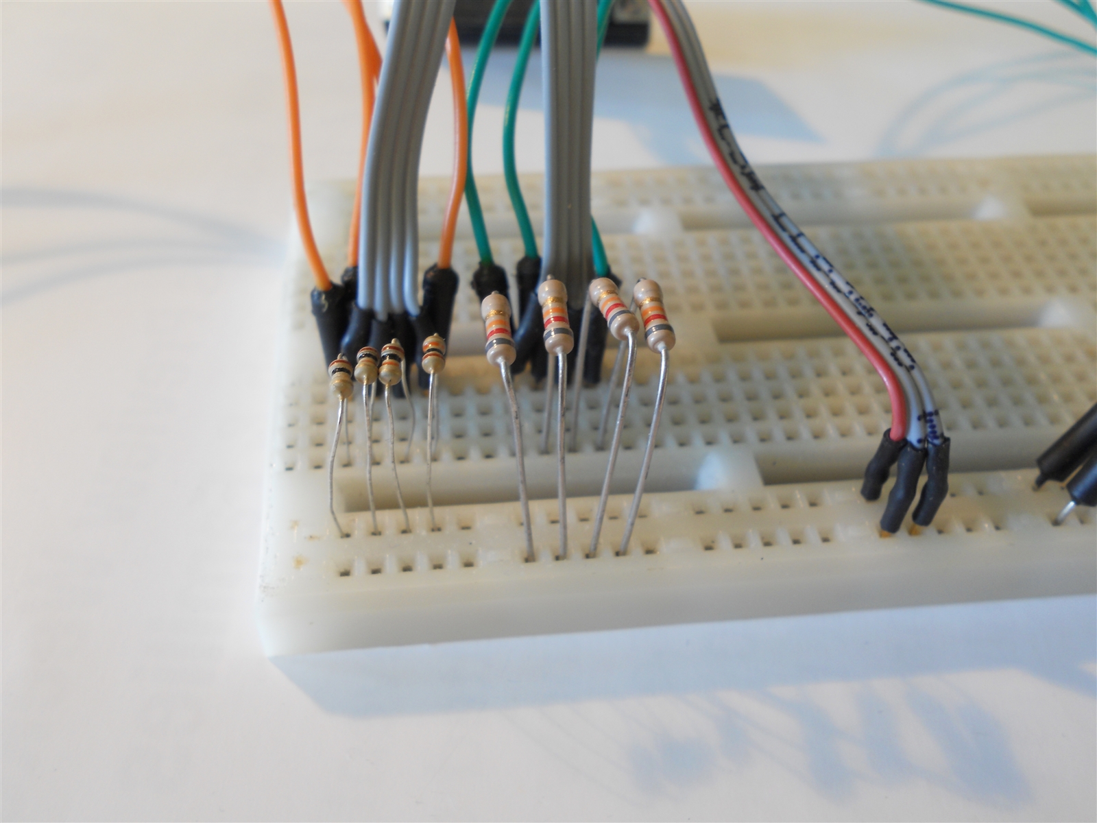 In the picture below, orange jumpers are analog, green digital, and the two at the bottom are for 5V and ground: