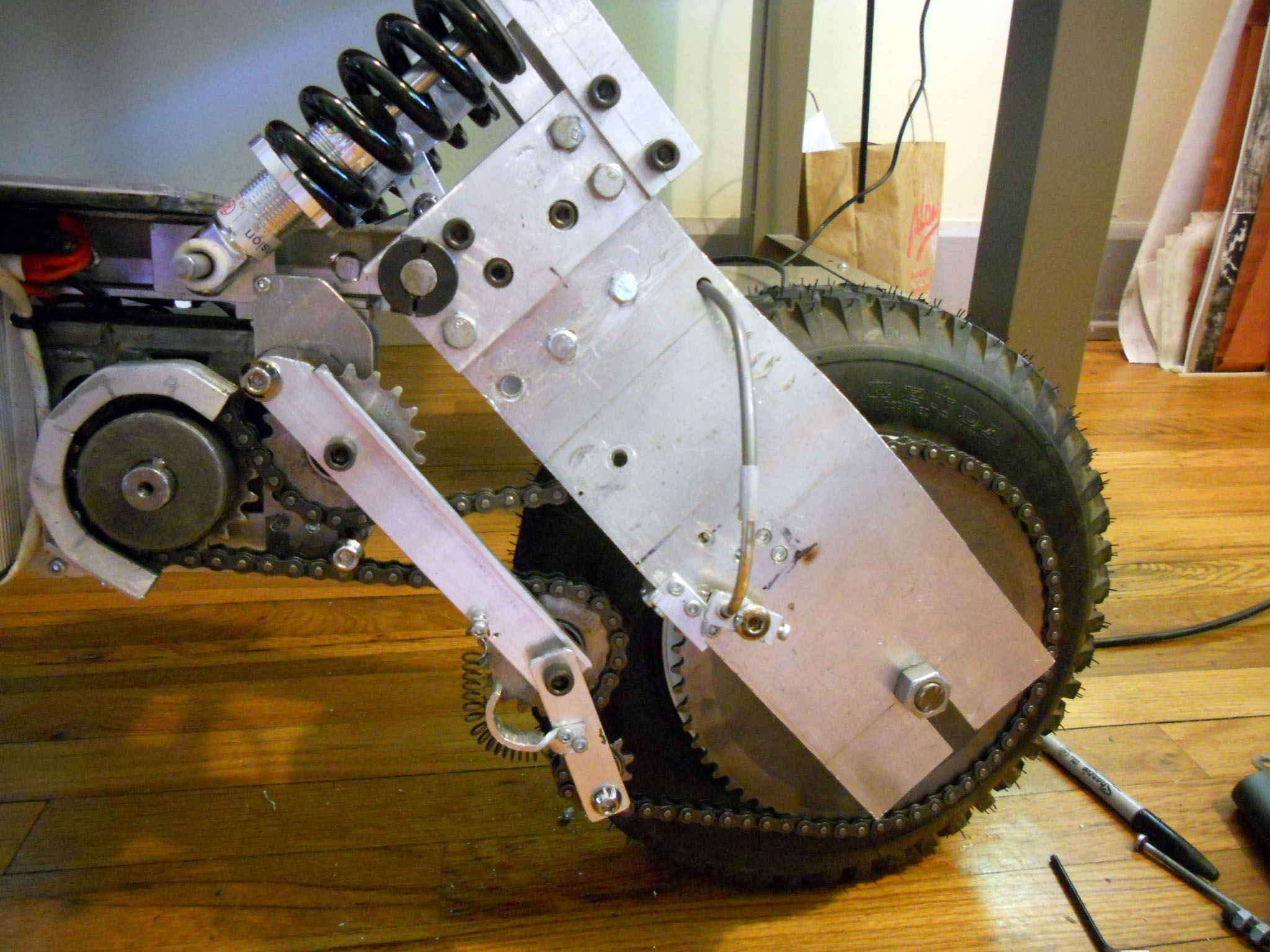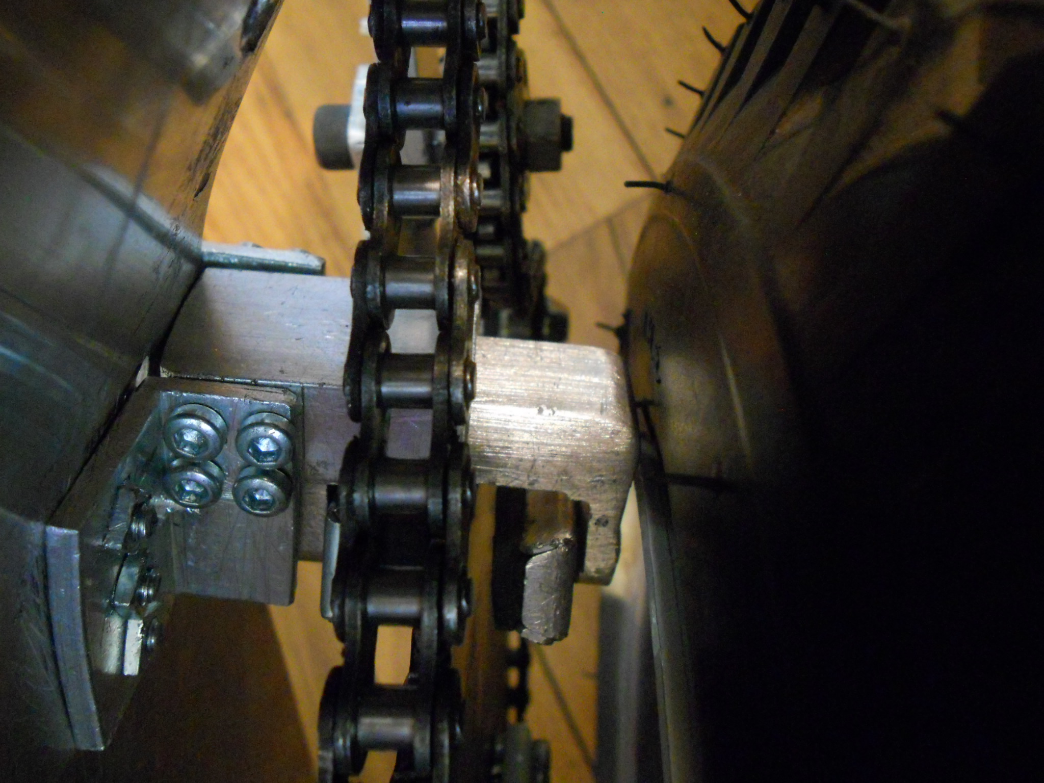 To (hopefully) fix these problems, I completely redid the chain tensioner and idler sprocket arrangement. As far as I can tell, there is no way for the chain to come of either the idler or drive sprockets without either breaking the chain or bending the idler mounts. The idler is now fixed to the gearbox, so it does not move with the suspension, as it did in the previous configuration. Also, the pin below the idler prevents the chain from disengaging the teeth, even when there is slack in the top of the chain.