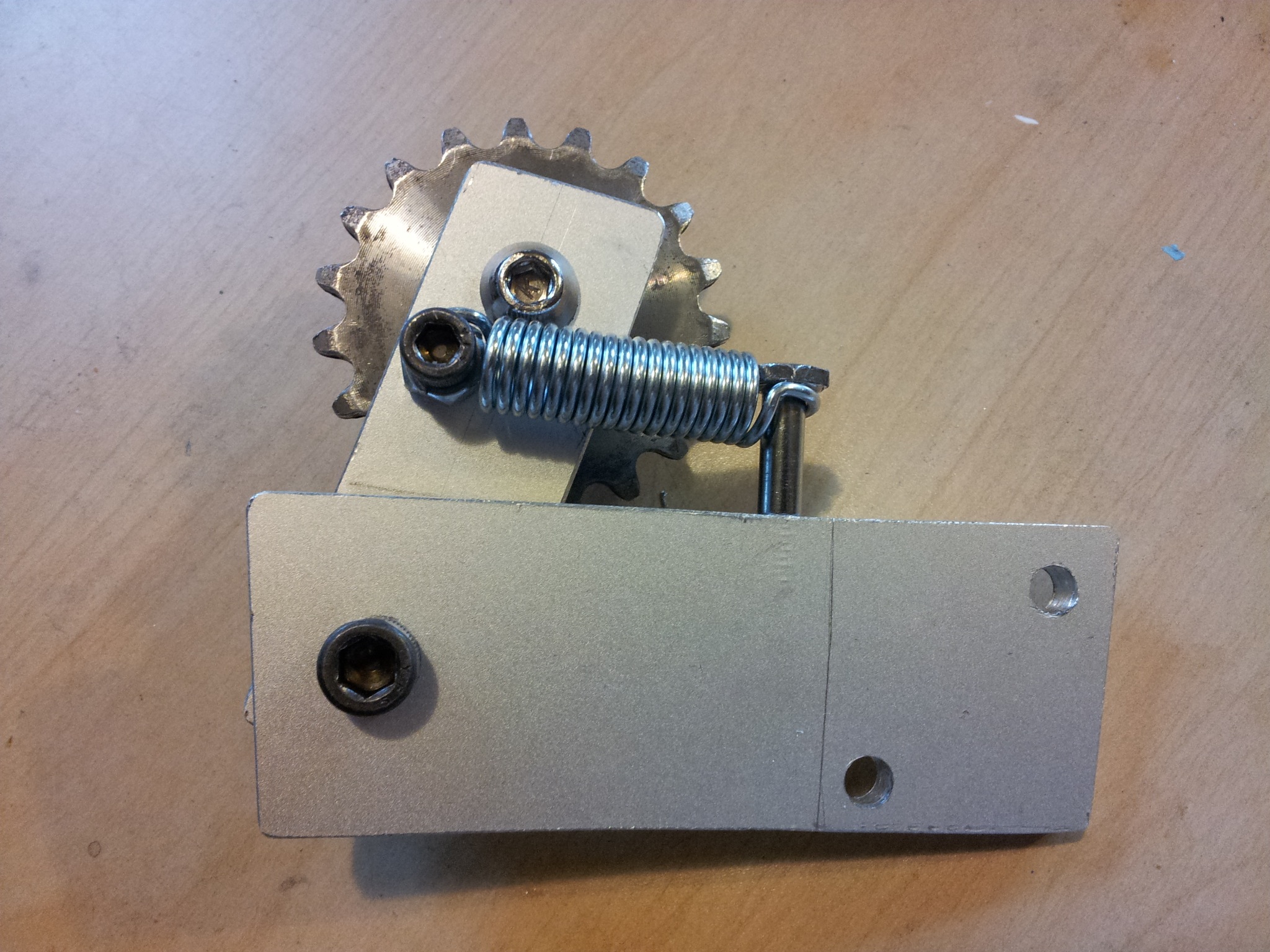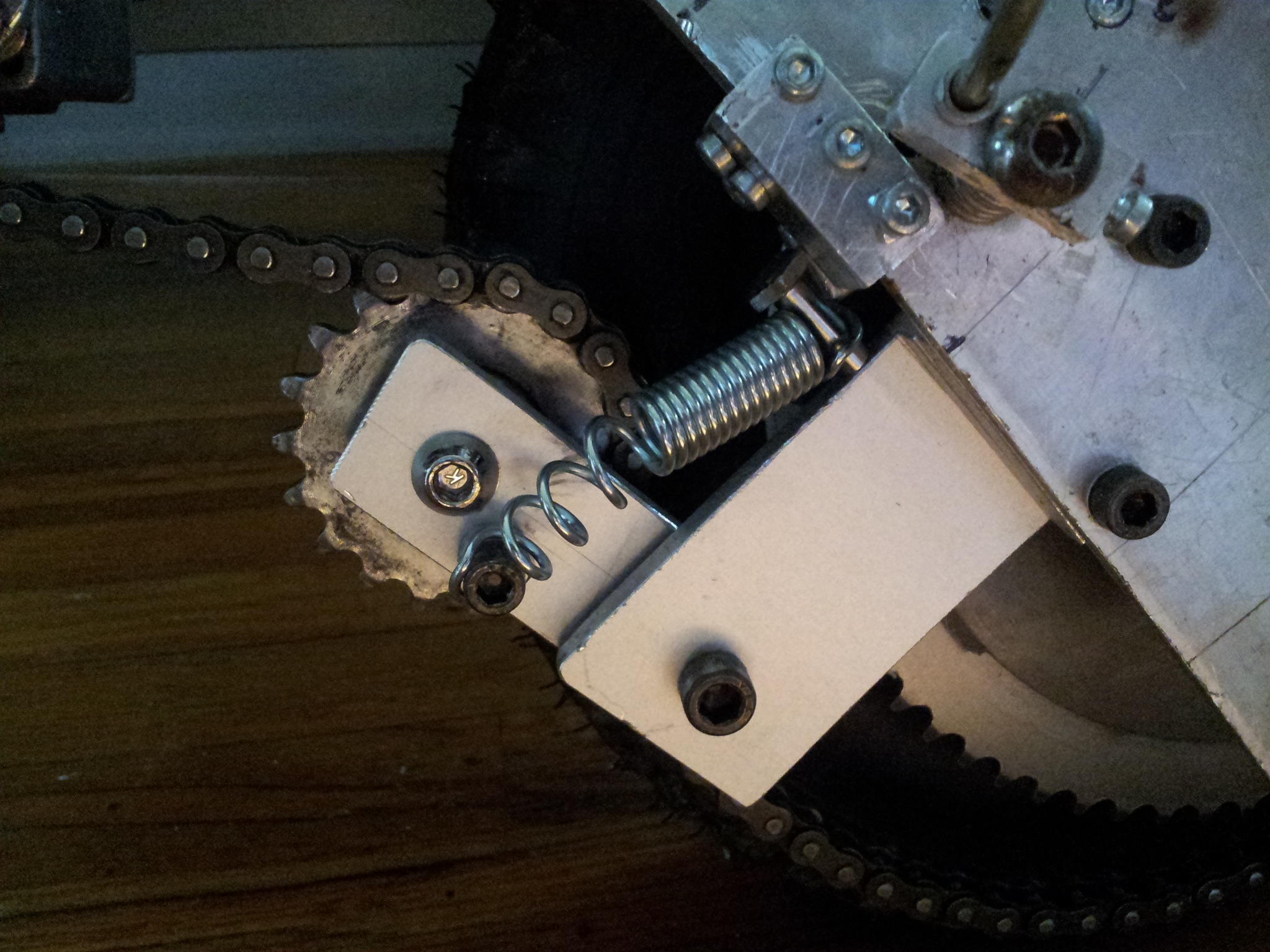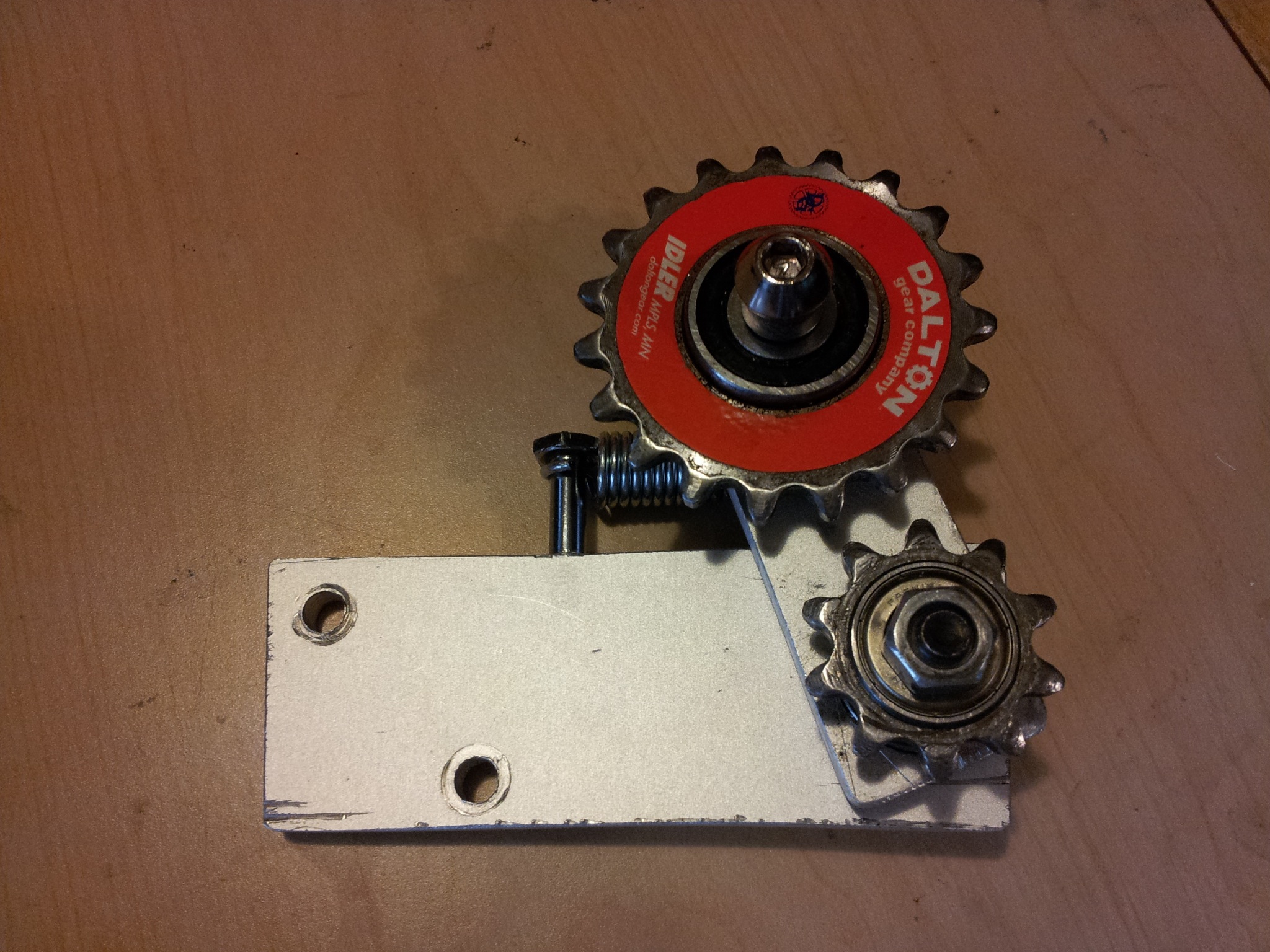 I would have preferred to have the smaller sprocket at the end of the swinging part of the chain tensioner, as it would respond to bumps more quickly due to it's smaller mass, but the geometry did not work out.