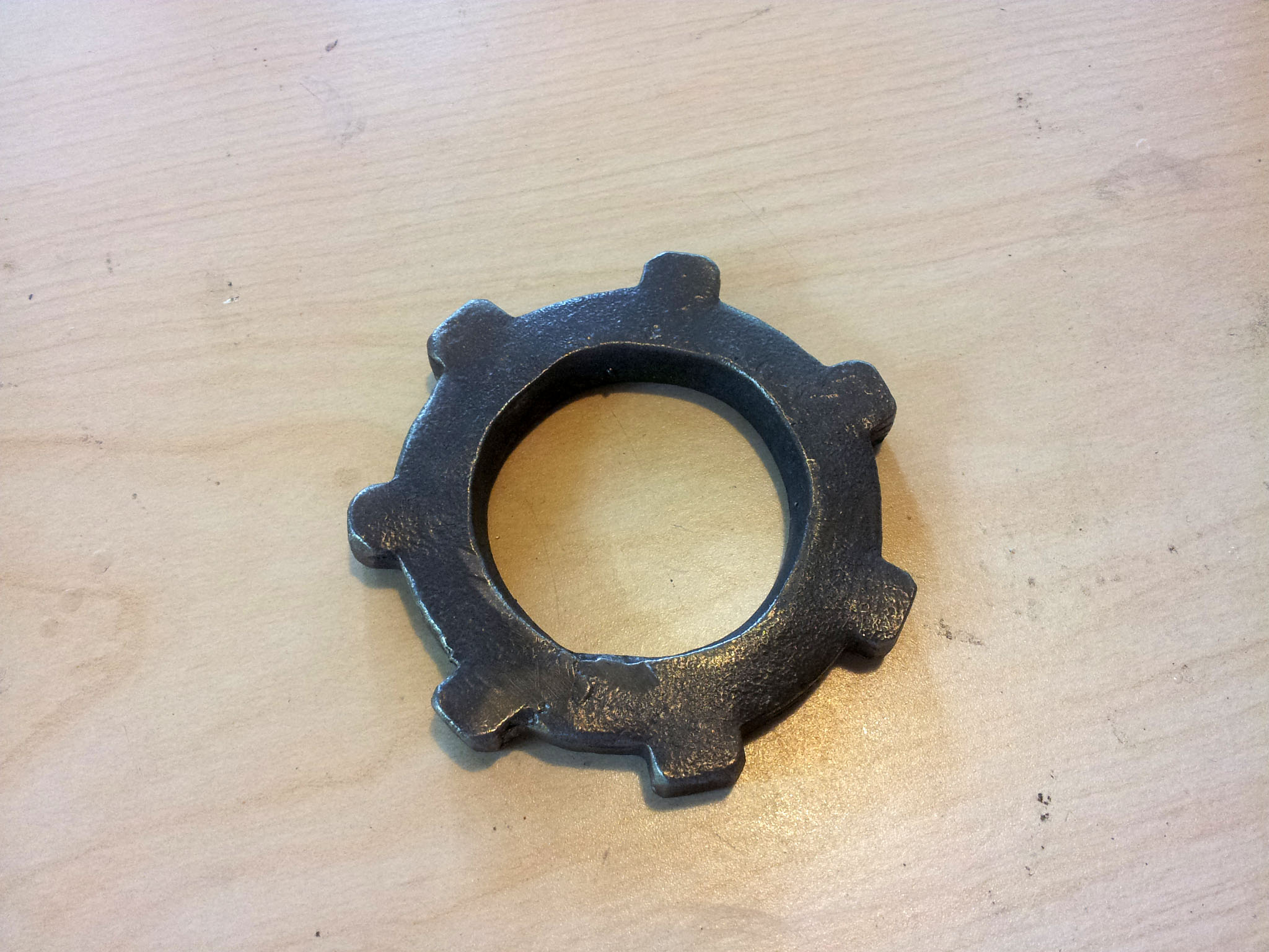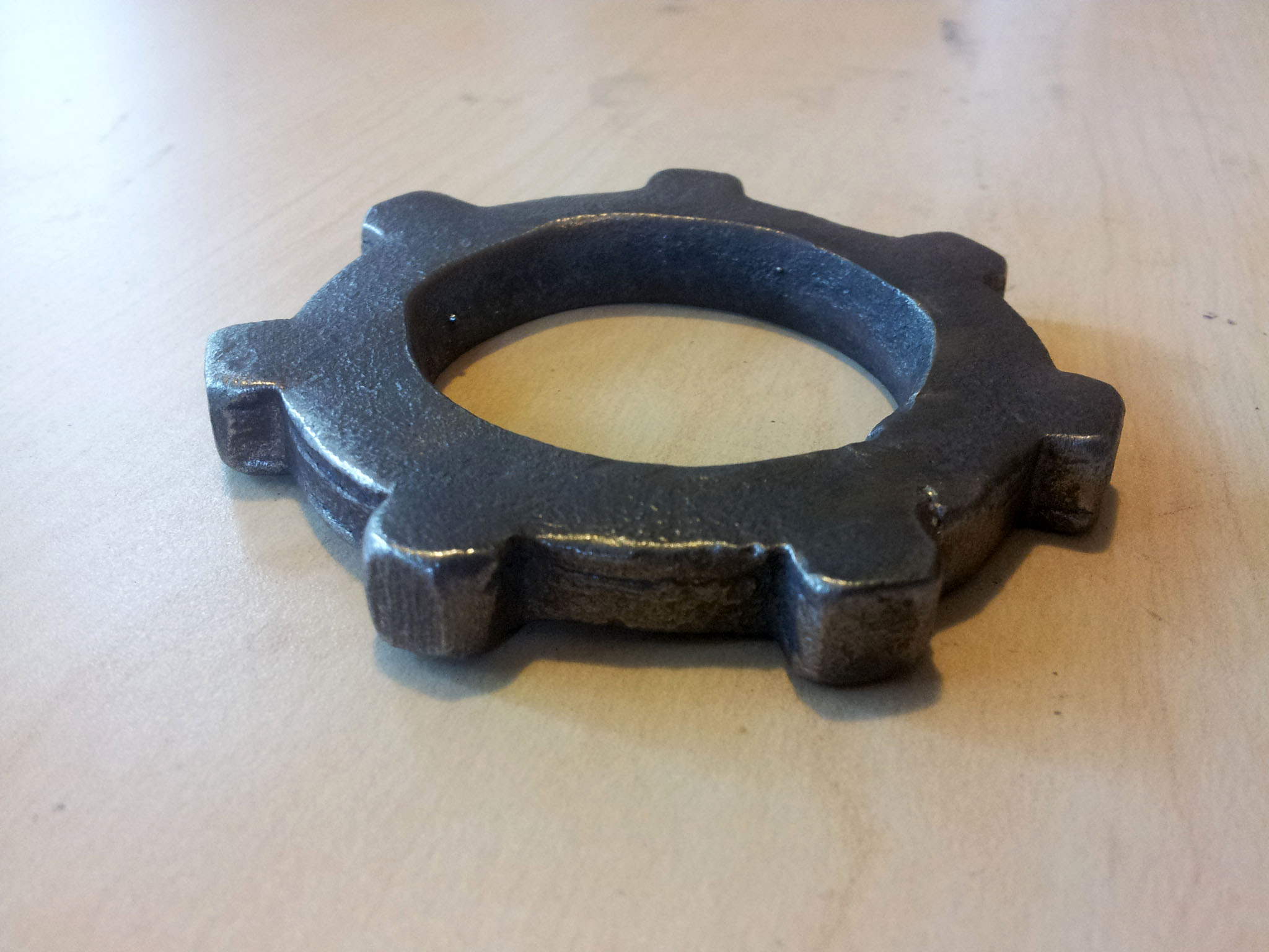 Here's the frist gear I made. I ended up not using it, because the teeth stretched too far apart when I bent the gear into a circle. For the small gear I ended up using, I halved difference between the outer and inner diameters of the gear (minus the teeth), so that the metal would stretch less when I bent it. The edges were smoothed and given a worn look by wire brushing them with an angle grinder.