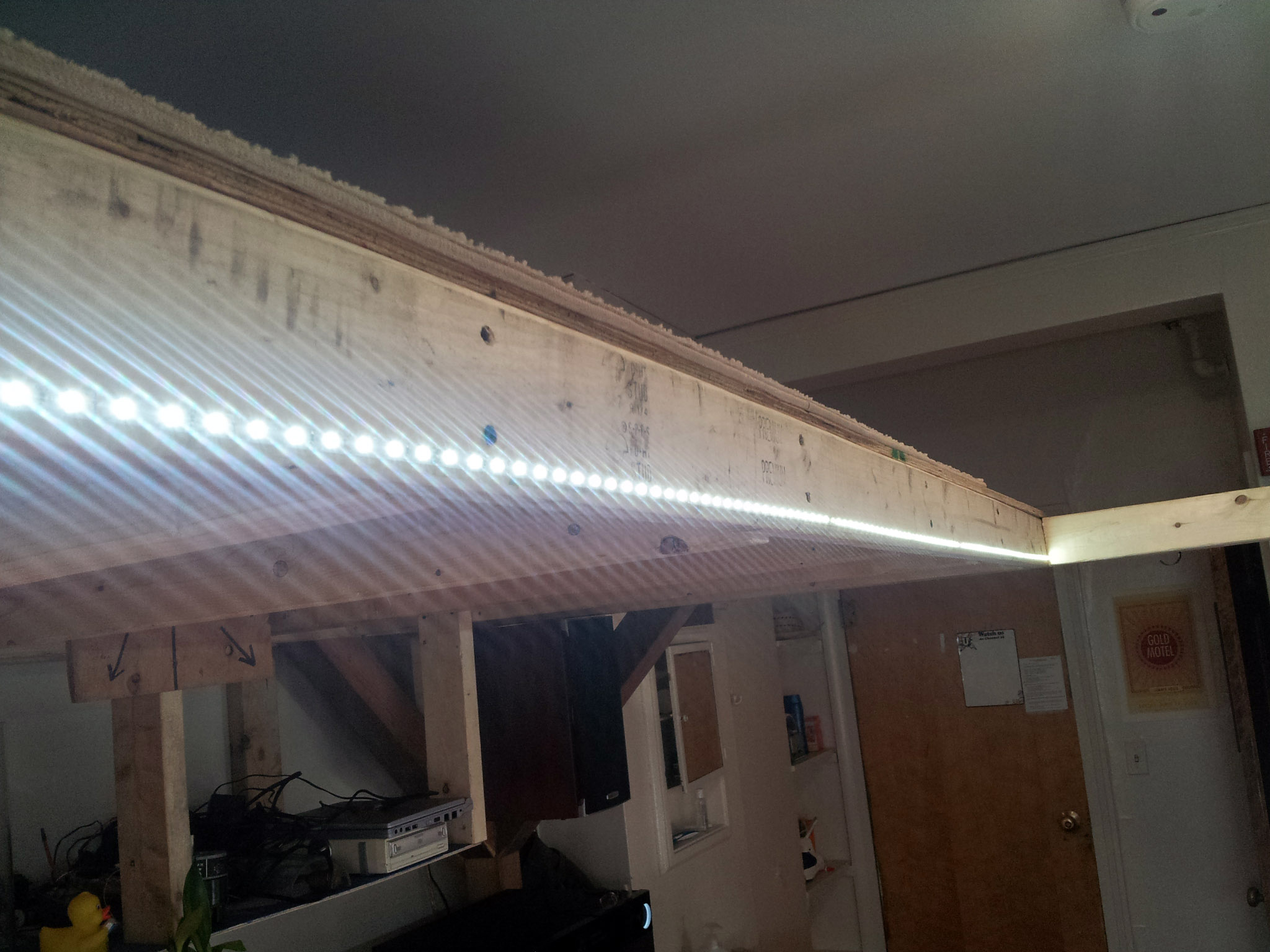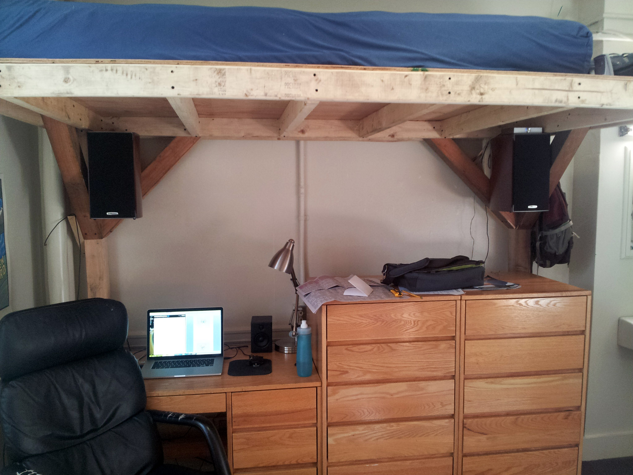 Using wood left over from the REX shenanigans in the East Campus courtyard, my roommate and I built a double loft in our room. We put up the loft in record time - we only had to sleep in our institute-provided beds for a total of one night before we could sleep in the loft. The design we used was based on another loft down the hall. It spans the entire room, so there are no supports in the middle of the floor, and it is tall enough to walk under without having to duck. It also includes integrated speaker mounts, a cruft shelf, and LED strip lighting.