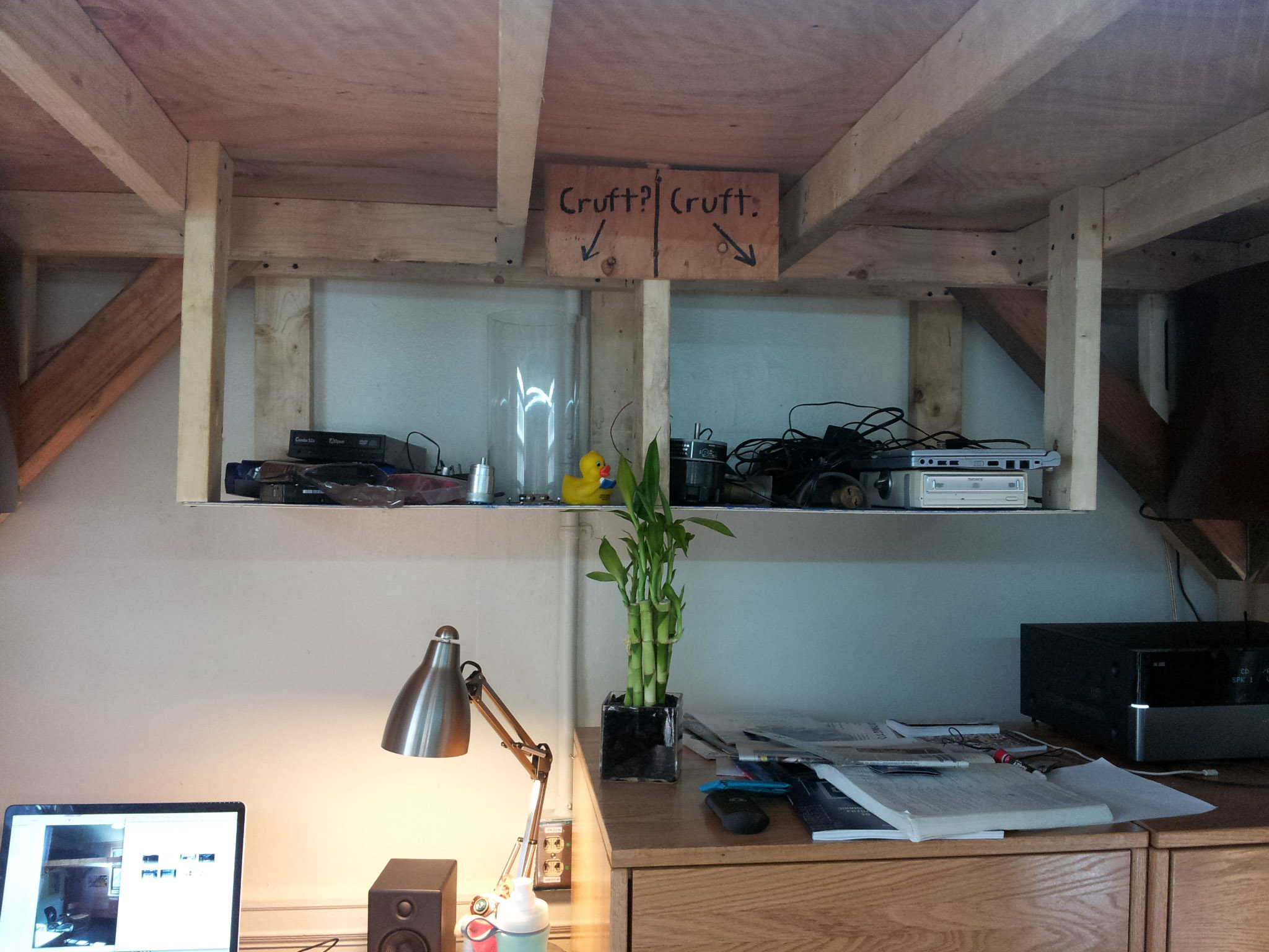 We made a shelf for scavenged parts, or "cruft", using a left over shield from the East Side vs West Side water war: