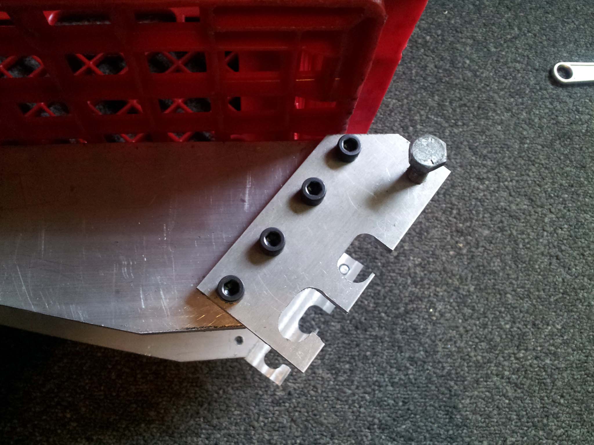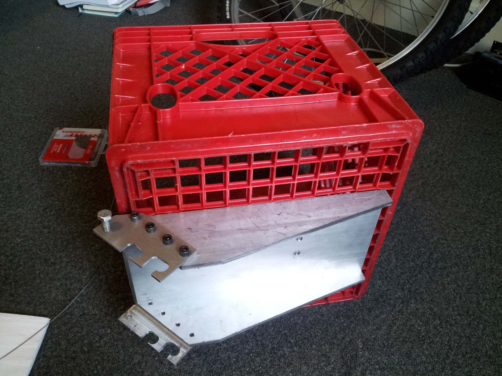 The crate is clamped to the rest of the structure by an aluminum plate and four bolts: