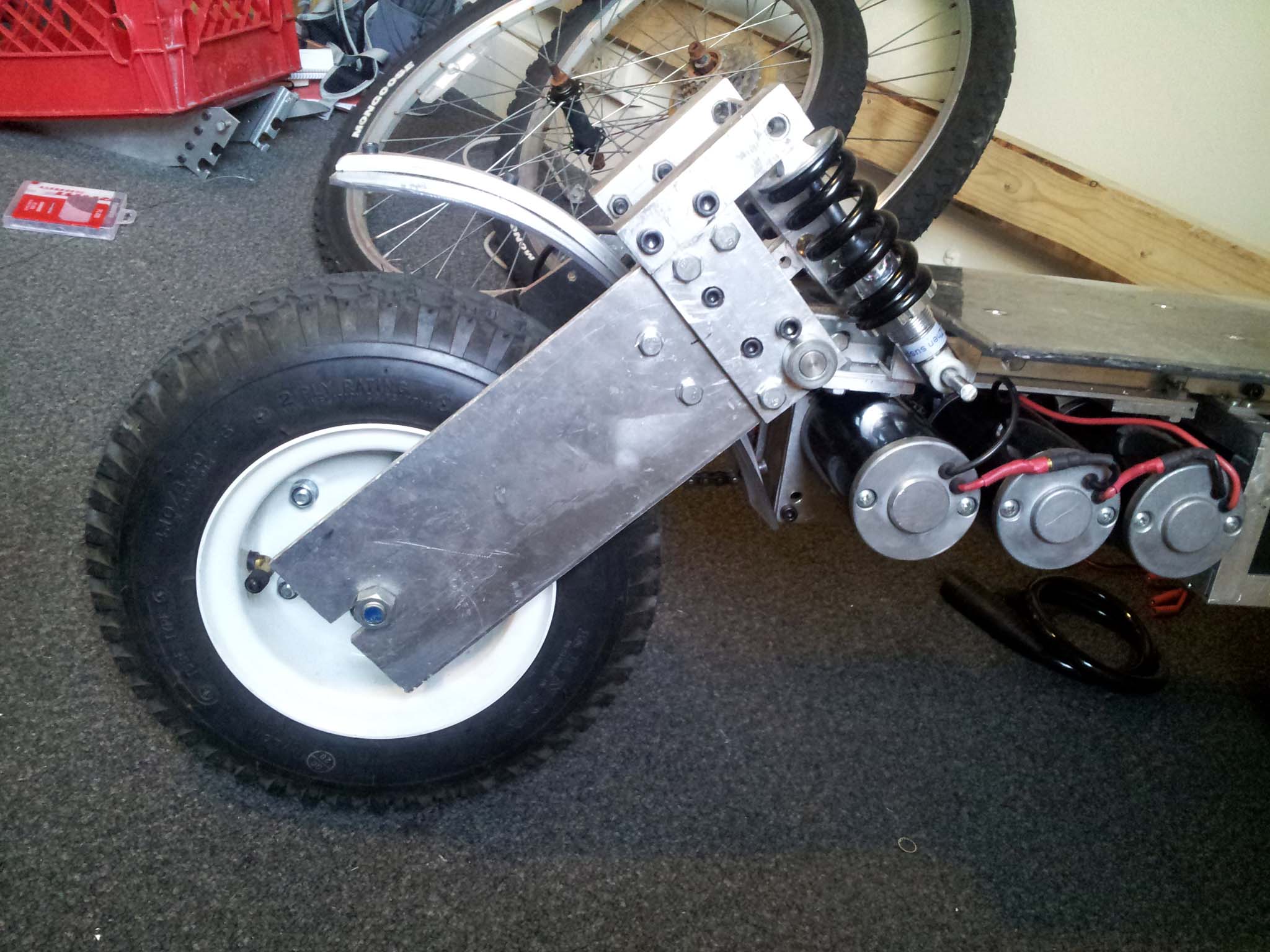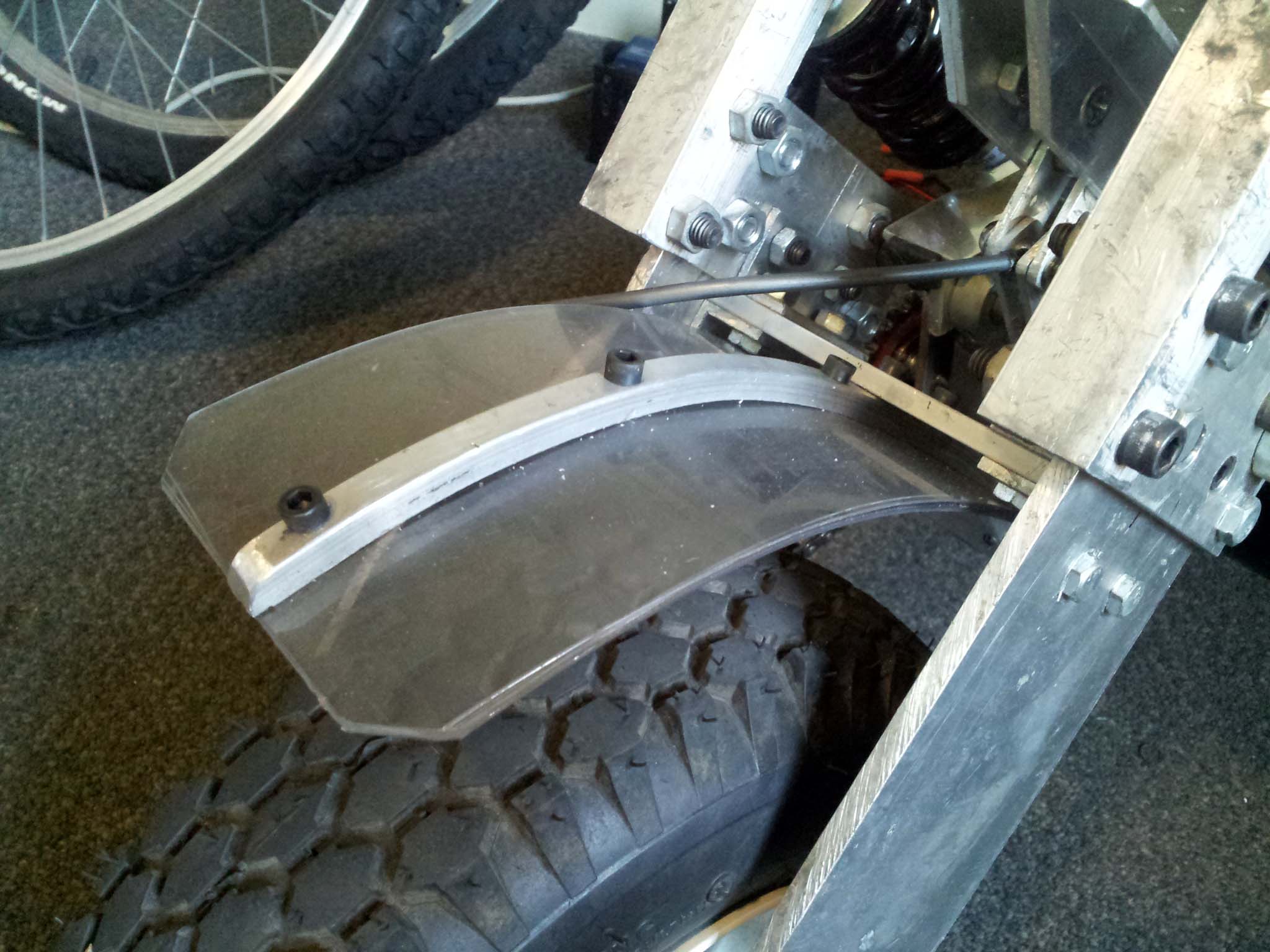 The fender was made from a long piece of approximately 3/8" square-ish aluminum bar left over from someone's water-jetted stock and a piece of 1/8" polycarbonate. The aluminum was bent into an arc, the ends were filed to curves, and it was drilled through to attach the polycarbonate. Two more holes were drilled and tapped into it, so that the fender could be bolted to the crosspiece from the rear suspension assembly. The polycarbonate was scored and broken to size, since the MITERS bandsaw is currently out of commission. The polycarbonate was drilled and tapped, and screwed to the fender's aluminum backbone.