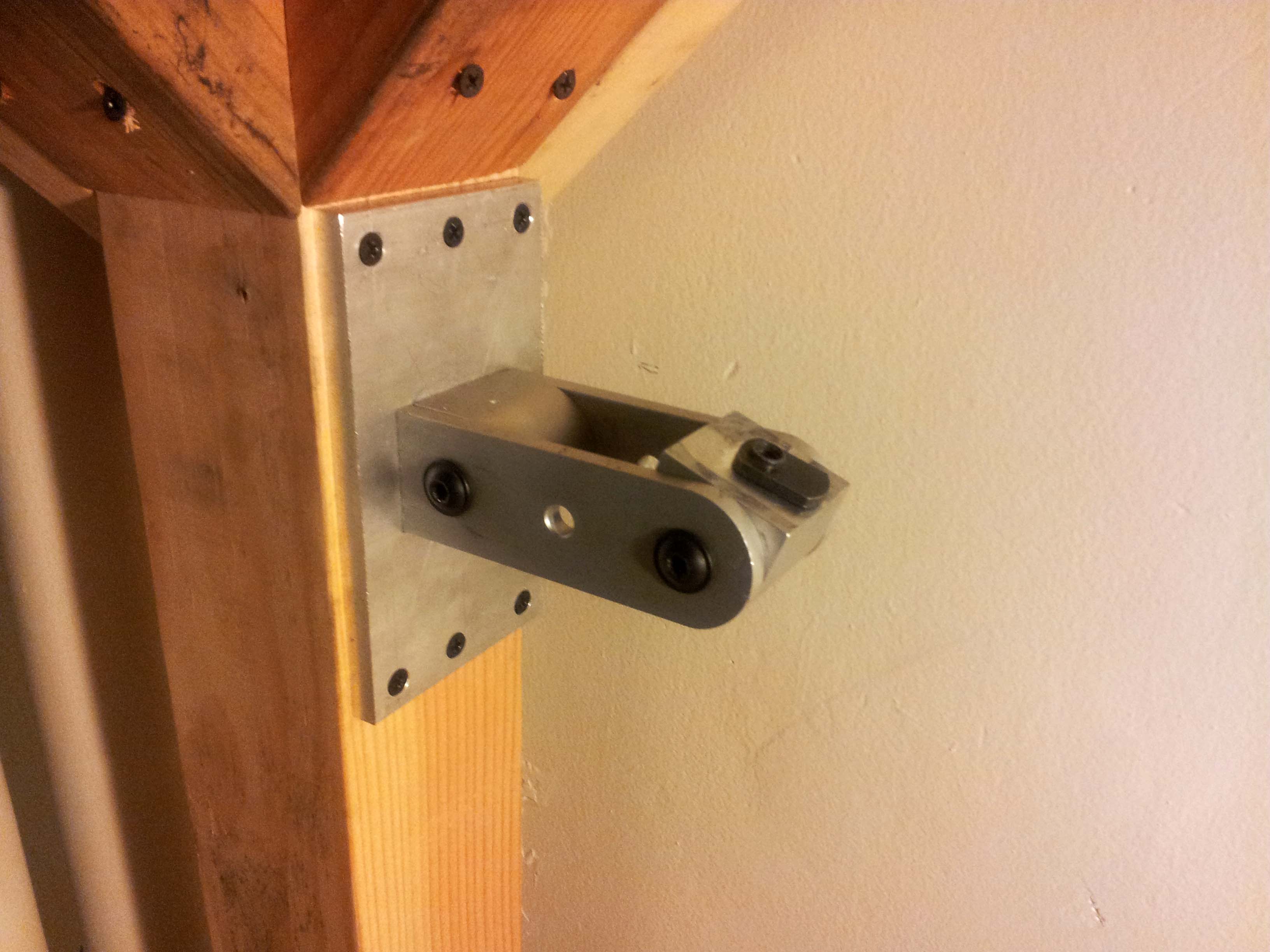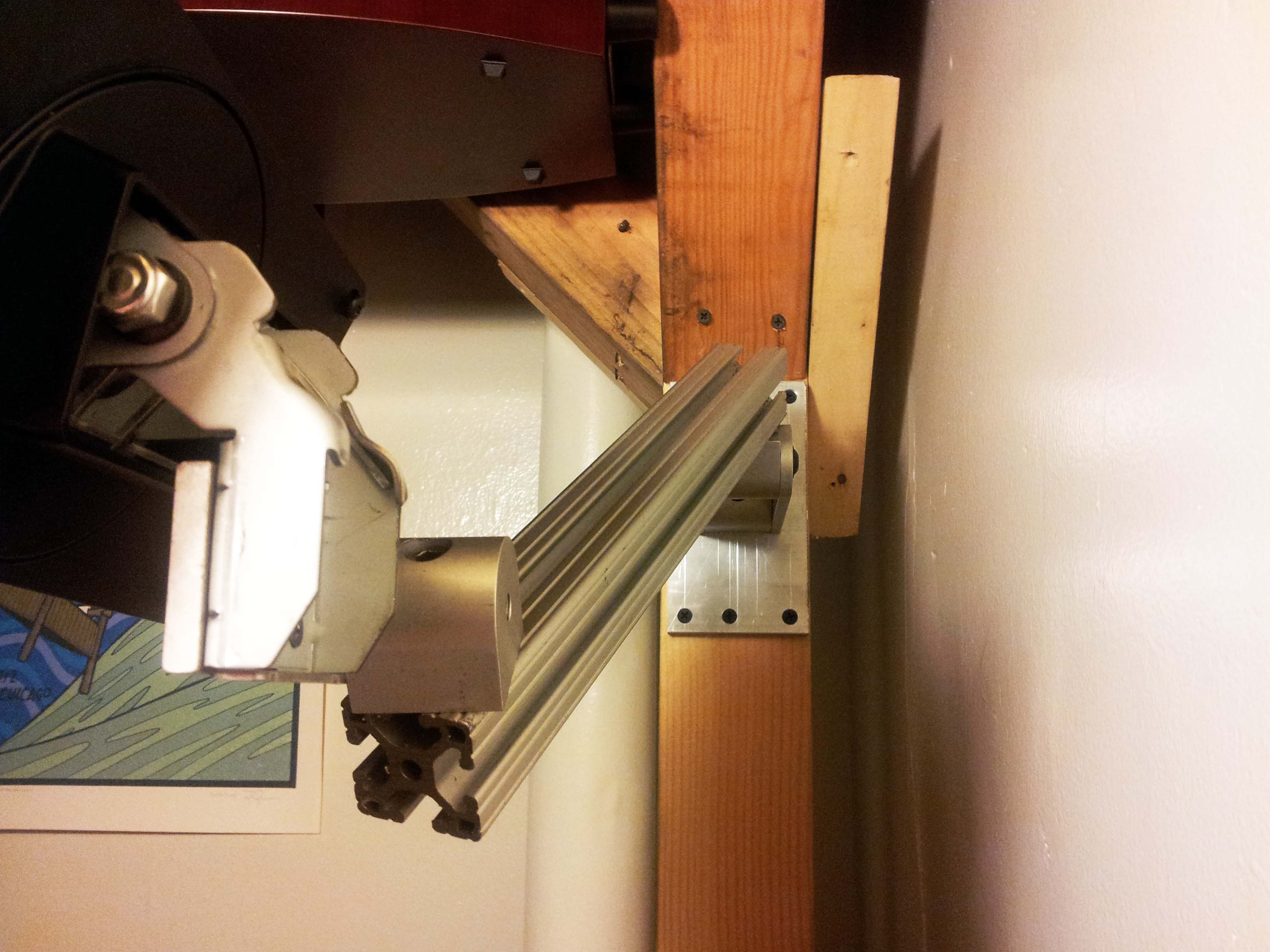 By a combination of luck and keeping a close eye on the reuse mailing list, I have acquired a pair of nice, large computer monitors: A 24" 1920 x 1200 SyncMaster 245BW and a 25" 1920 x 1080 HP 2509m. Both screens were easily repaired by replacing dead capacitors on their power supply and inverter boards. Due to the small size of the stock dorm room desks, the two monitors plus my laptop could not actually fit on my desk with space left for anything else, so I built a monitor arm that bolts to my loft out of some 80/20 extrusion.
