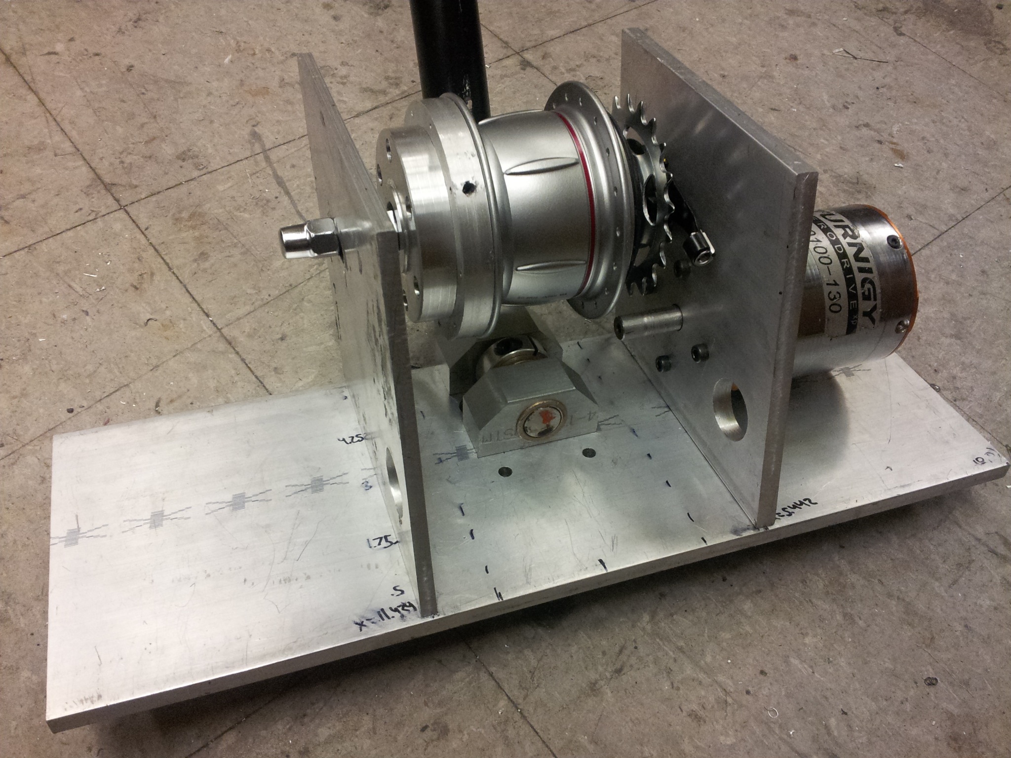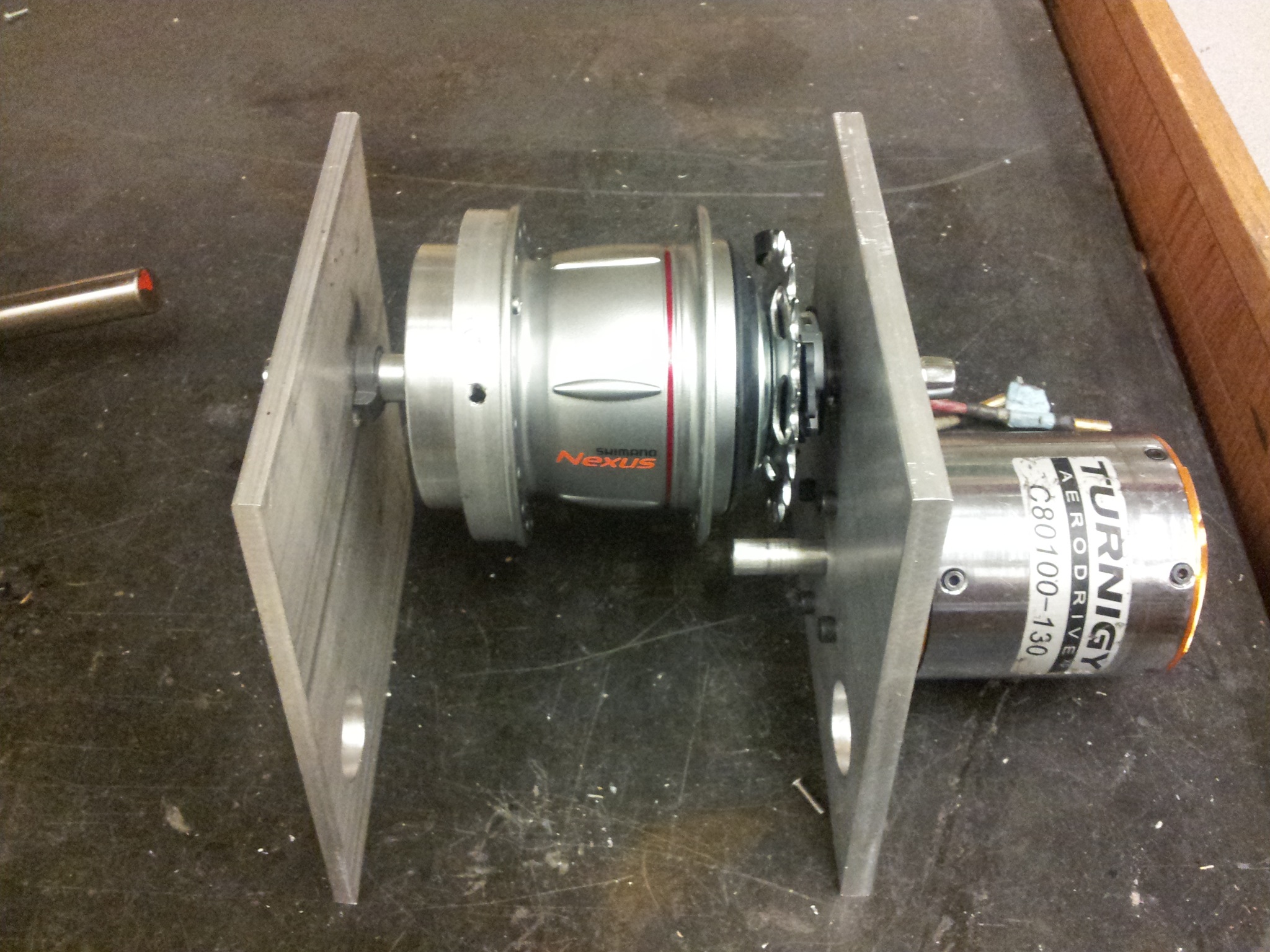 Here are the hub and the motor bolted to the two drivetrain-supporting plates: