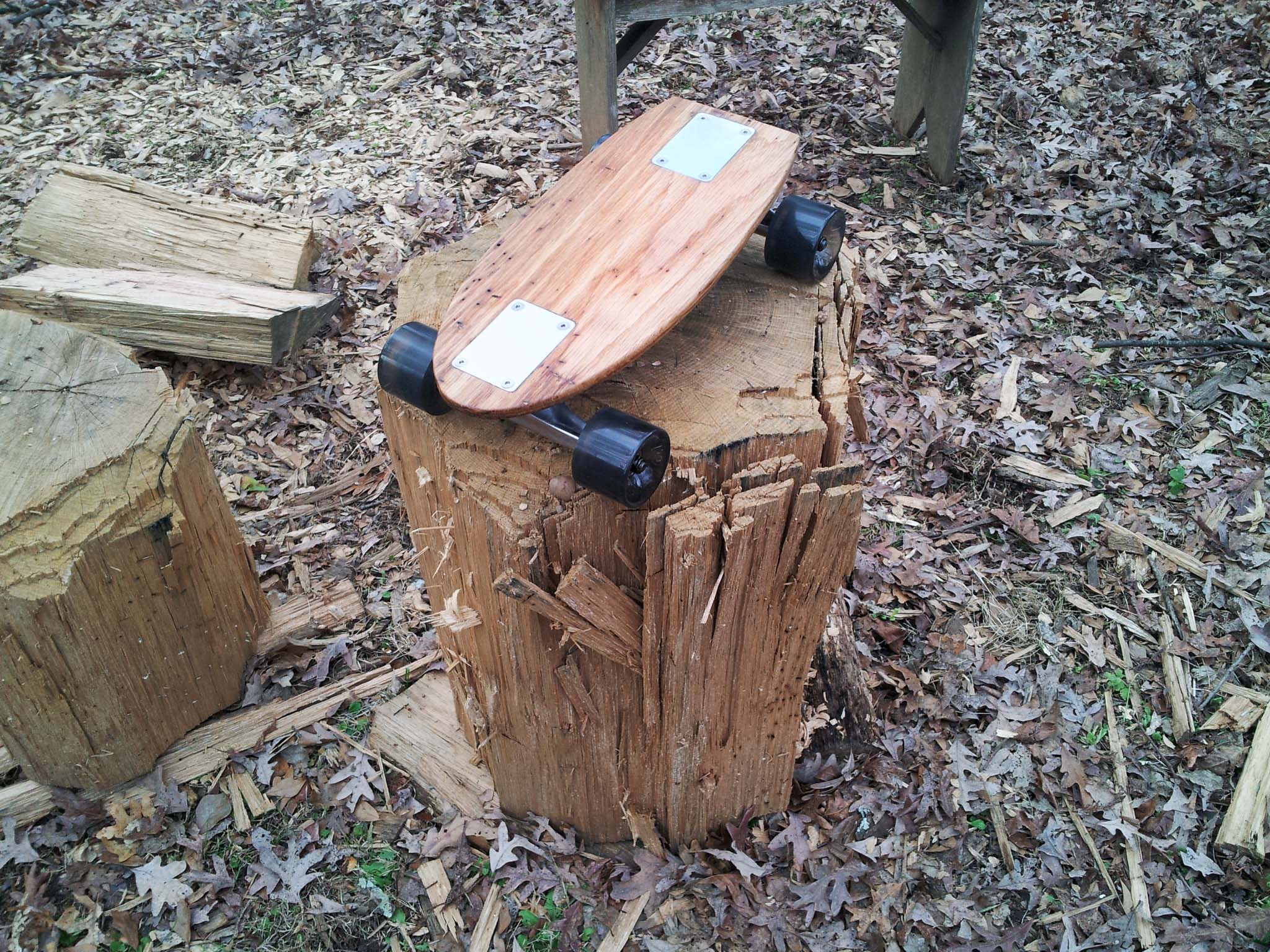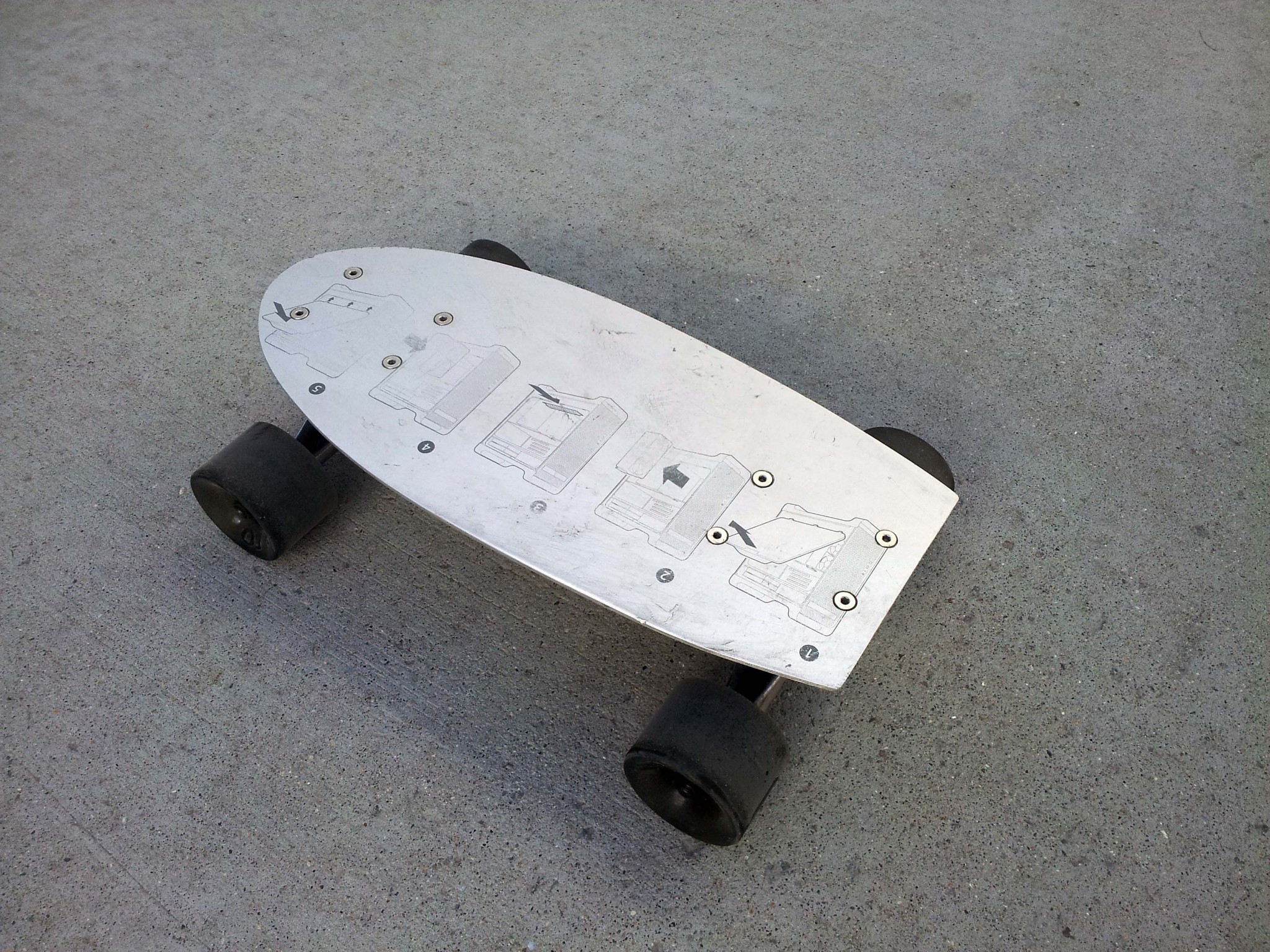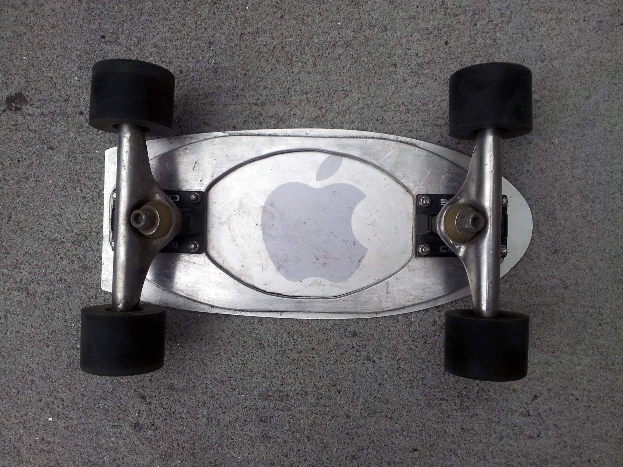 PocketBoard is a 14.5" long skateboard designed to be the opposite of my electric scooter: It is a small, simple and reliable vehicle for going short distances quickly. At roughly 5% the weight of the scooter and some small fraction of the volume, I can easily store it in a backpack or even my laptop bag when I'm not riding it. It has a solid oak deck with inlayed aluminum plates, and (what I assume to be) standard skateboard trucks, along with some soft 60mm diameter wheels.
