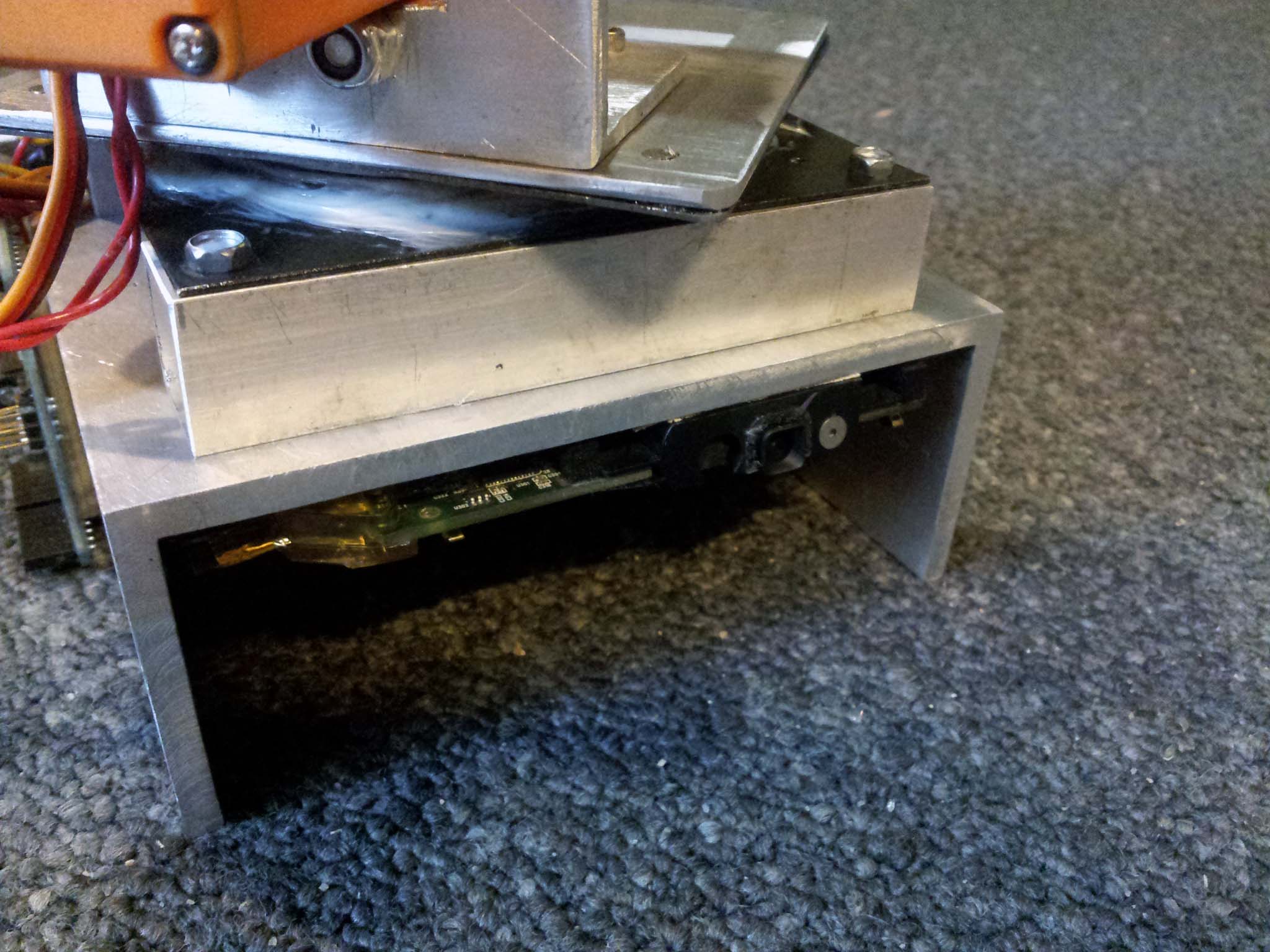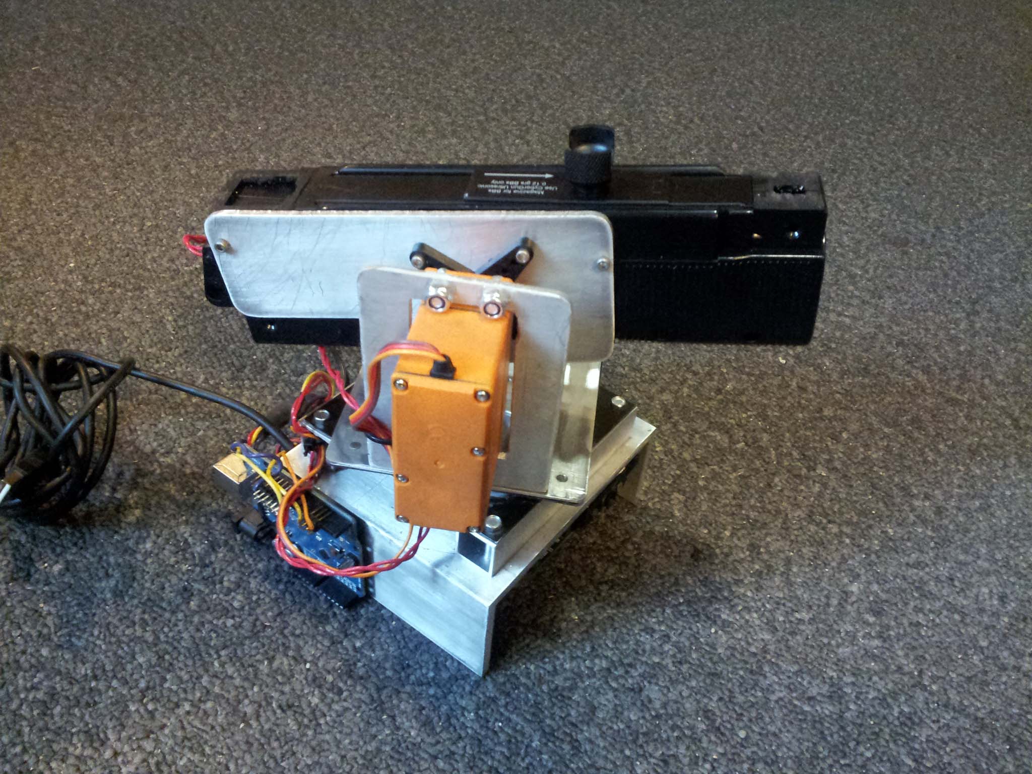 I used the webcam from a 2006 iMac computer. Although these webcams are internal, they run over USB. I spliced its four wires to those of a standard USB cable, and stuck the camera just below the pan-tilt assembly.