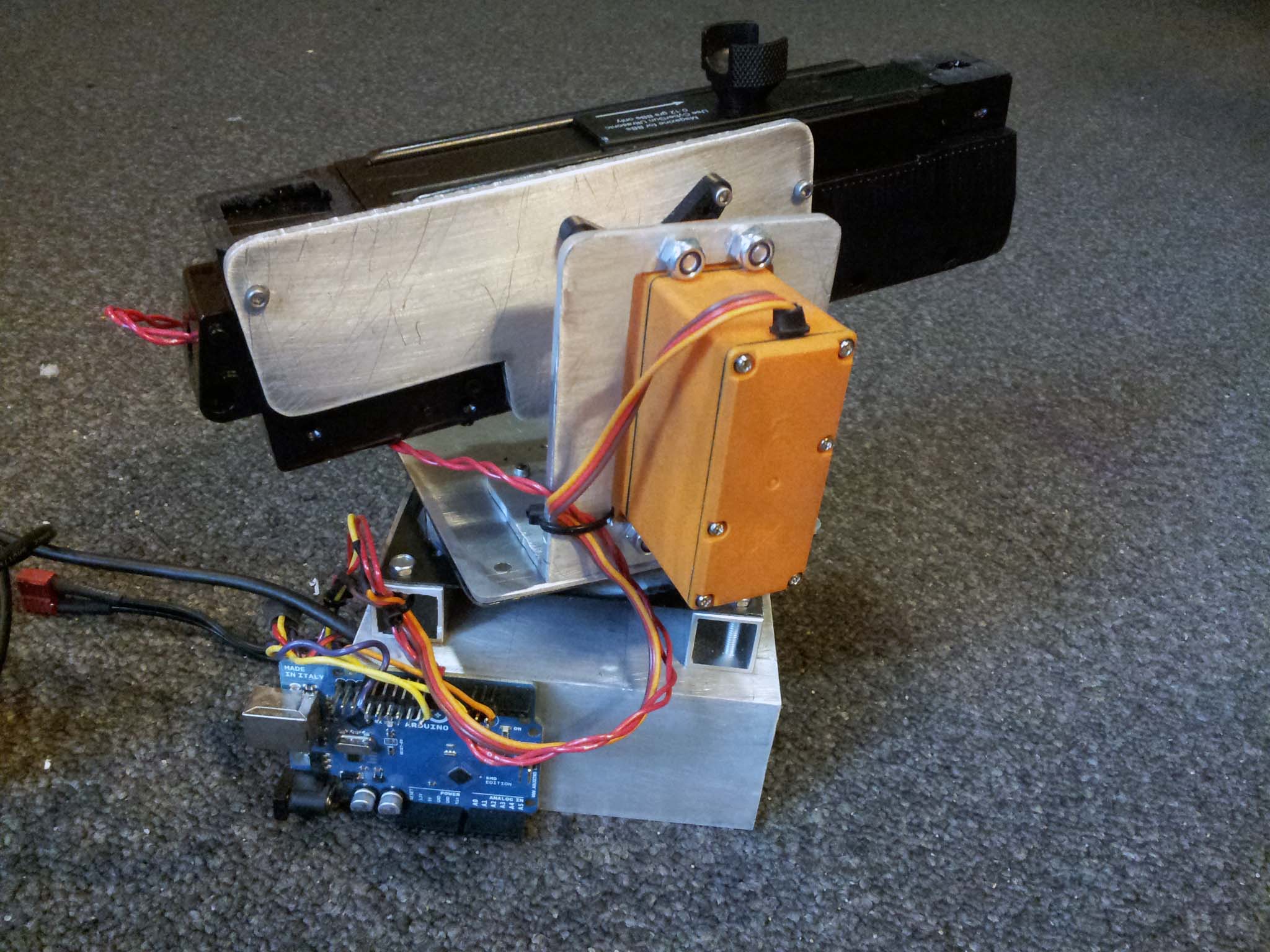 The servos arrived from HobbyKing an unfortunately short amount of time before the start of Bad Ideas, so I had only three days to build, test, and calibrate the sentry.