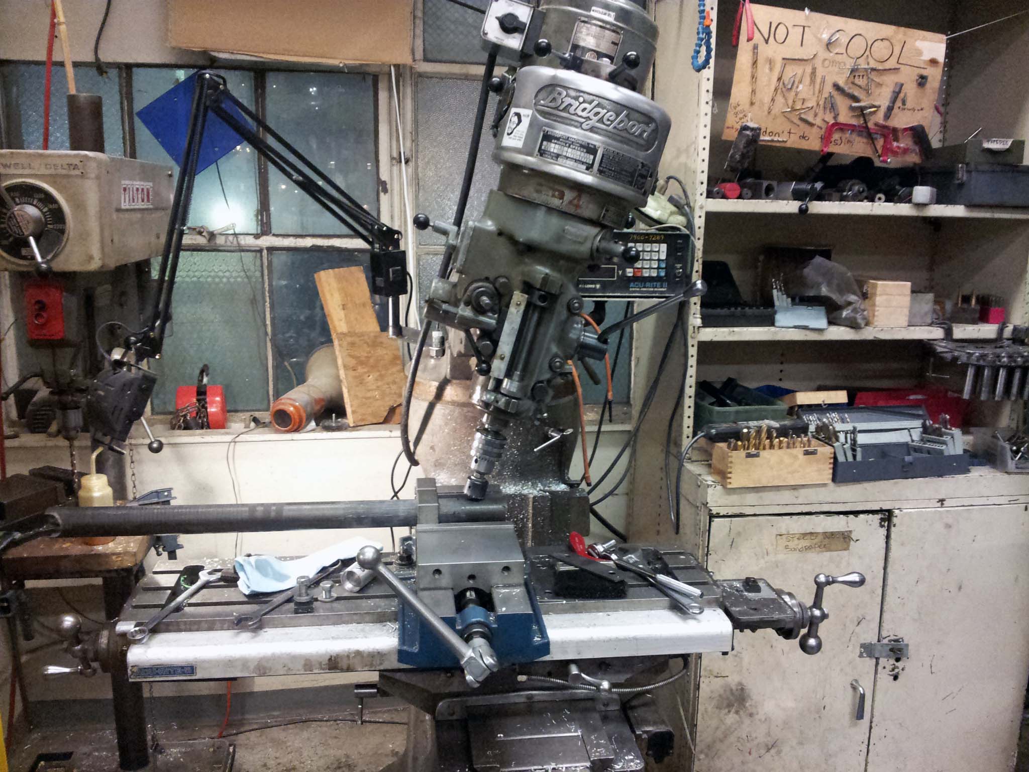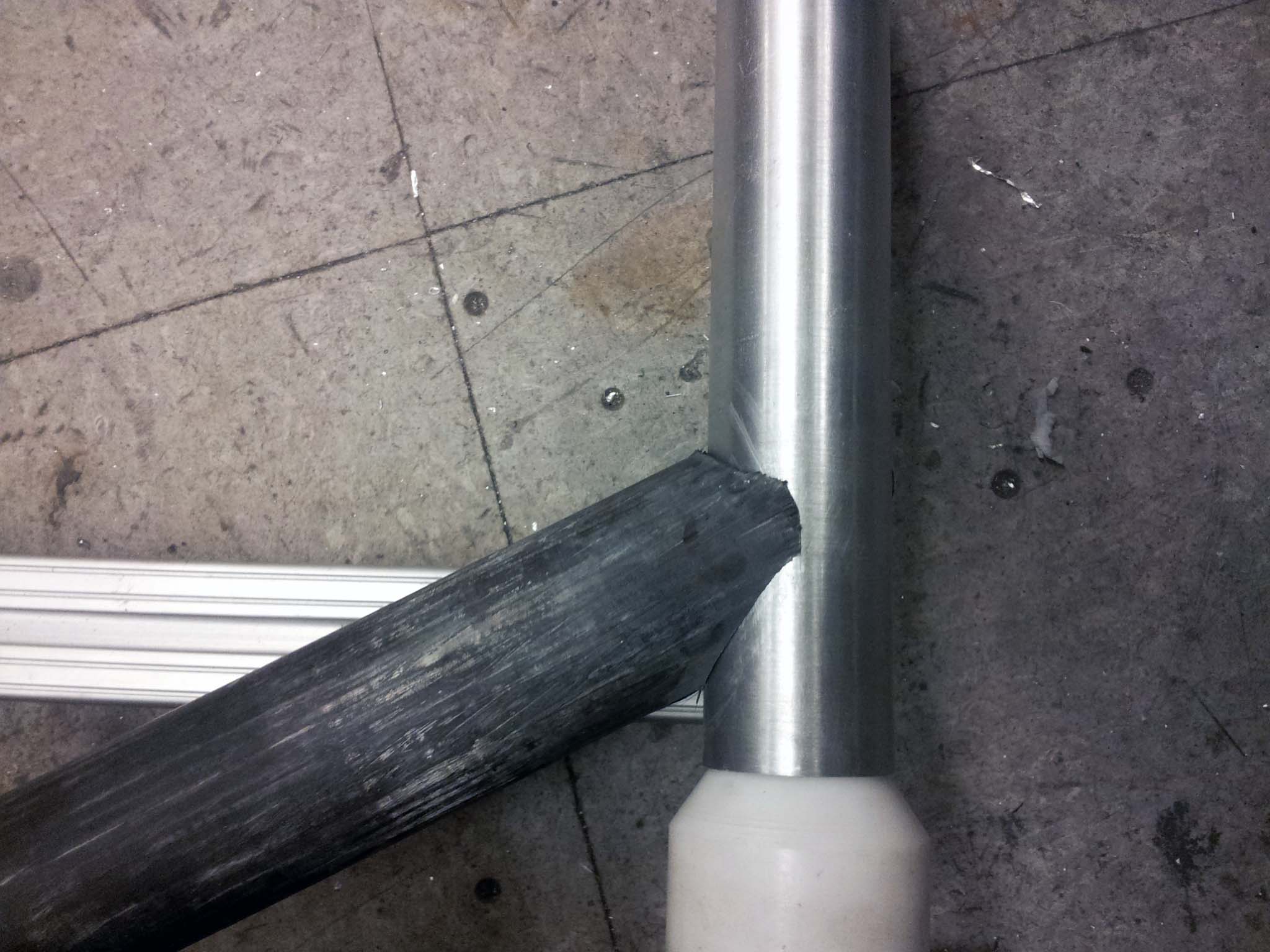 With the jig done, I started mitering the carbon fiber tubes. I did this on the mill with a hole saw. Weird angles were made by rotating the mill head: