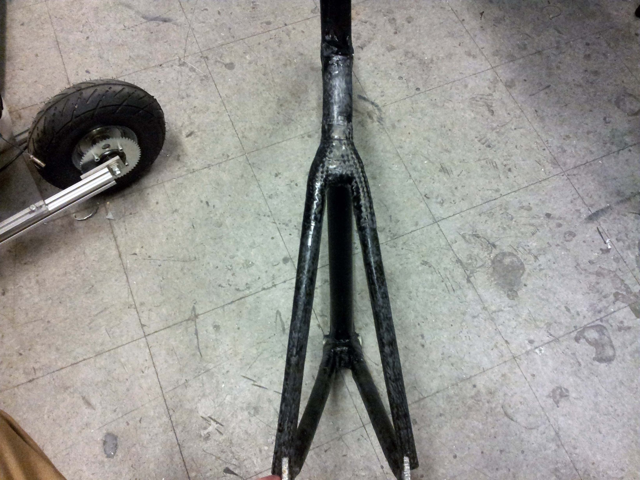 Out of curiosity, I sent out a query to reuse-ask, to see if anyone on campus had a working or only slightly broken carbon fiber fork they would be willing to part with. I thought it was a bit of a stretch, but I got a response within four hours, from someone with a fork that had been crashed.