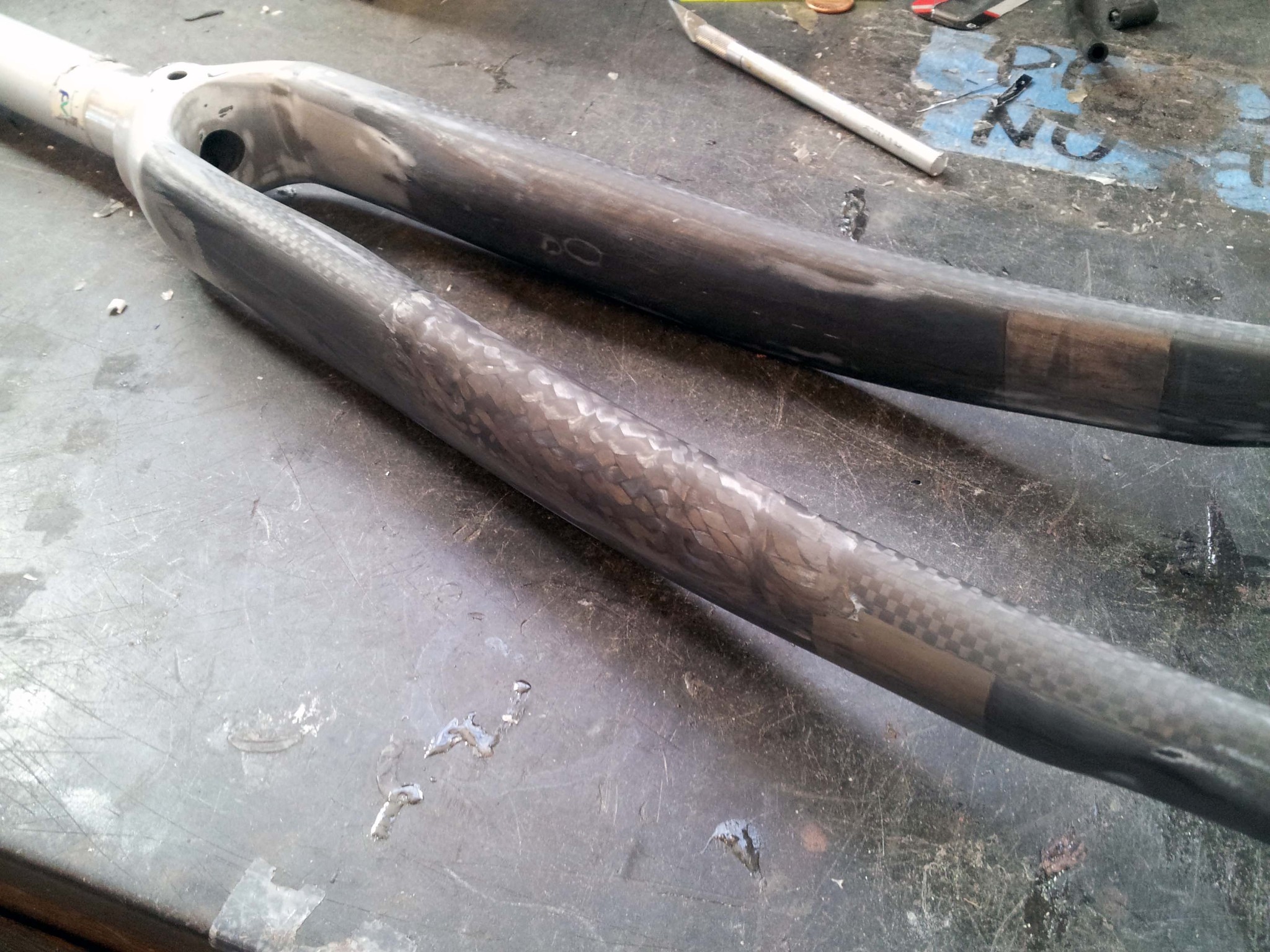 I sanded down the patch, and stripped the rest of the paint off the fork. I still haven't decided how to finish the surface yet.