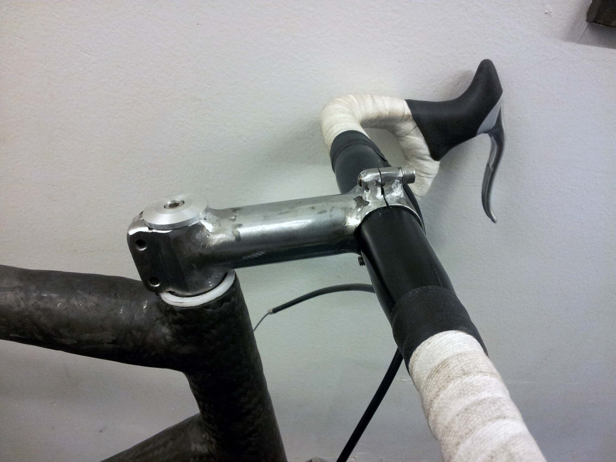 I was not able to scavenge a stem, so I welded up my own out of... steel. When the new TIG welder arrives at MITERS, and I learn how to use it properly, I'll weld up an aluminum one. I did not have a proper set of bearings for the top of the headset, so I made an experimental headset bushing out of Delrin.