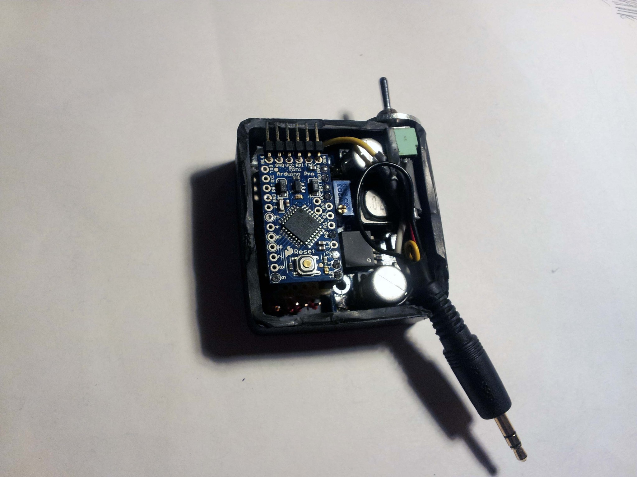 I crammed the Arduino, transistor board, and tiny DC-DC converter into the cut-down plastic casing from a wall wart, and used an audio jack for quick-disconnecting the the power, ground, and signal lines.
