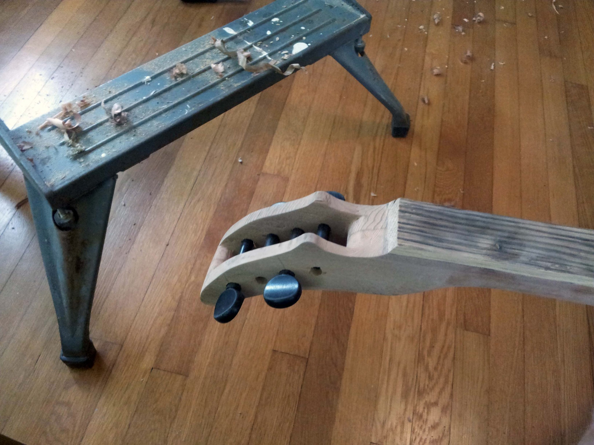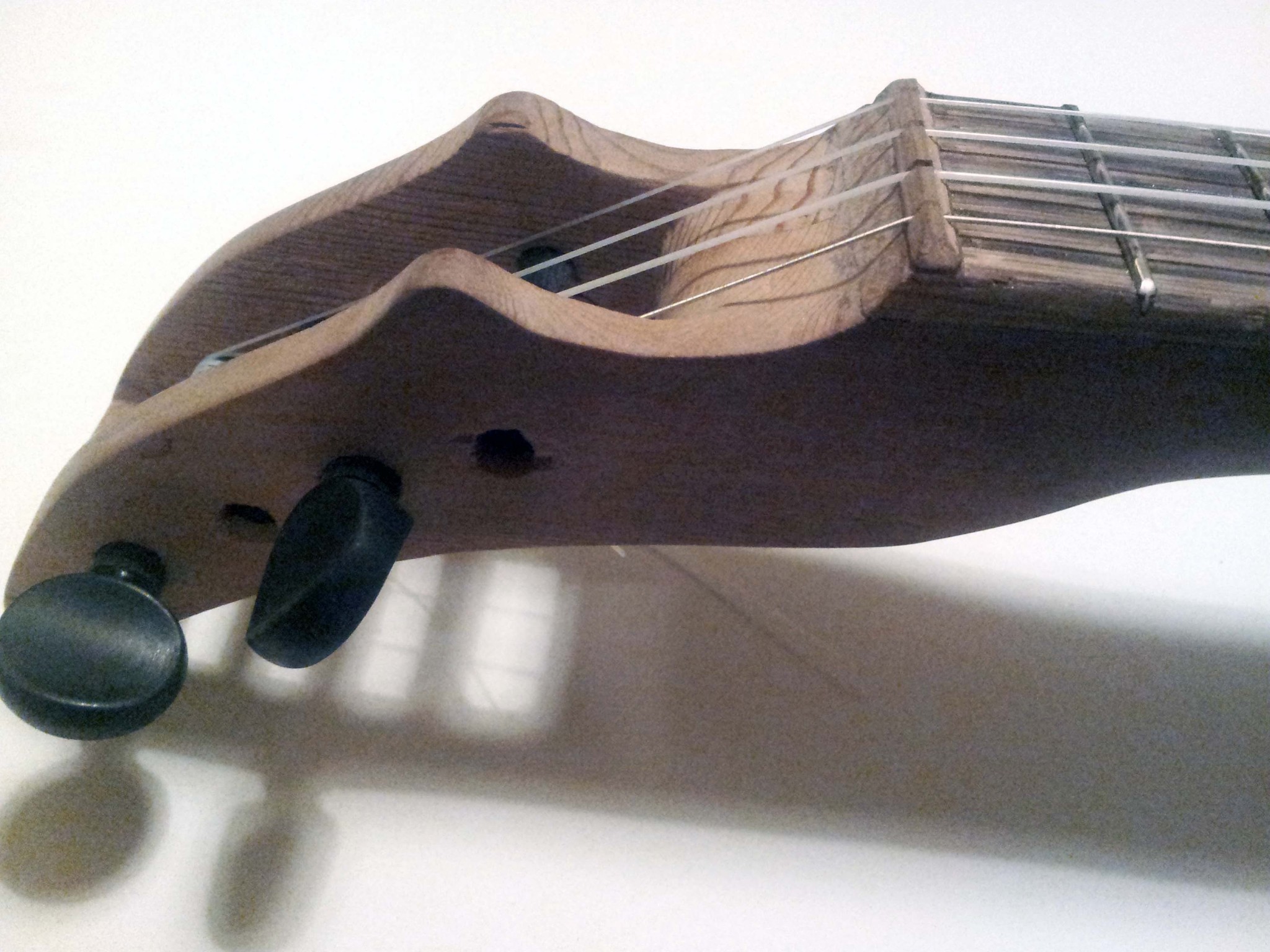 I wanted to get the ukulele to a playable state before I returned to campus, so I bought some violin tuning pegs rather than making my own. I reamed the tapered holes using a combination of drill bits and a pair of scissors with appropriately tapered blades.