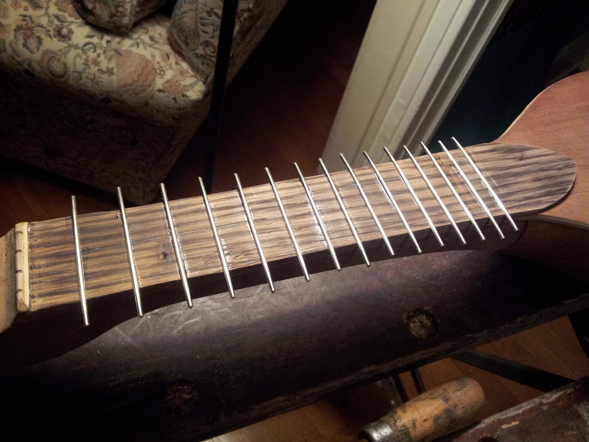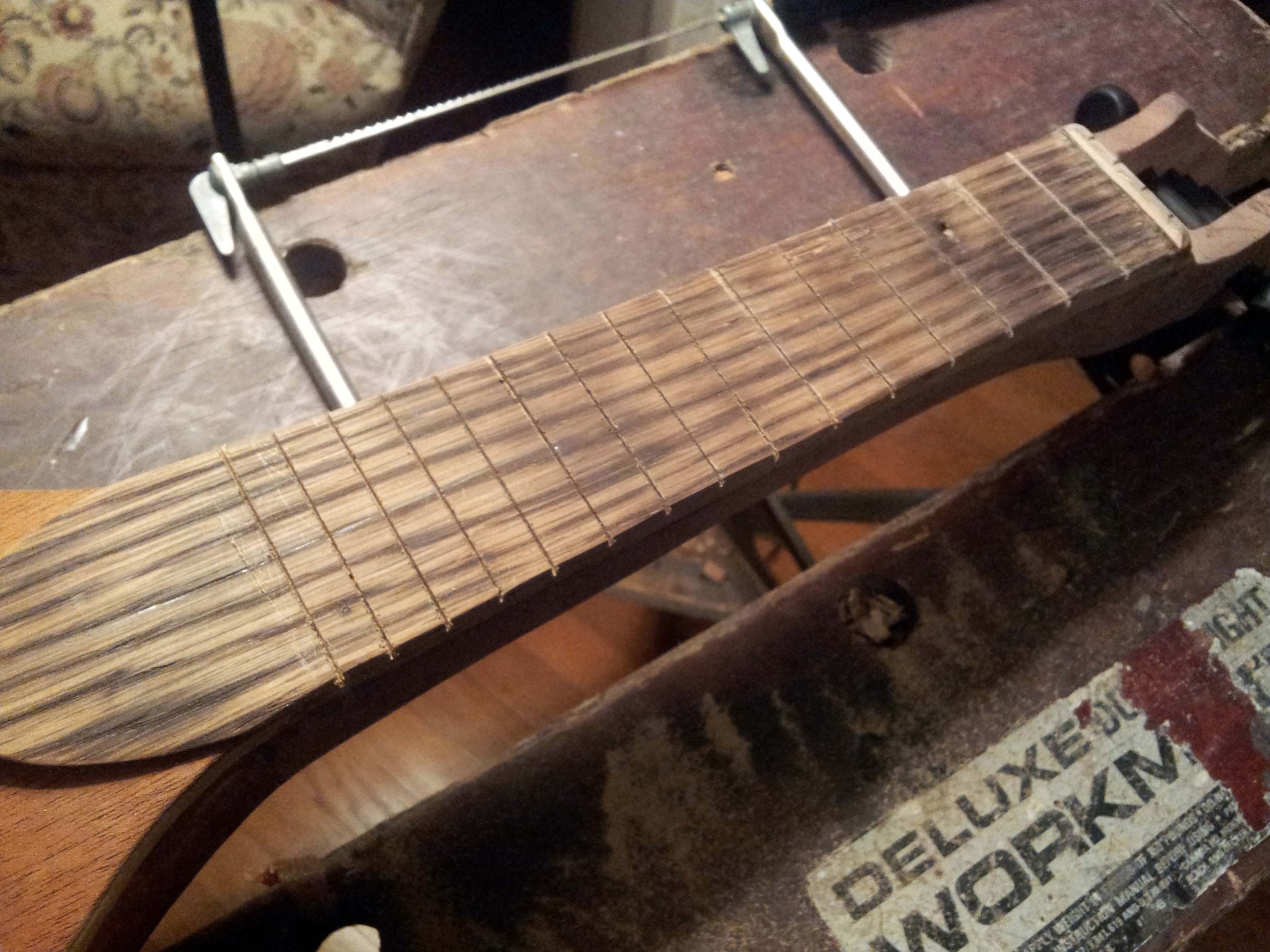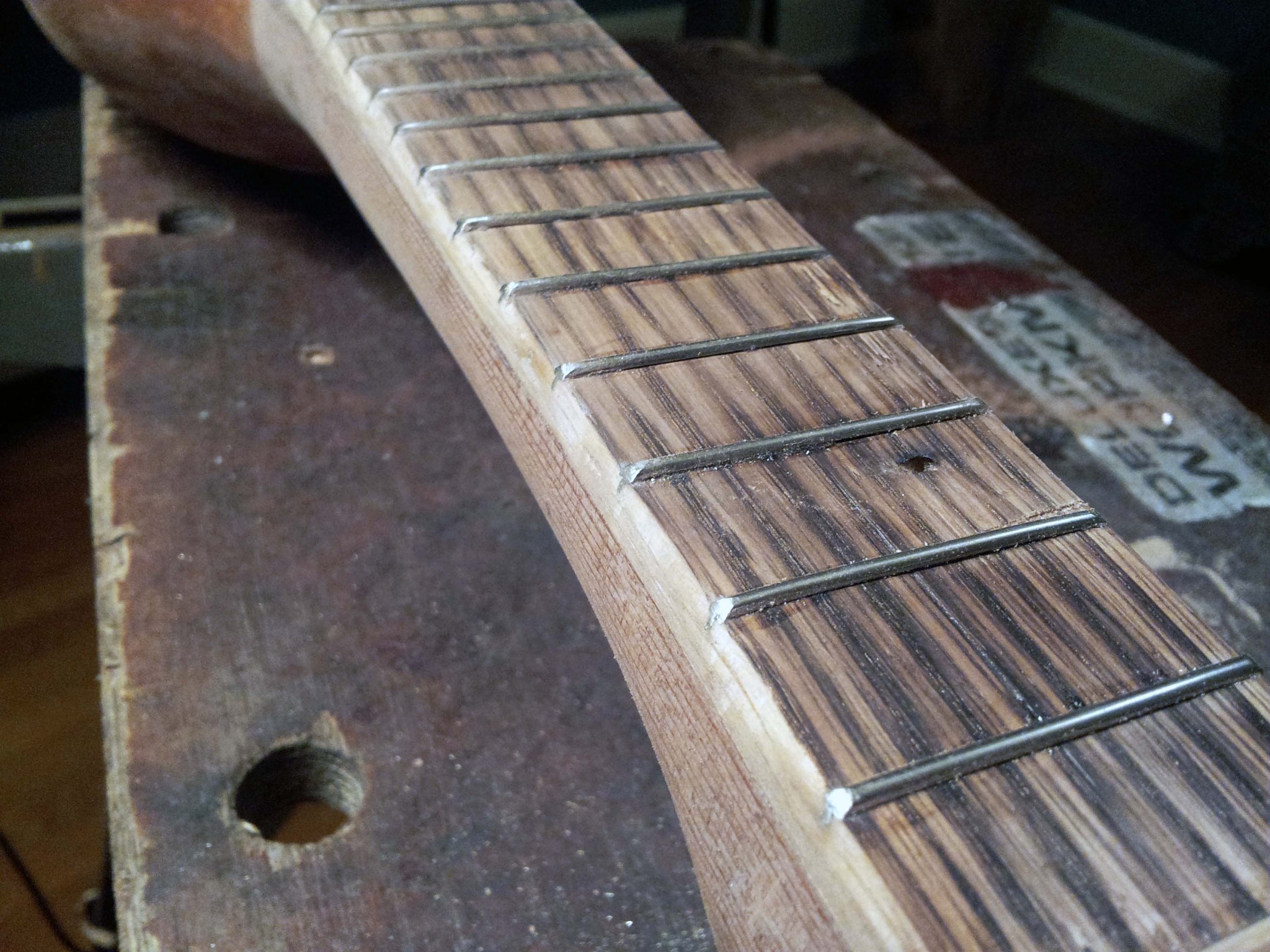 I wasn't confident that the barbs on the fret wire alone would hold the frets in, since the coping saw blade was a little too wide. I applied some epoxy to the frets before hammering them into place.