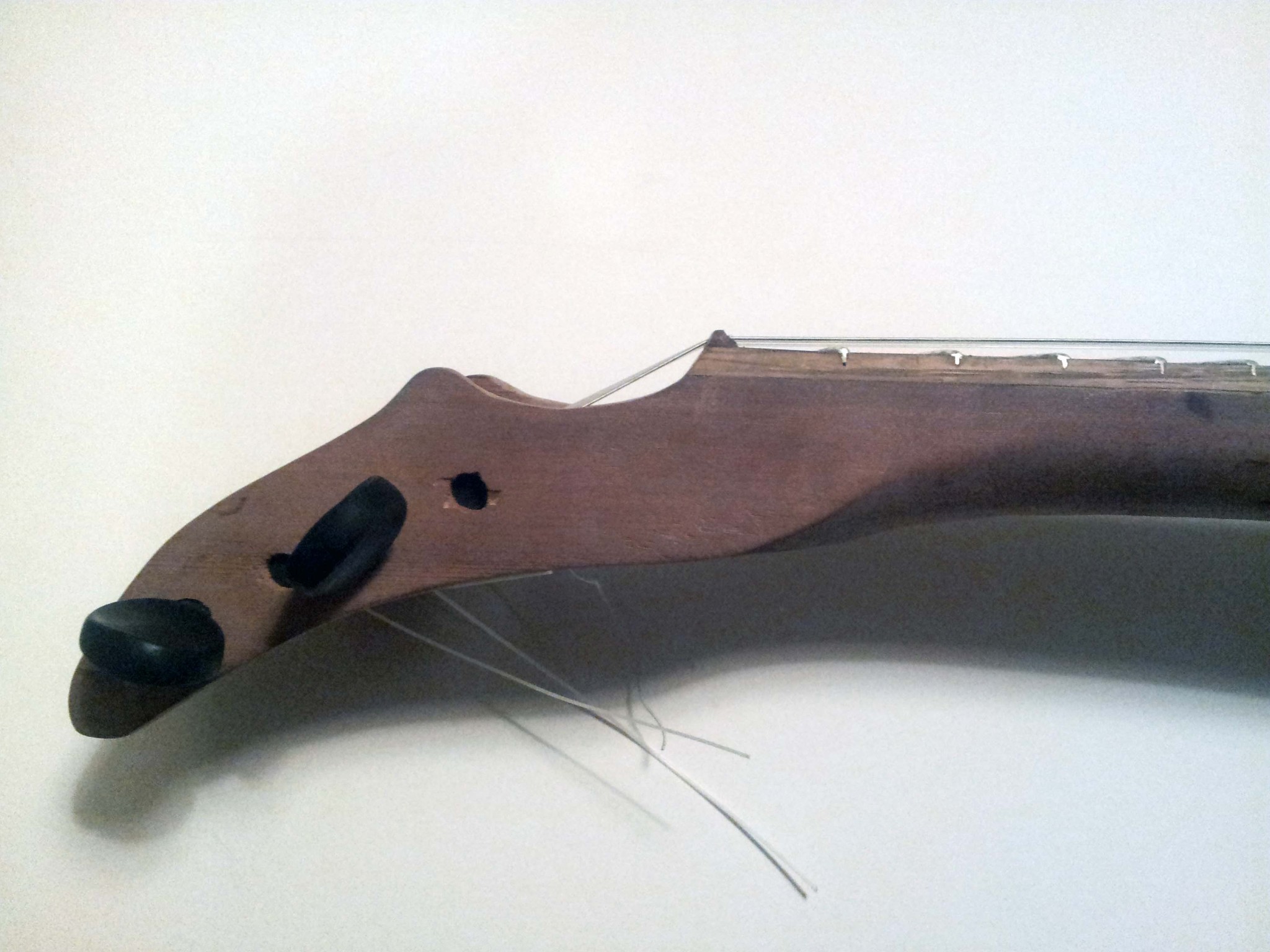 My original bridge design held all the tension of the strings. After a few hours of being strung, I noticed the glue on one side pulling up from the soundboard. I cut away most of the bridge, and drilled holes diagonally through the back of the instrument and the soundboard for the strings to feed through.