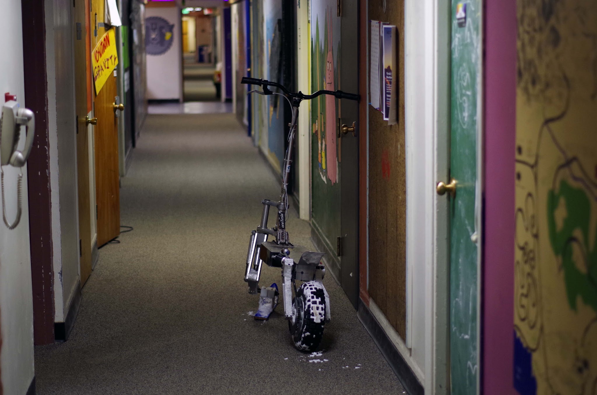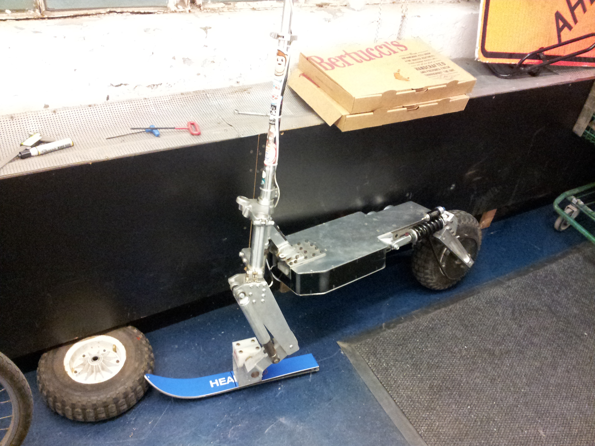 In the hours after MEETERS at MITERS, Dane and I came up with a ski attachment for our scooters, for the purpose of snowy scooter shenanigans. Both our scooters have the same axle diameter, so switching it from scooter to scooter just takes adding a few shaft collars for spacing.