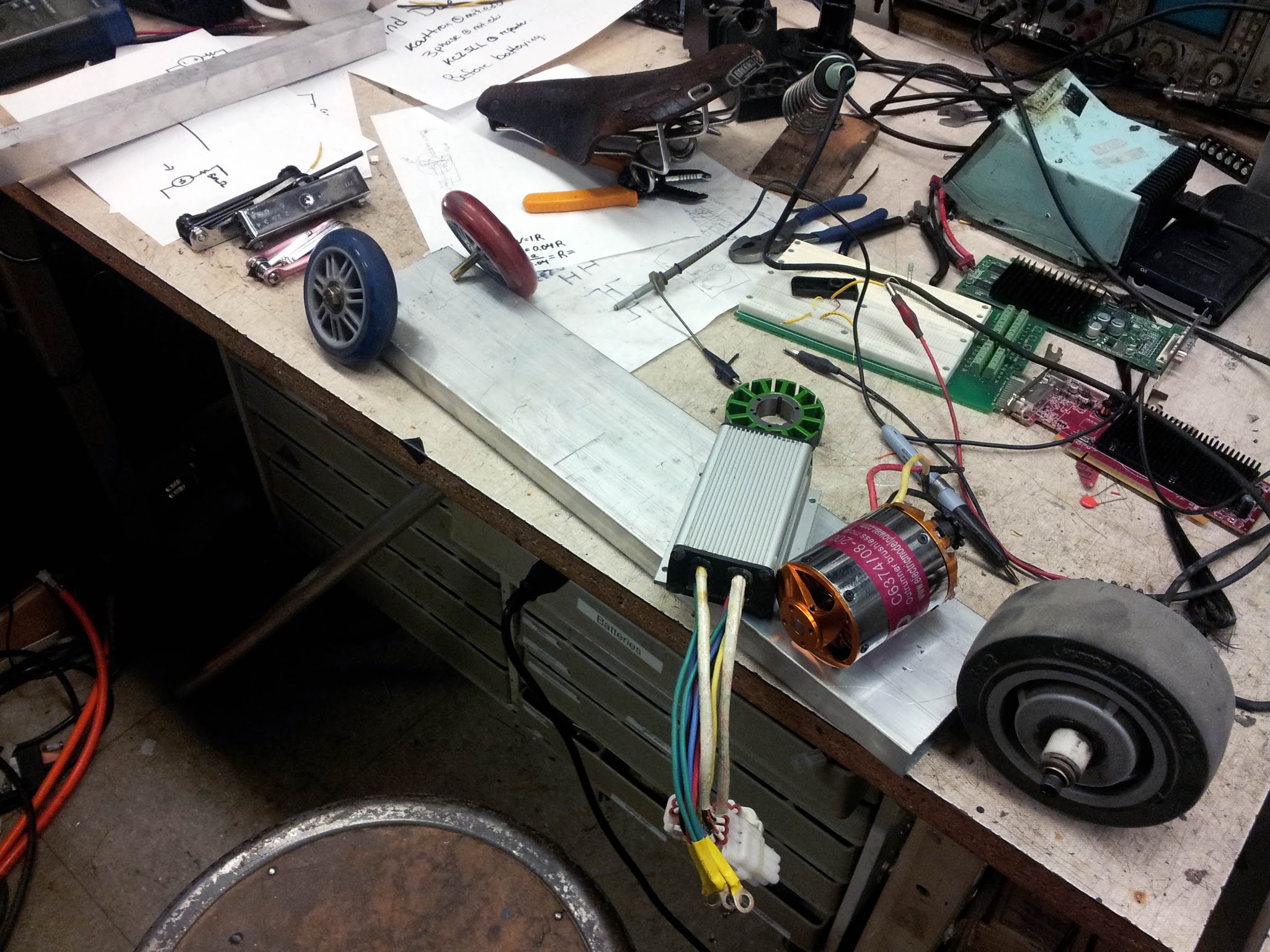 At around 12:00 am Saturday we had a pile of kart-parts. There's a pair of large scooter wheels, some 1.25" square aluminum tubing, some 1" x 4" rectangular aluminum extrusion, a Kelly KBS24121 controller, an EMP 63-200 motor (essentially identical in construction but a bit smaller than the trike motor), a big Colson Performa wheel, and a very old Brooks saddle.