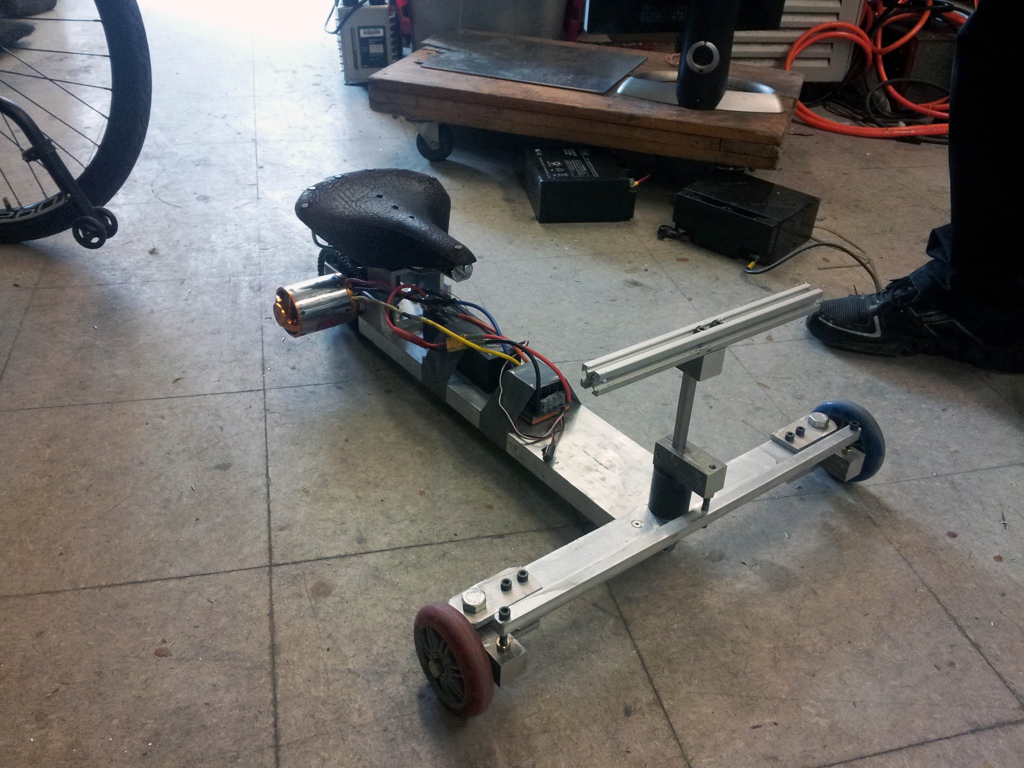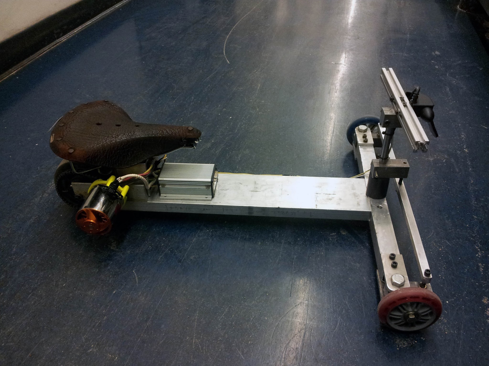 All the parts were scavenged from around MITERS. The motor, controller and saddle were mine, one scooter wheel came from an abandoned kick scooter, one came from Jaguar, the Colson came from the carcass of Straight Razer, and all the metal stock was scrap.