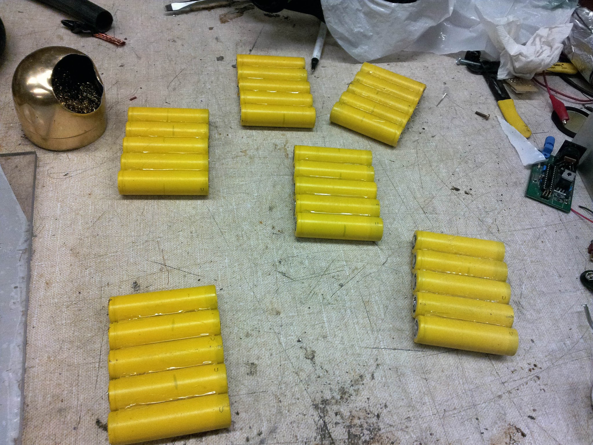 I started off by gluing together sets of 5 cells in parallel. These were soldered together with a strip of copper braid across each end.