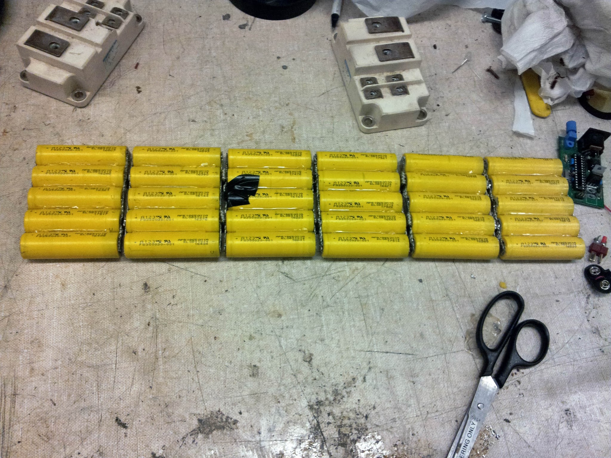 For batteries, we finished off a box of A123 18650 cells. Five of them fit side by side in the inside of the rectangular aluminum extrusion. We had enough cells for a 6S5P pack, which also happens to be the the most cells that could physically fit in the length of the extrusion.
