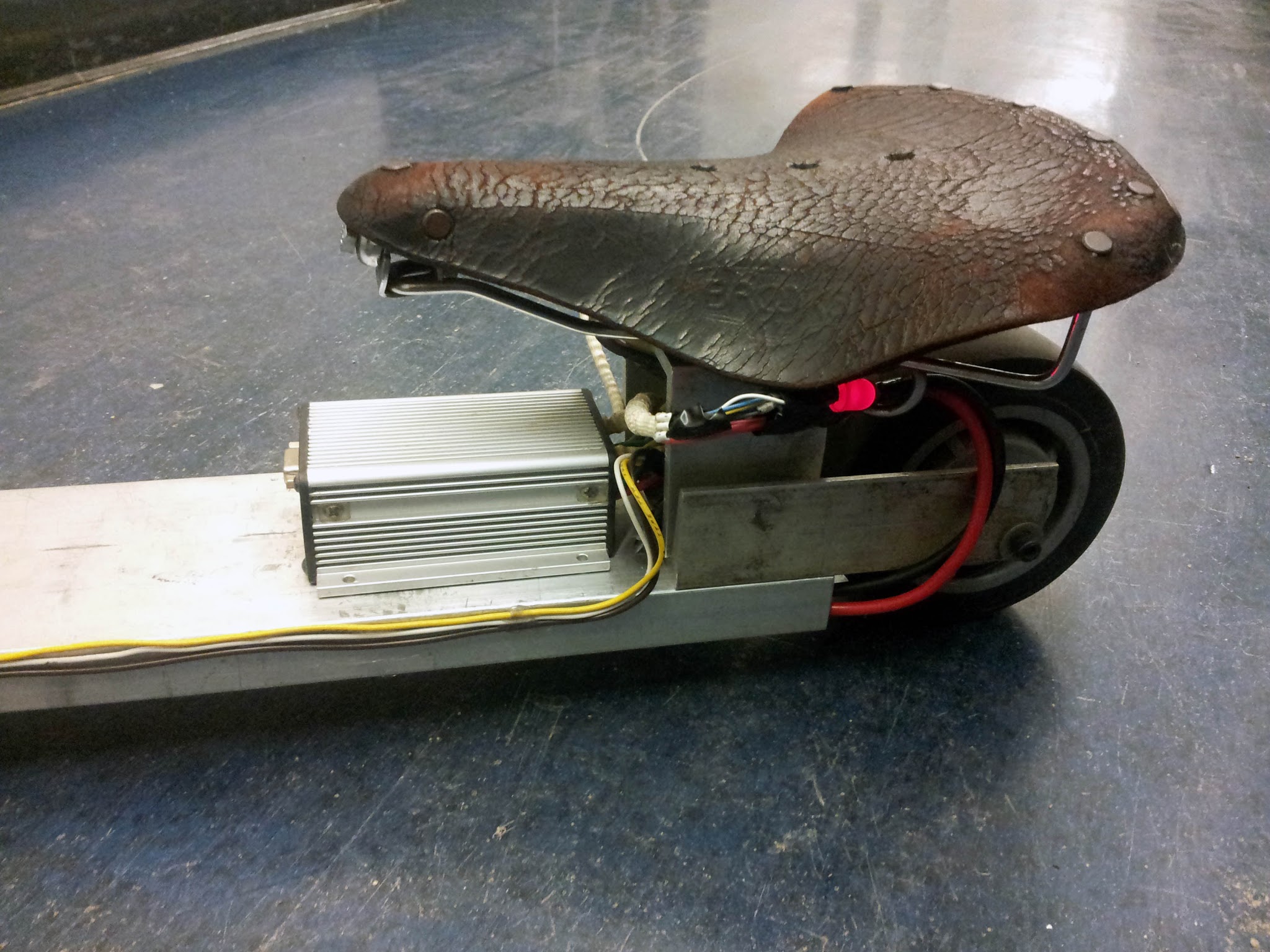 For a seat, we used an old Brooks saddle. It was clamped to a segment of 3" square tubing, which was fastened to the frame through the same holes as the motor and wheel bracket.