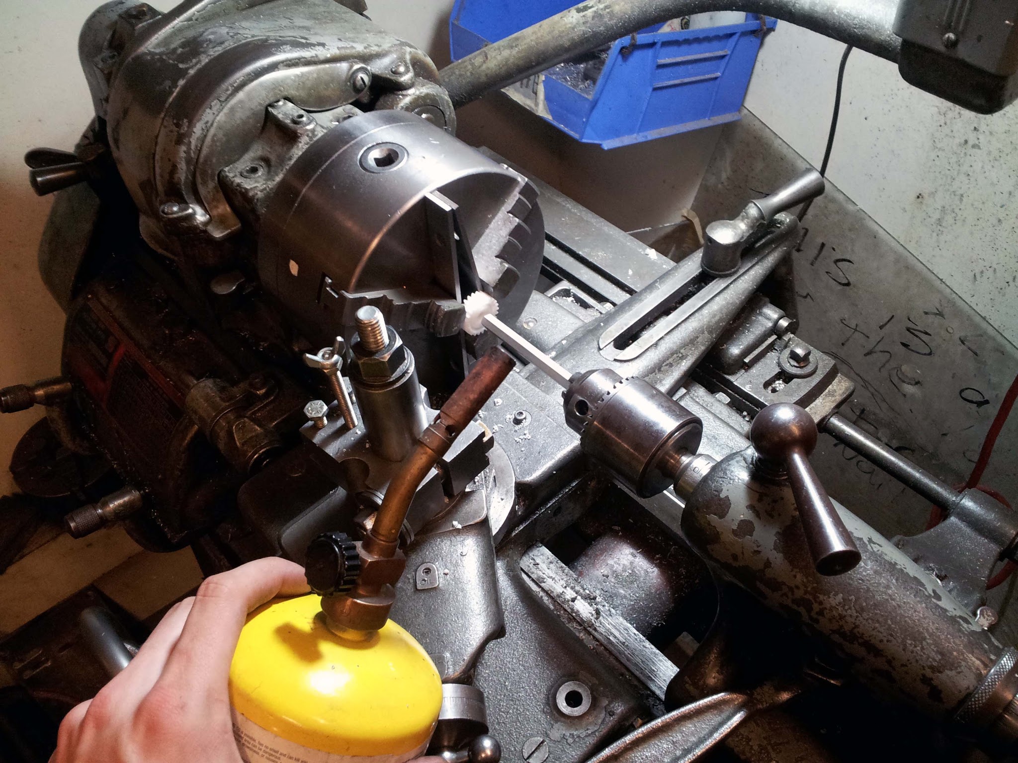 In actually building this thing I took a few tricks from AndyMark (who also make gearboxes combining mis-matched motors). Namely, torque is transmitted through hex shafts everywhere. To make hex bores in all the gears I could have used the fancy broach in MIT's Pappalardo Lab, but they are only open during "real person hours" (7:30 pm to 5:00 pm, or something like that), so as usual I opted to build everything at MITERS. So my method for making for making the hex bores was infinitely sketchier than using a broach. I first chucked the nylon gears into the lathe, and chucked a piece of aluminum hex shaft into the tailstock. Then I whipped out a propane torch: