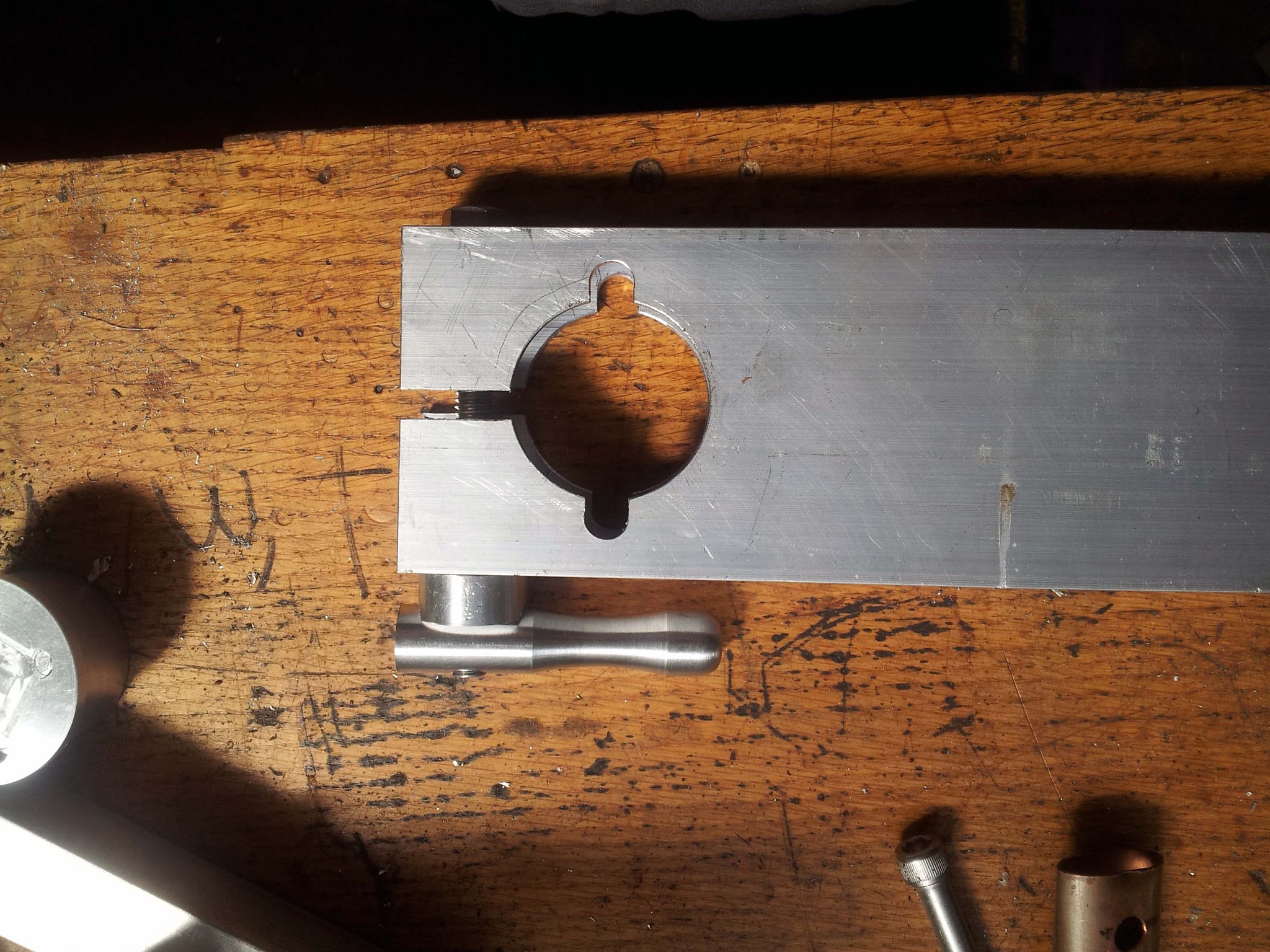 The top half of the lift got even more ridiculous. The lift's supporting tower was made from a foot of 3"x1" hollow aluminum extrusion. I made a big clamping mechanism through the top of it. I got into a shiny knob making phase for this and a few other random projects, so I made another shiny handle to adjust the clamp.