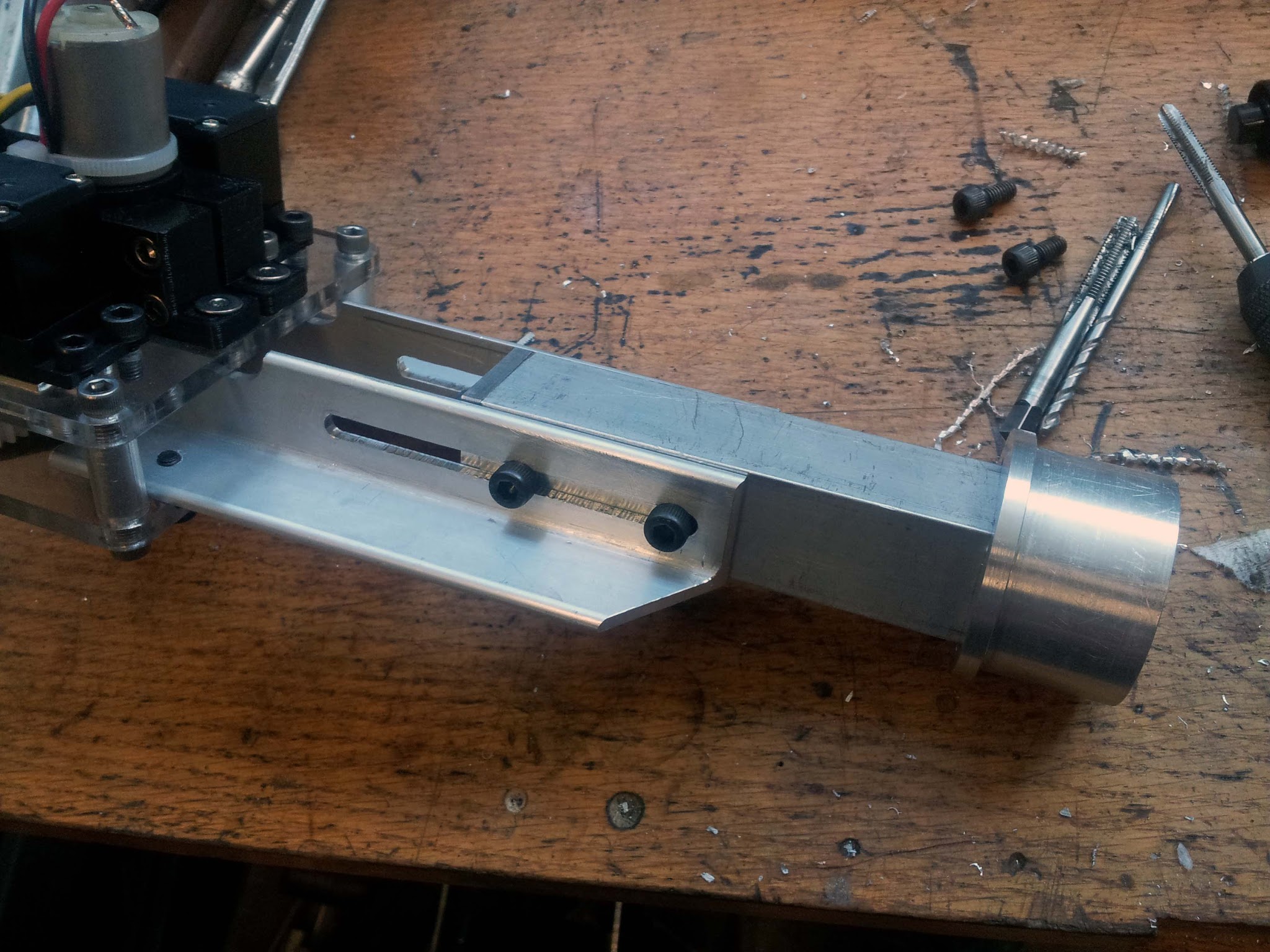 This piece fits into the clamping mechanism. It holds a 1" square piece of aluminum tubing, with a threaded rod through the center.