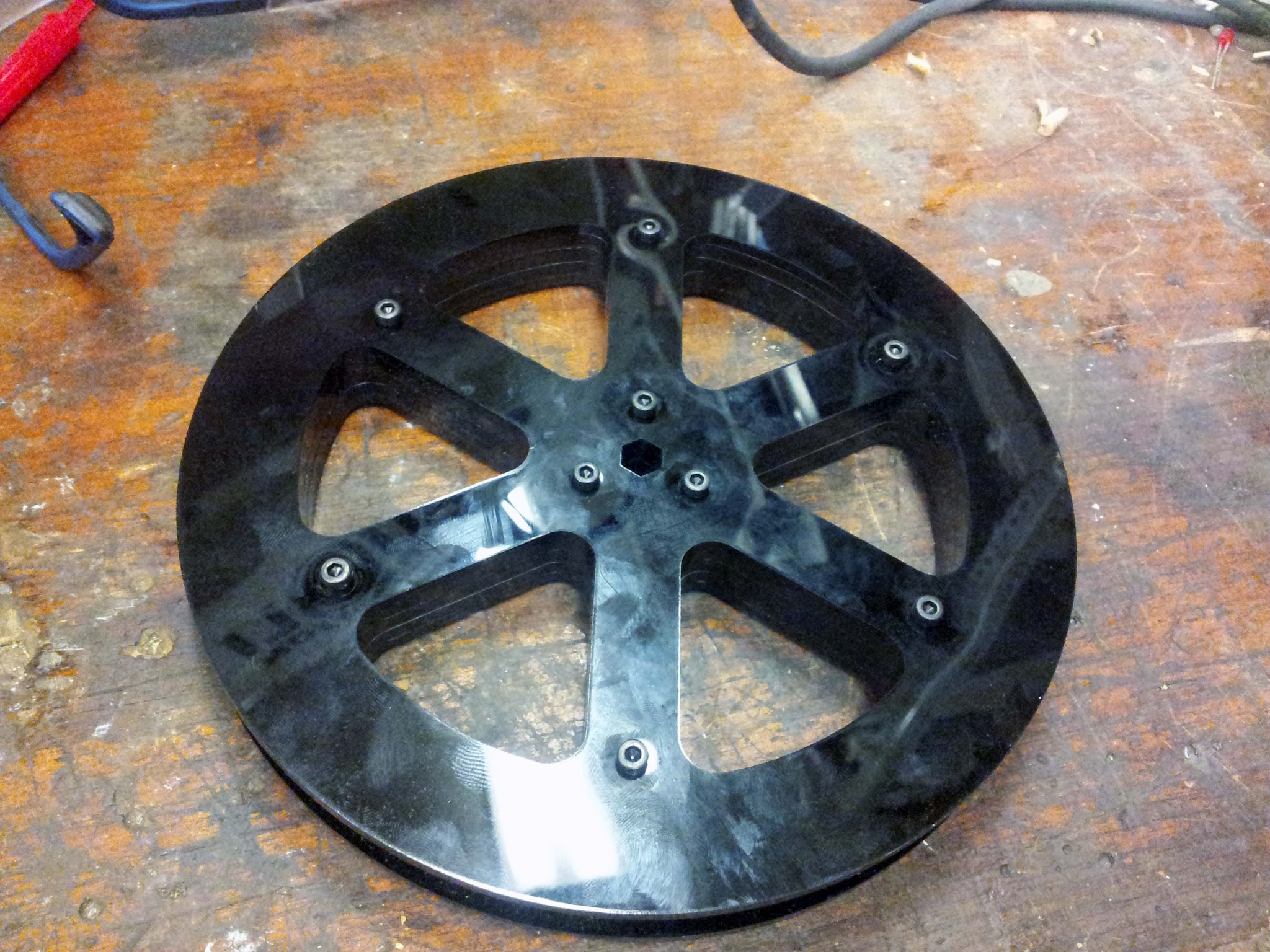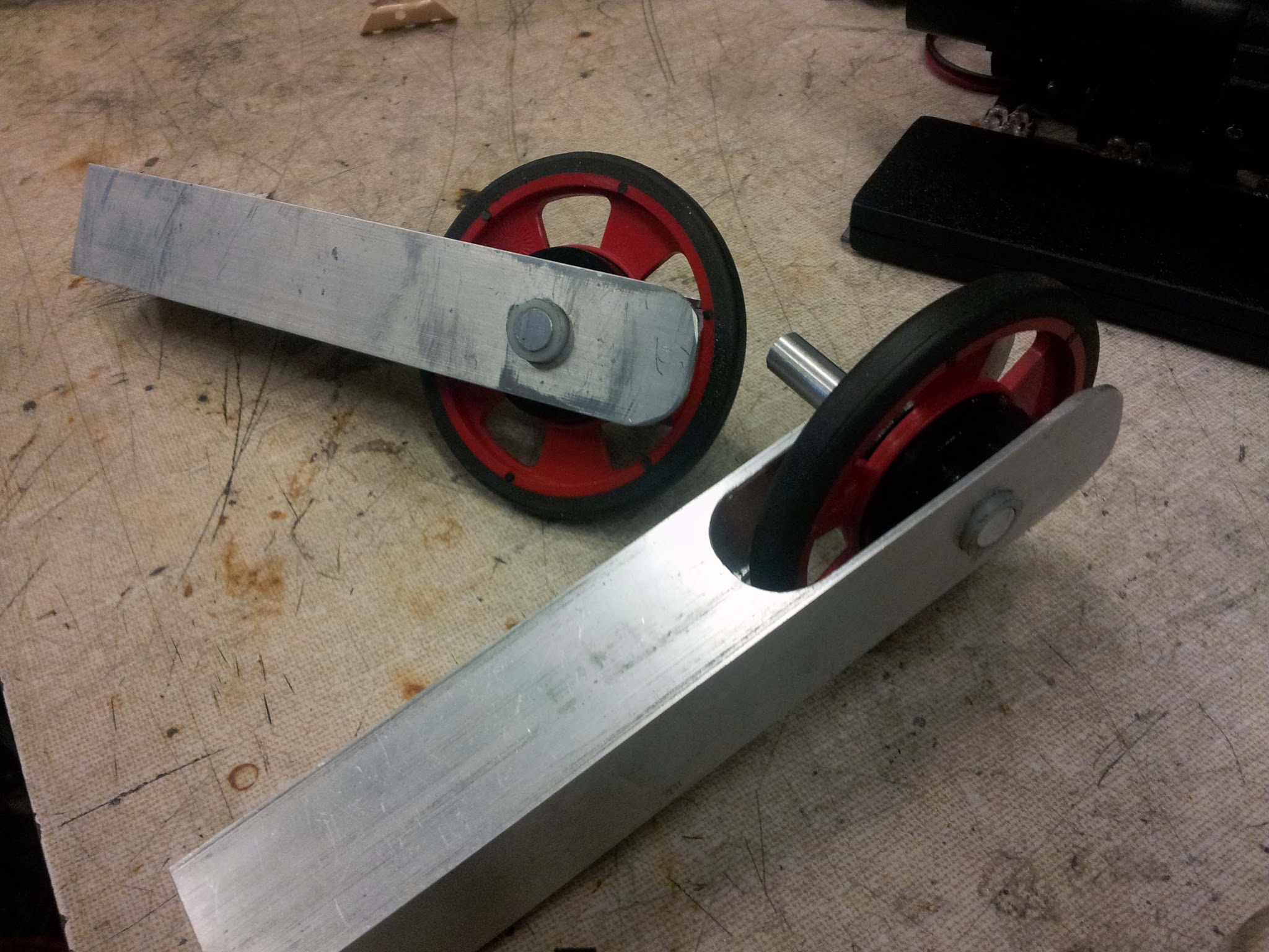 Wheel assemblies. The servo wheels are bolted to laser cut hex-bored hubs, and have aluminum hex axles which pass through nylon bushings in the aluminum frame.