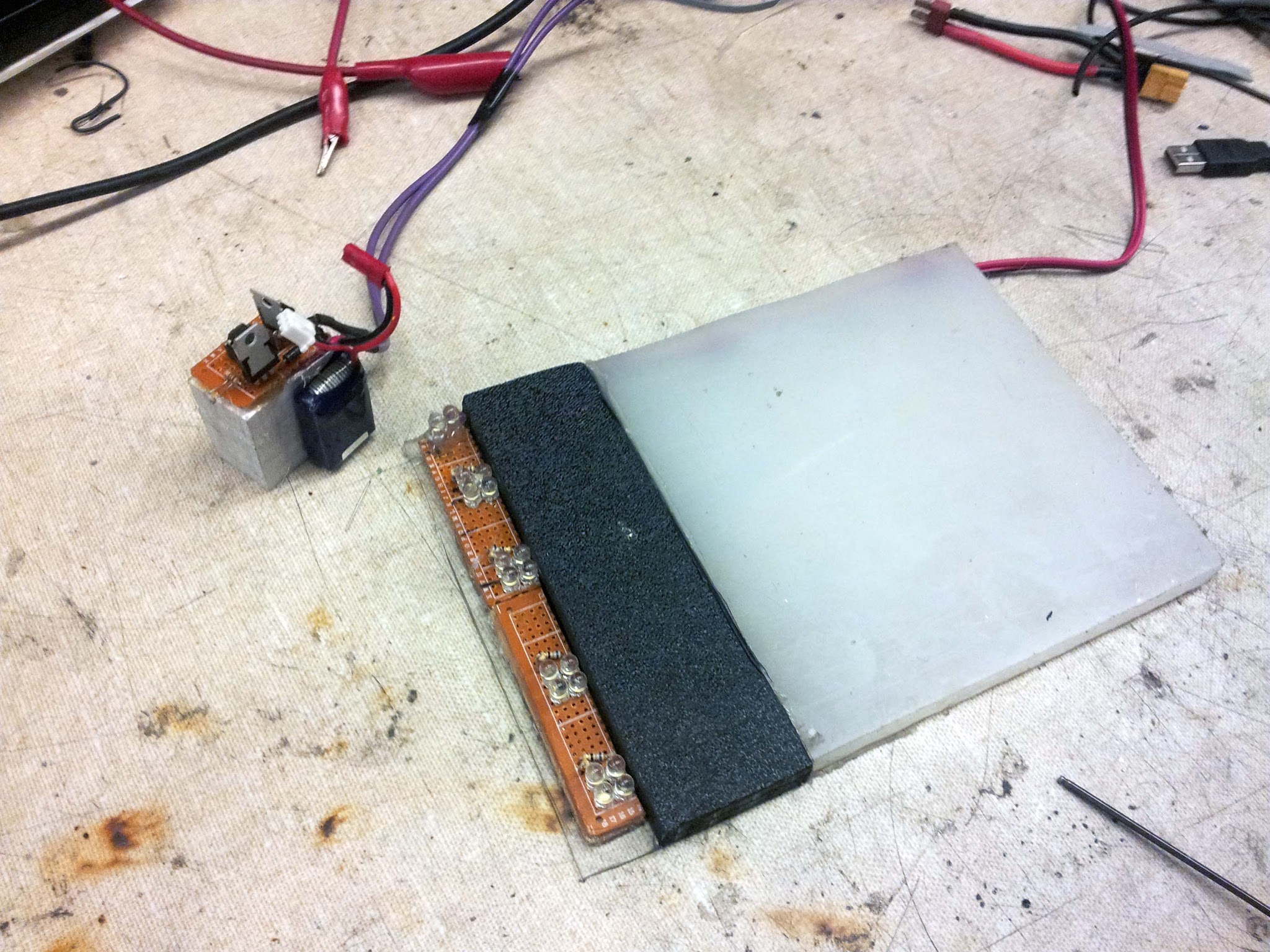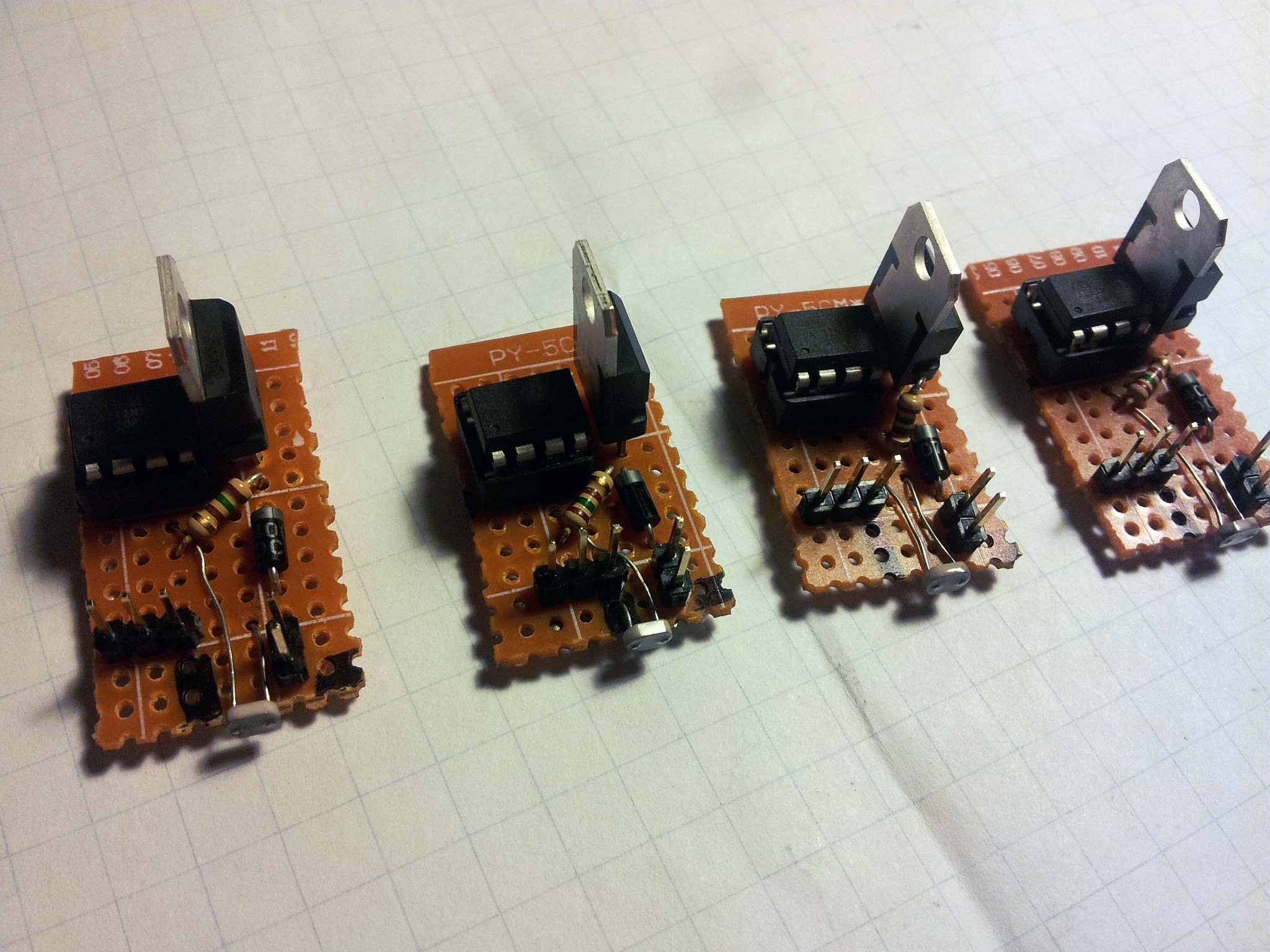 Here are the controllers for the mini-robots. Each has an ATTiny85, a 7805 voltage regulator, a photo resistor for sensing the start signal, and a diode to prevent me from exploding everything by plugging the battery in backwards. Hat tip to Charles's 2.007 experience for encouraging me to add the reverse protection diode. It definitely saved these boards on multiple occasions.