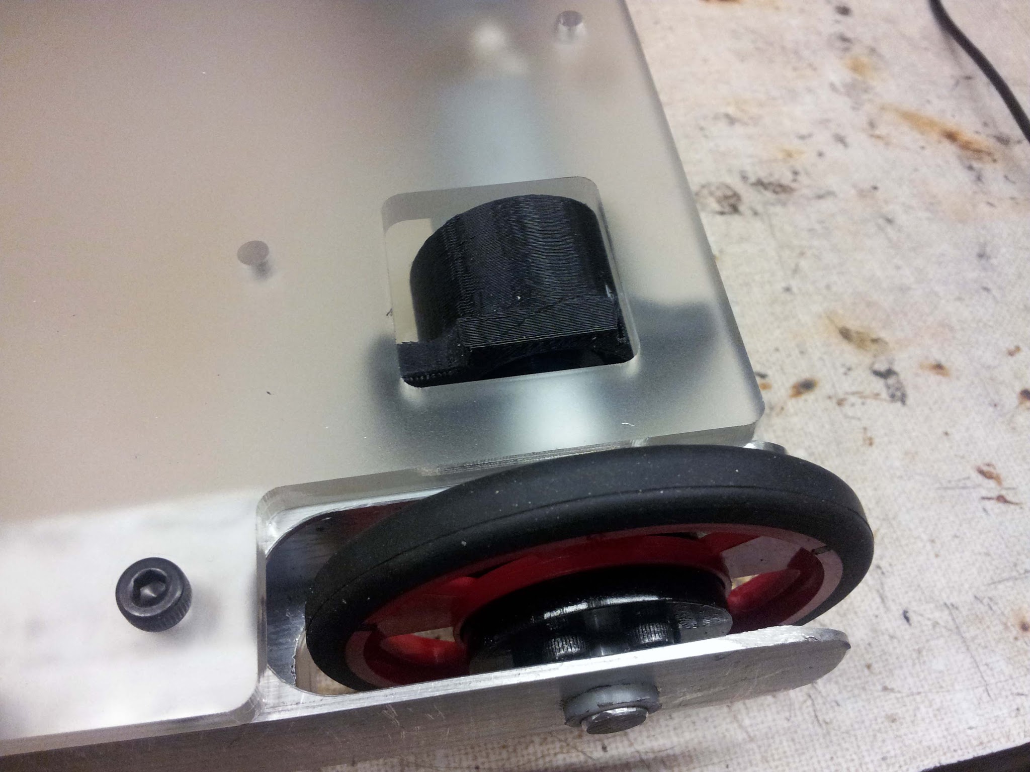 I printed some motor mounts which I later had to machine down because I designed them to be too thick. If you look carefully here, you can see that the motors are not actually bolted to anything. When I turned the axles, I didn't have quite the right bit size for the motor shafts, so the axles ended up being slightly non-concentric with the motors. To stop the motors and shafts from being overconstrained and binding, I "floated" the motors. They can't rotate, but are somewhat free to jiggle around as the wheels turn.