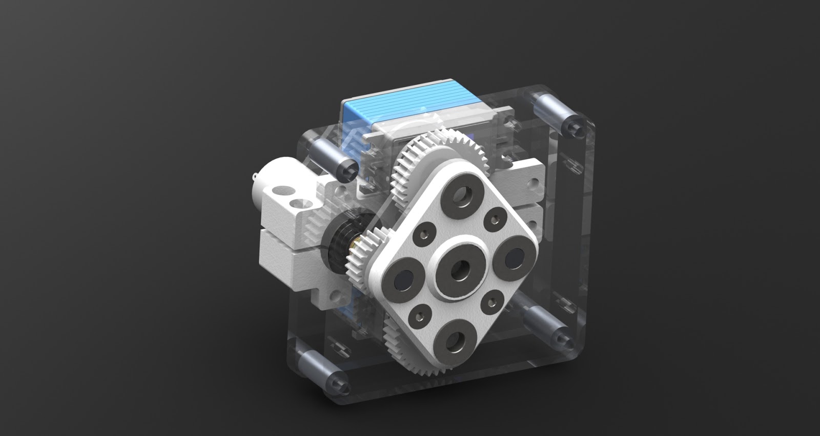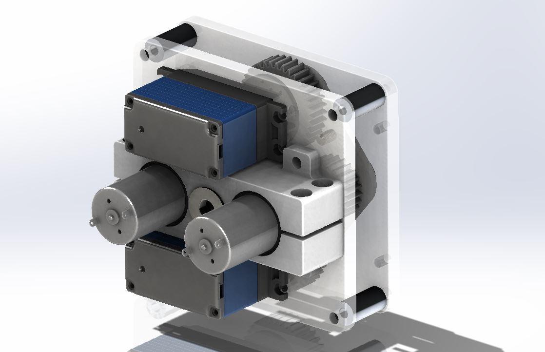 On to the ski lift. First thing I did for the the lift was design and build a giant 4-motor gearbox to combine all the motors I had left to use after building the mini-bots. This consisted of 2 of the BO-P6 motors and 2 Vigor VS-10 servos. In all its ray-traced glory, it looks like this: