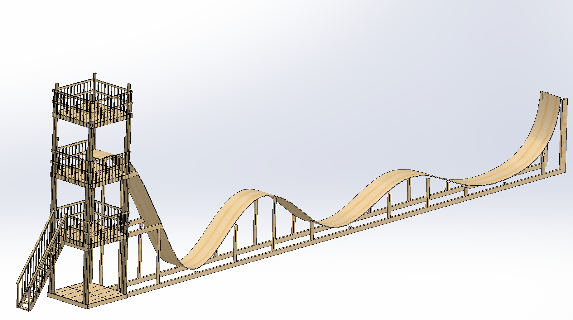 The actual track surface was designed to be bent from three overlapping layers of 3/8" thick plywood. The layers of plywood are easy to bend one at a time, but when three layers are sandwiched together the resulting surface is very stiff. The plywood overhangs the frame supporting it by 6" on each side. The cart that rolls down the roller coaster had wheels underneath the overhang, to make it impossible for the cart to fly off the track.