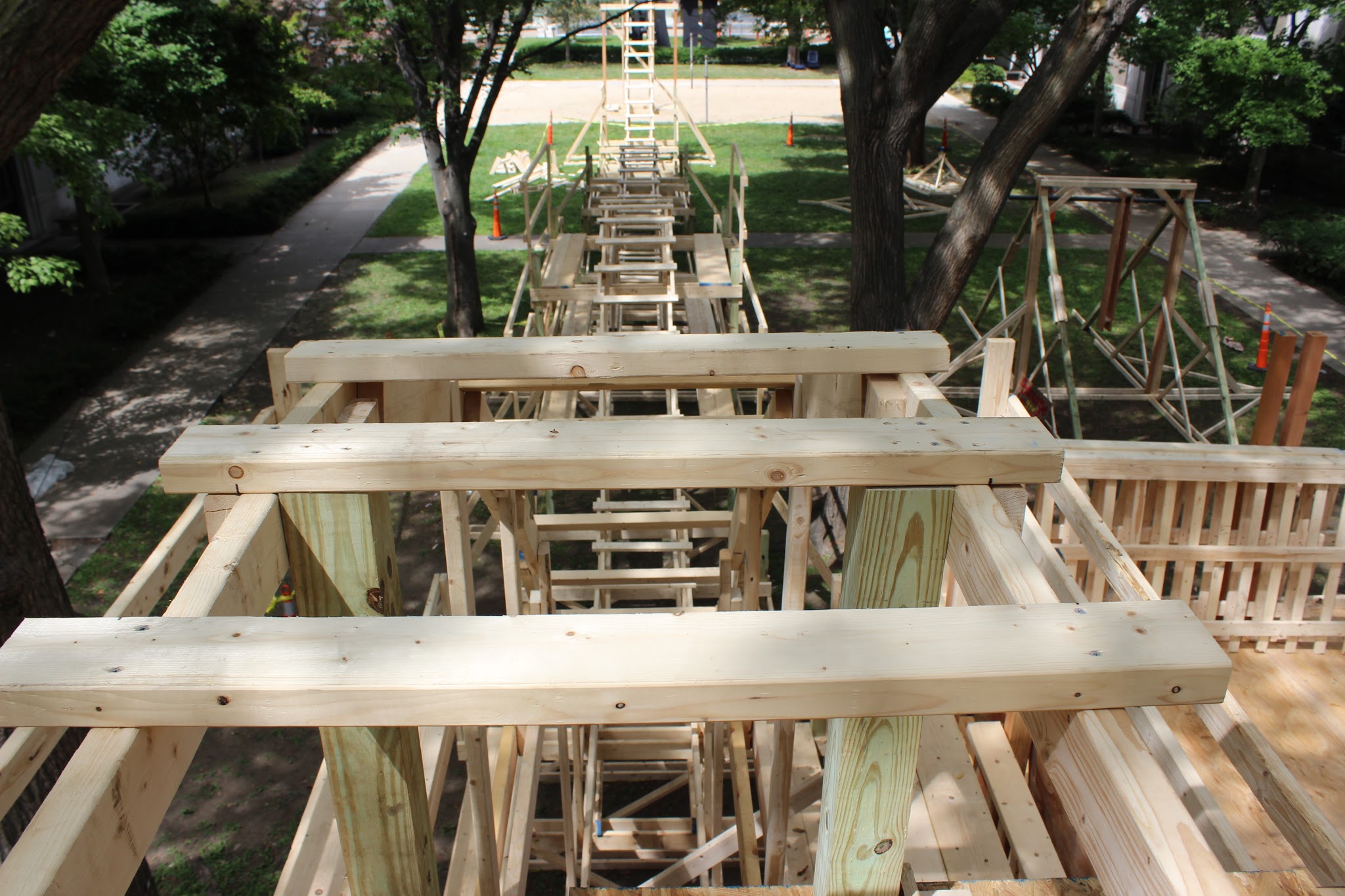 They also asked us to make some kind of absurd changes to the roller coaster's tower. In the original design, we spec'ed 5/8" bolts to hold the spandrels supporting each floor to the posts of the tower. Citing some wood-loading vs bolt size chart, they asked us to make all our spandrel-supporting bolts 1" in diameter. Early East Campus wooden structures used 1/2" threaded rod as bolts. My freshman year, they used 5/8" bolts. The year after that, the (different) structural engineering firm that review their design asked them to use 3/4" bolts on the fort. This year: 1". At this rate, there won't be any wood left in the structures in a few years.