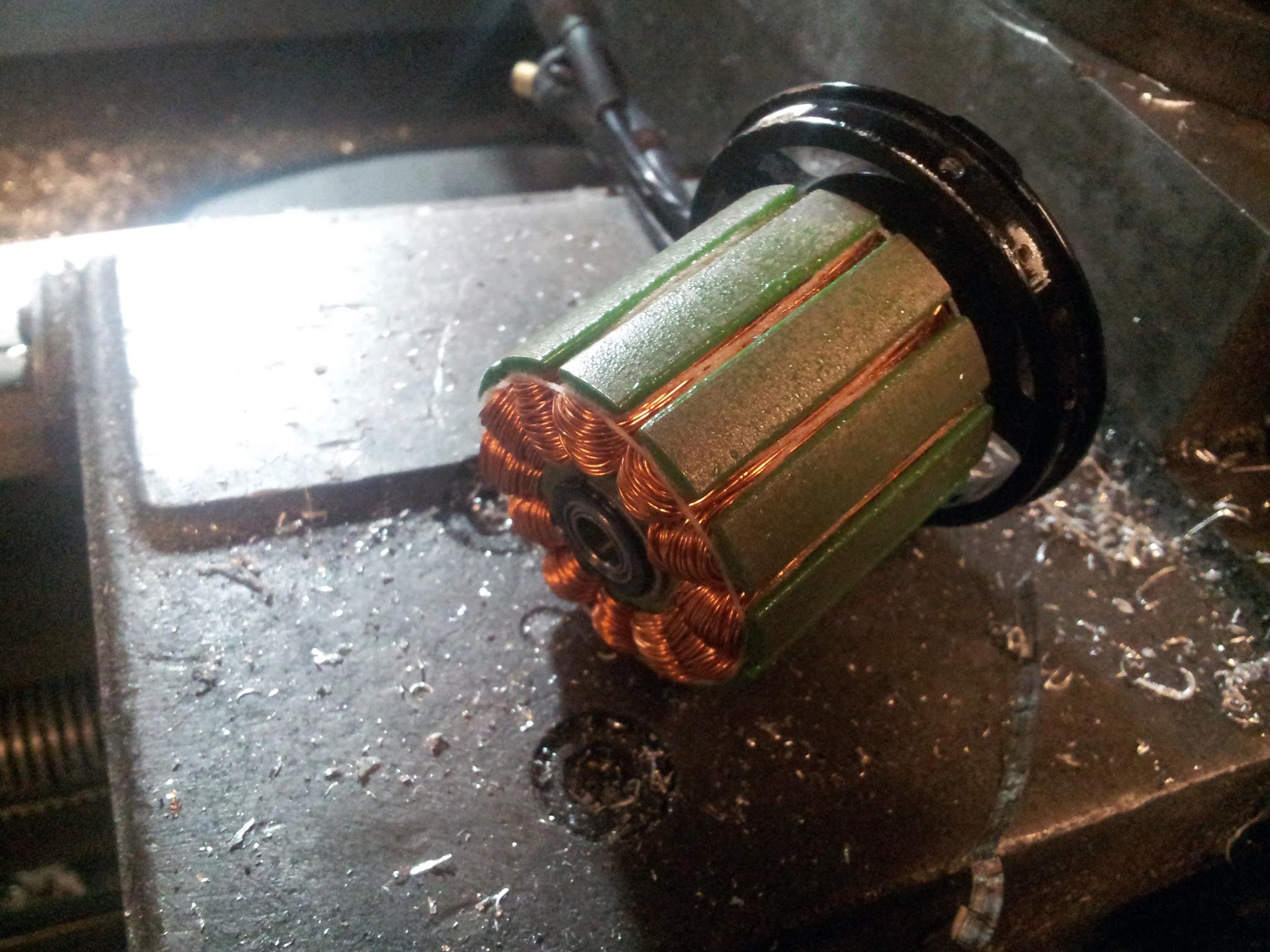 Here's the stator. Nice and densely wound, and it even has string holding the windings in! Slightly above a hobbyking-grade stator.
