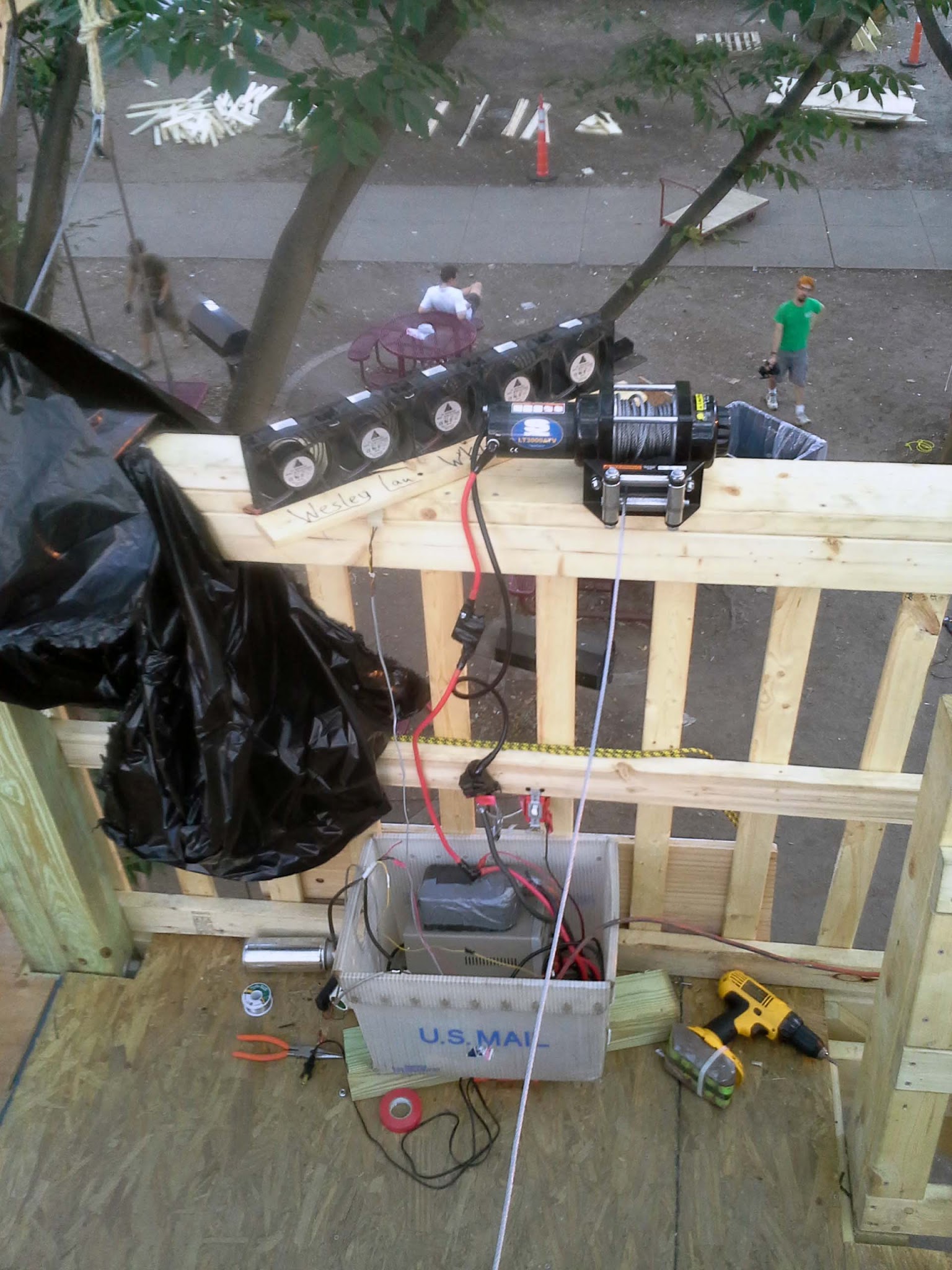 Actually running the ride started out pretty inefficient. A crew of 4 or 5 people would slowly walk the cart back to the bottom of the first hill, at which point we winched the cart to the start with an overvolted electric truck winch running off a big A123 battery pack, and cooled by a bank of server fans. The process took about 8-10 minutes per run. Later though, we improved the cart return process to use one strong person to get the cart back to the winch. By the end, the total ride and reset time was under 3 minutes. In total I'd estimate around 400 people were able to ride the roller coaster between Sunday night and Thursday afternoon, when we closed it down.