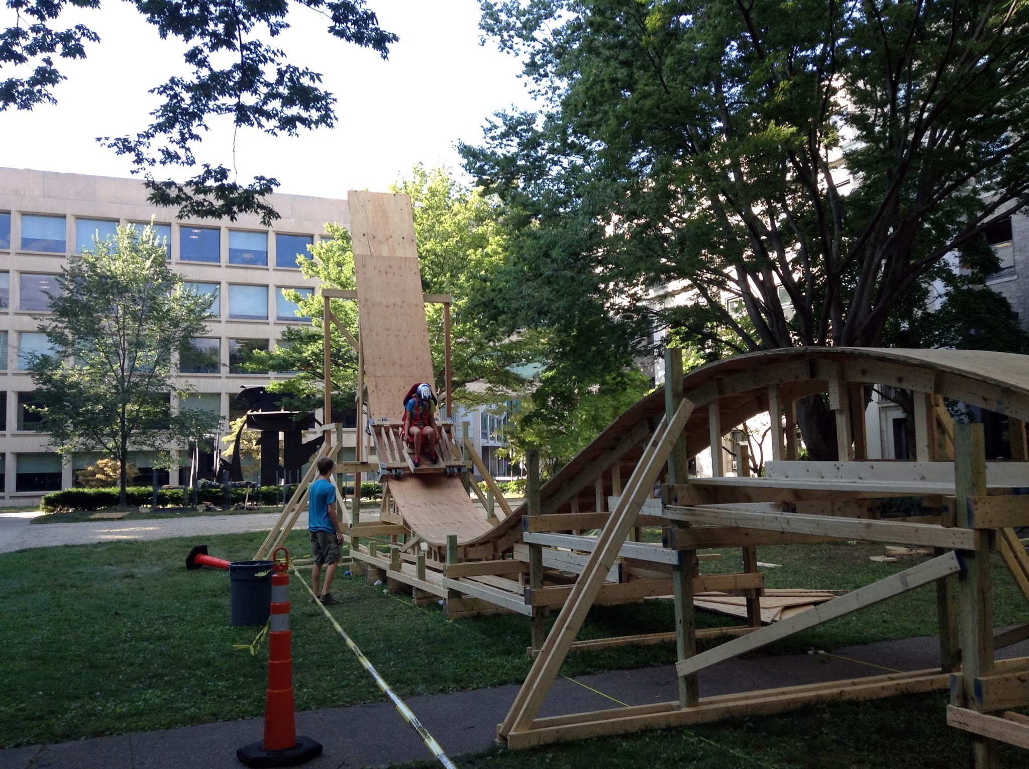 For the first day of operation, the cart faced forwards. We tried flipping it around the next day, and people seemed to prefer going down backwards, so the ride was left backwards for the remainder of the week.