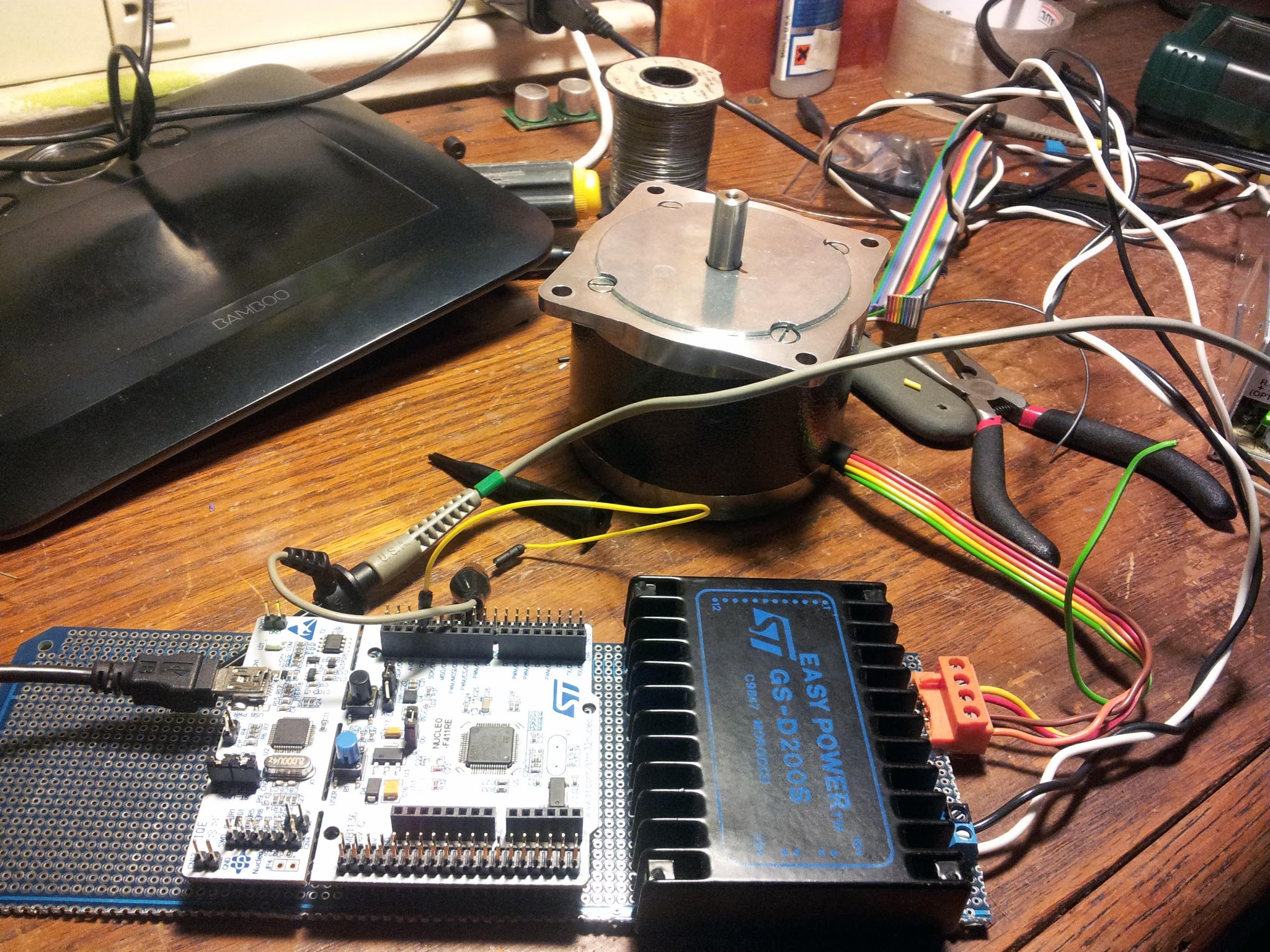 Here's the motor, microcontroller, and stepper driver. To start out, I used this Easy Power GSD200S, because some x-ray equipment MITERS crufted a couple months ago had a bunch of them. This driver could only do half-stepping, so everything was really noisy. When first testing out the machine, there was a noise complaint from someone living two floors above the desk. I later swapped this stepper driver out for something a bit nicer.
