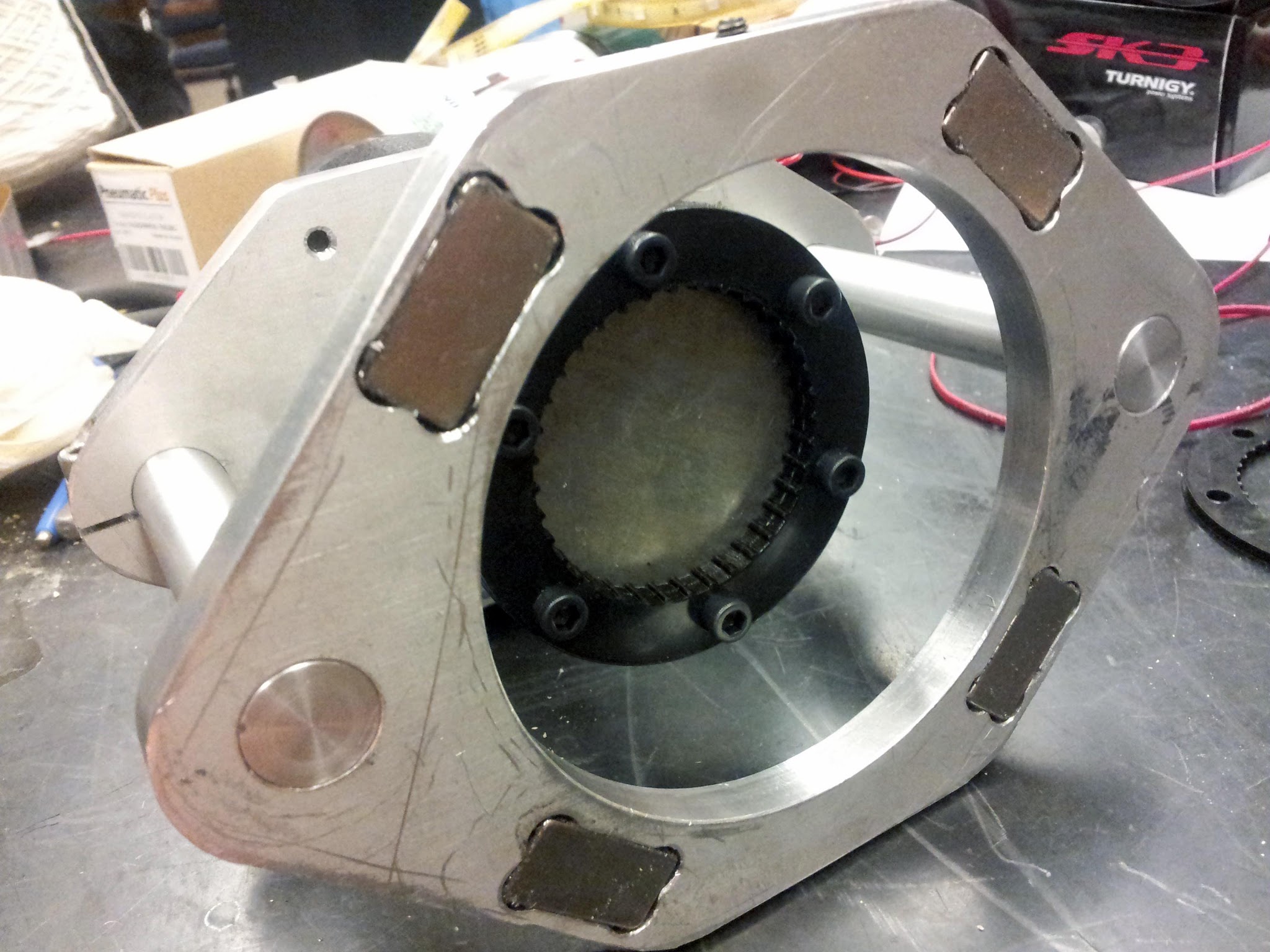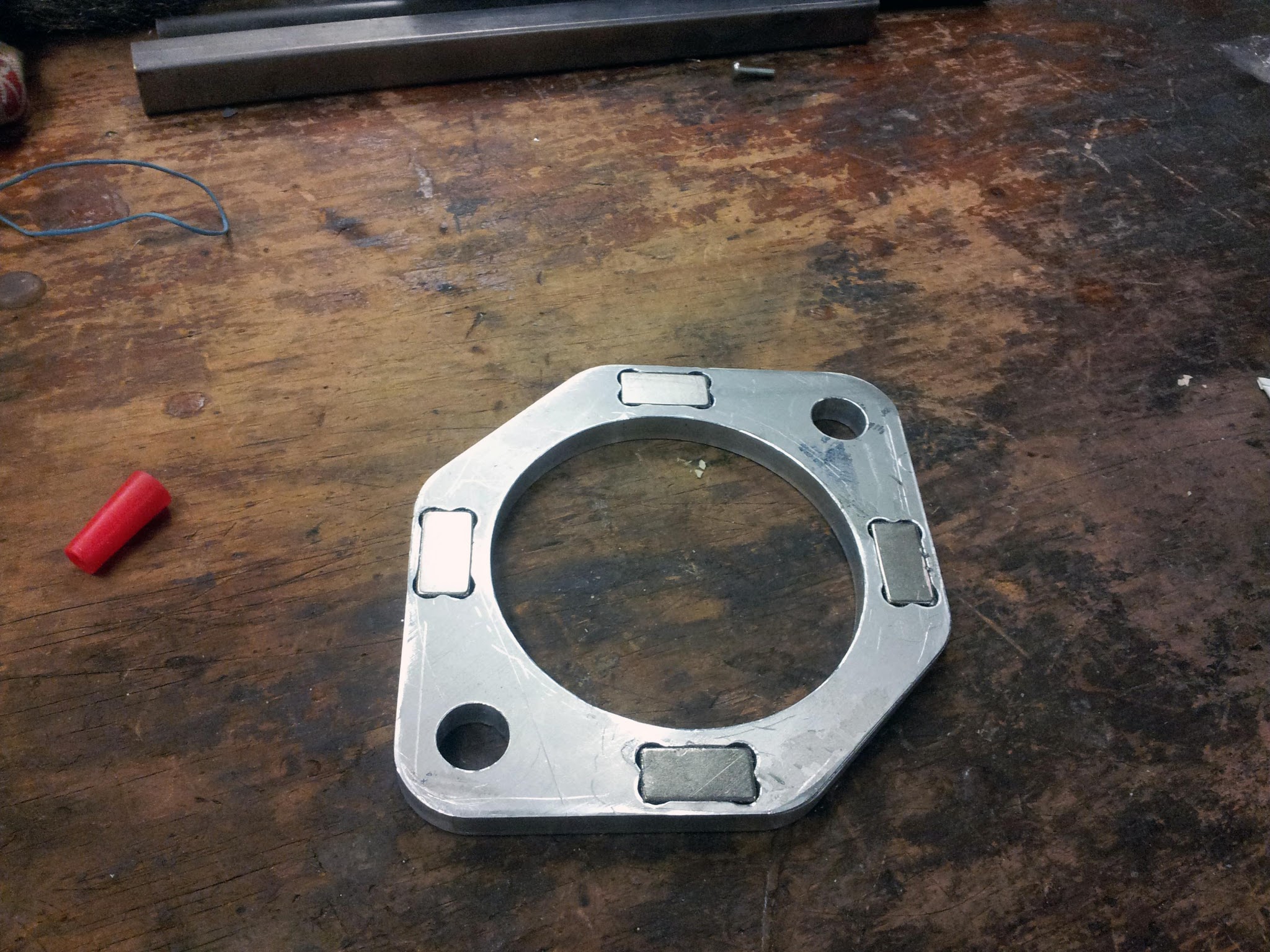 The front metal plate has four large neodymium magnets press-fit into it.