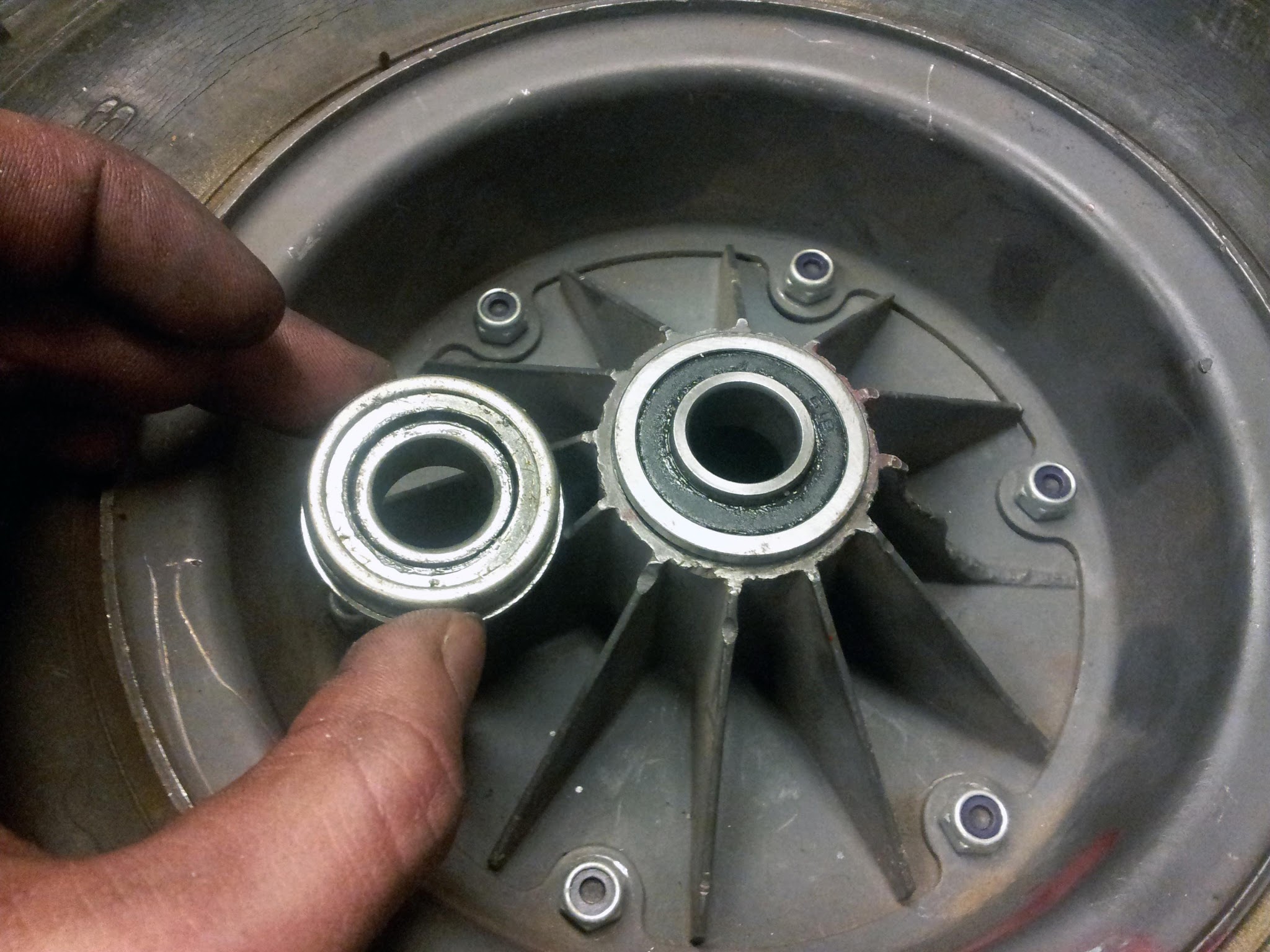 First quick fix, replacing the hand-truck bearings I never bothered upgrading with more legitimate bearings. The original bearings had deteriorated so much there was about 10 degrees of slop in the back wheel.