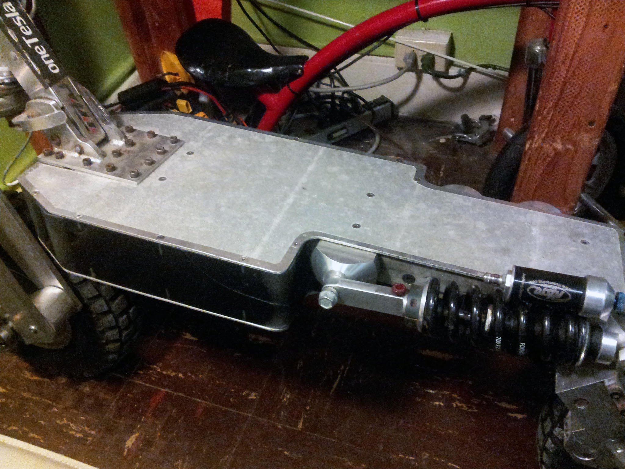 The Big Scooter (version 2) has existed for a year and a half now, and I've finally gotten around to doing some long needed updates to it. Most importantly, I originally did not build in a chain tensioning mechanism, because the chain length worked out pretty much perfectly. Chains stretch, though, so the chain started falling off, especially when plowing through snow. Since it's snow season again, it seemed prudent to fix this problem.