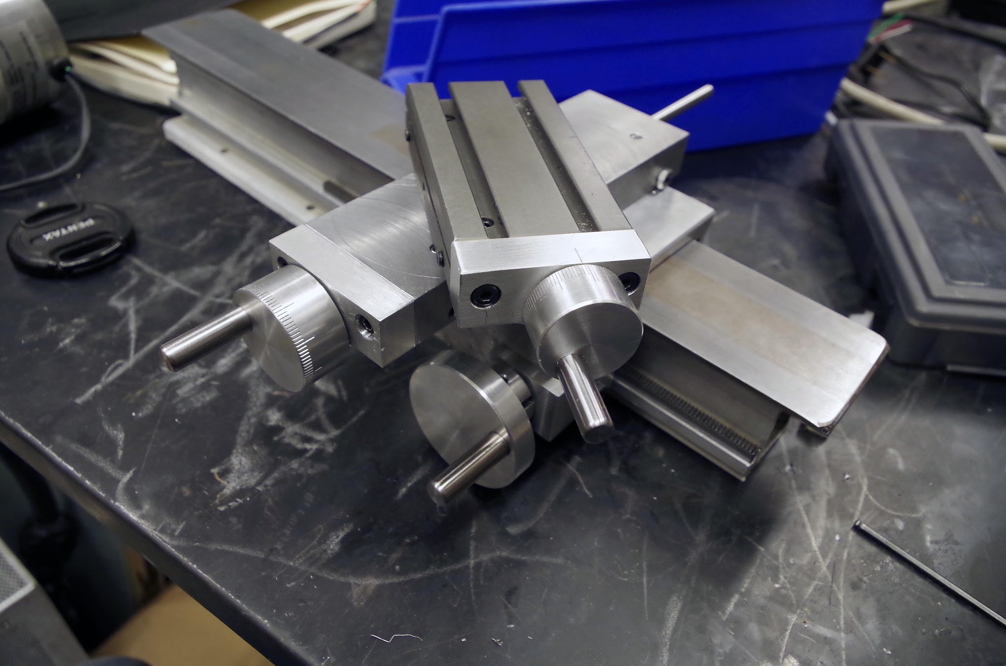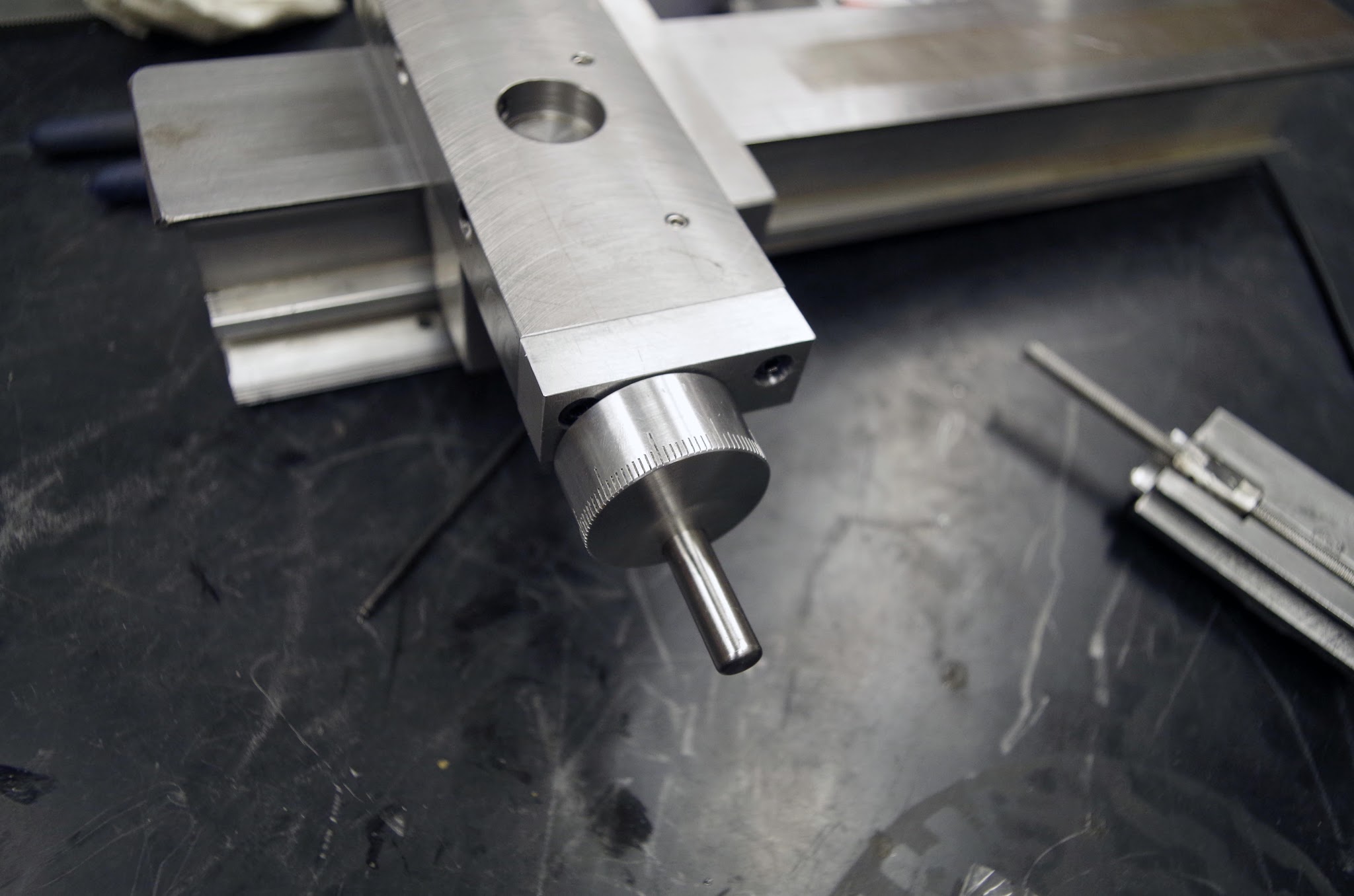 These were turned from aluminum round, and like before, had stainless steel handles press fit in. Each as 100 marks scribed around the perimeter, with every 10th mark longer. With a 1mm pitch ballscrew, this gives 20 microns on the diameter per tick mark.